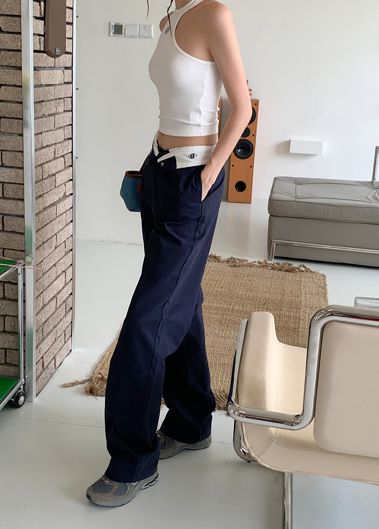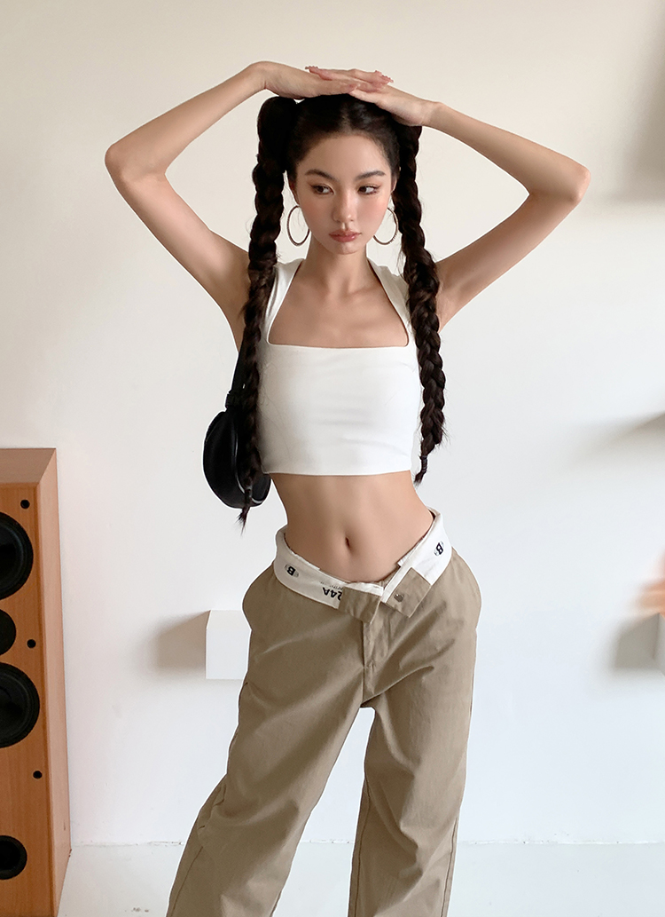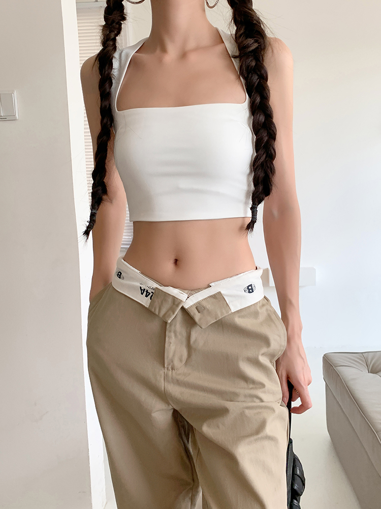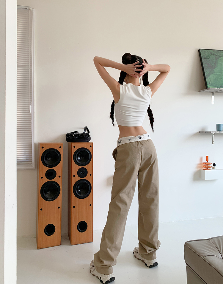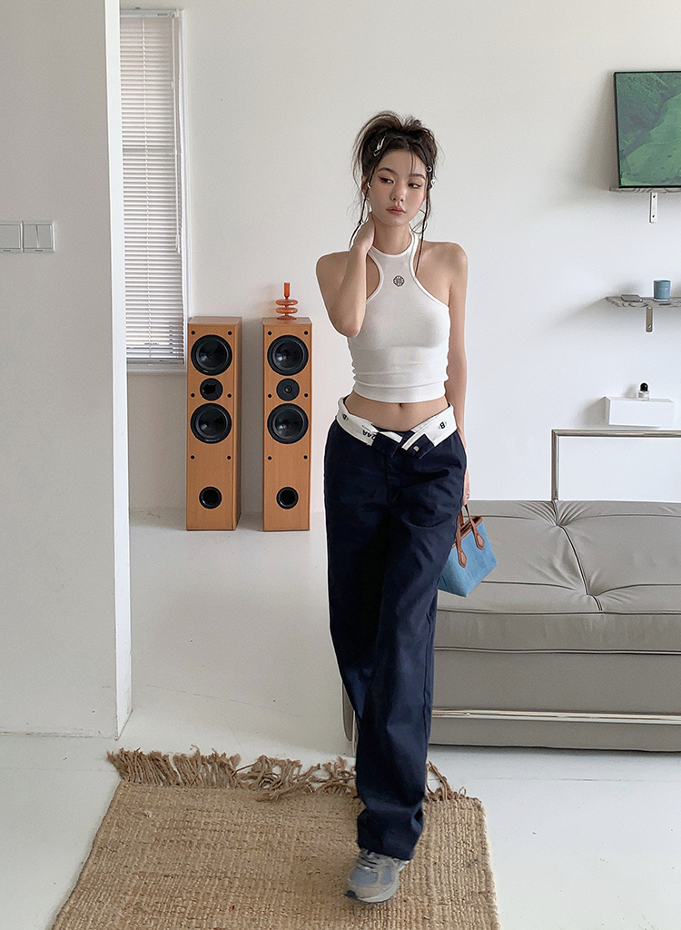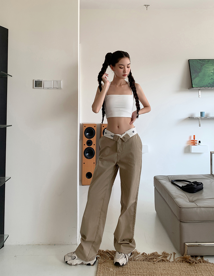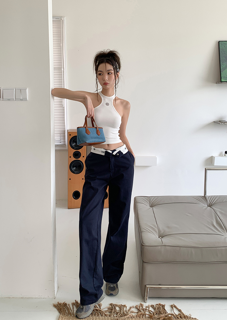 RM31517#春夏新款小众设计翻边腰部字母辣妹休闲直筒阔腿裤女春夏