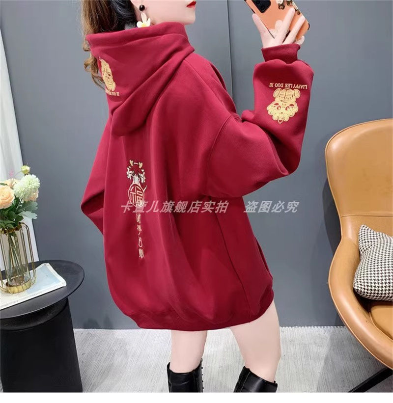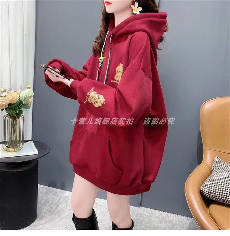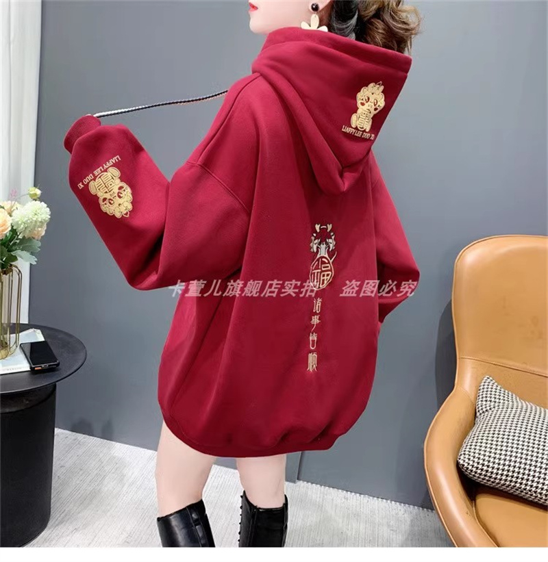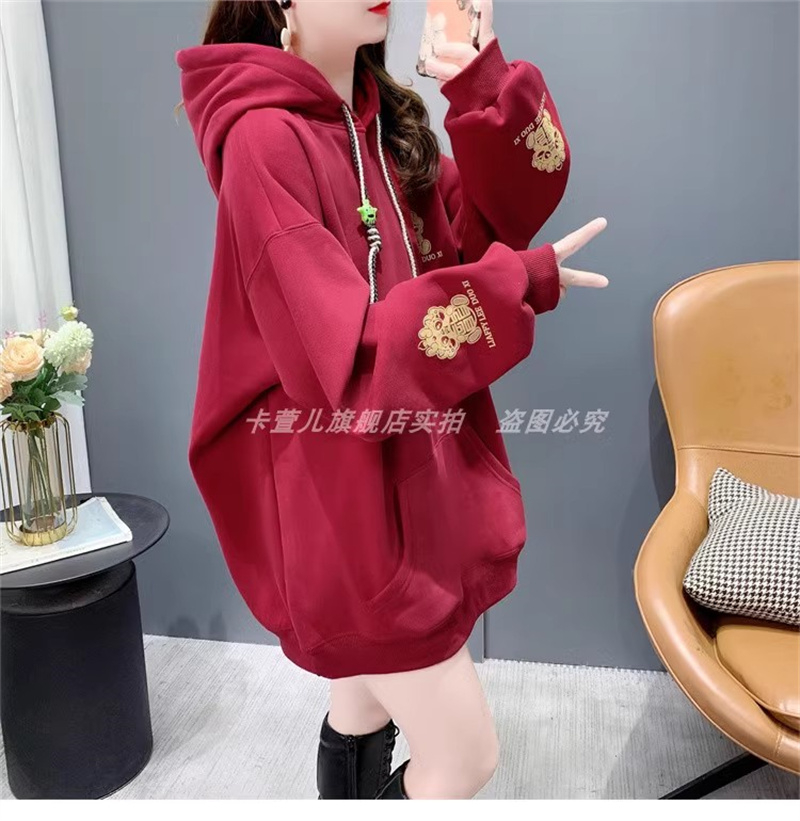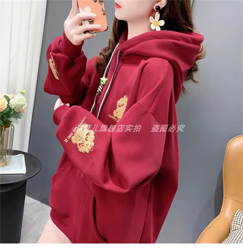 RM31525#纯棉华棉复合超柔新年红色加绒加厚连帽卫衣女慵懒风外套