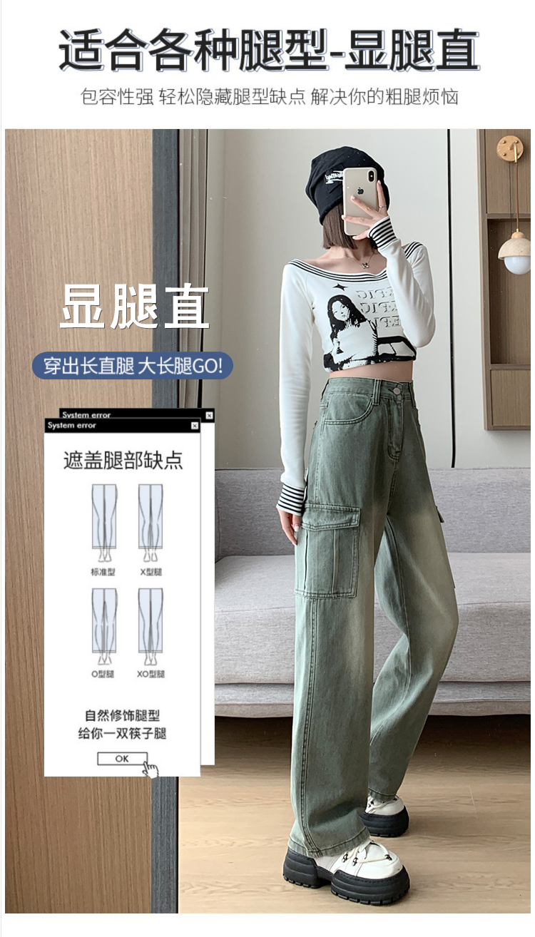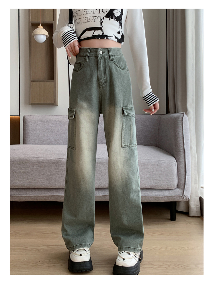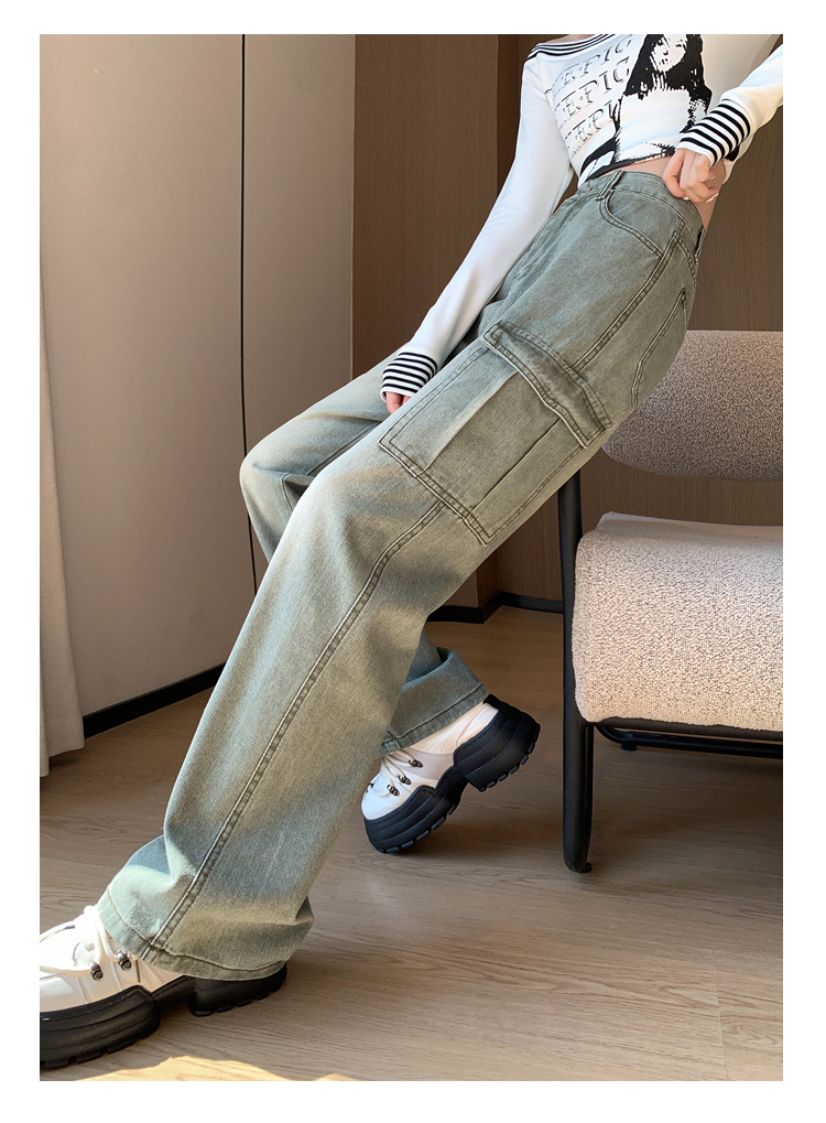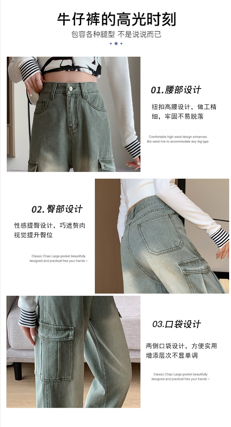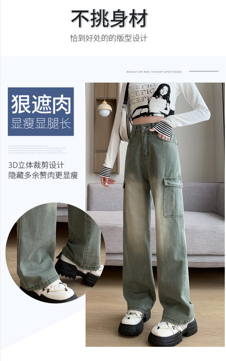 RM31561#怀旧美式工装裤女复古高街高腰显瘦休闲阔腿牛仔裤子潮