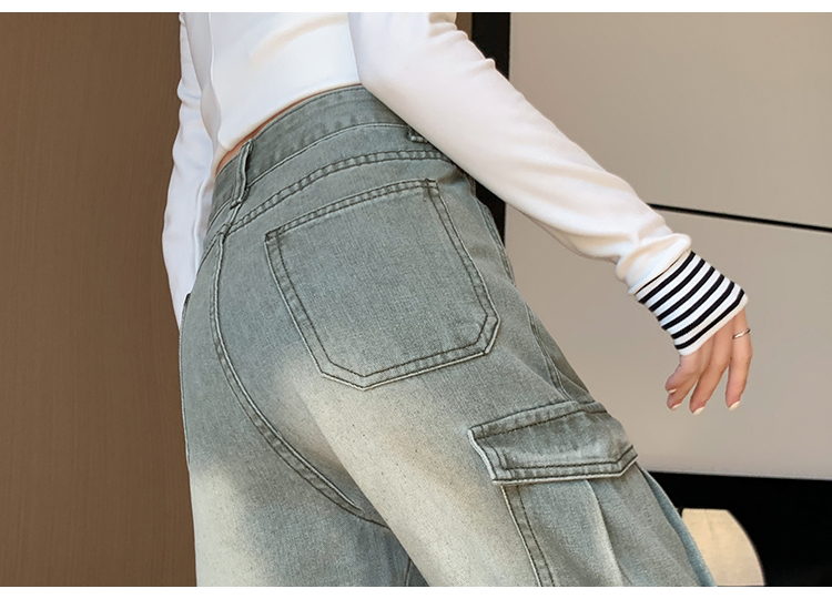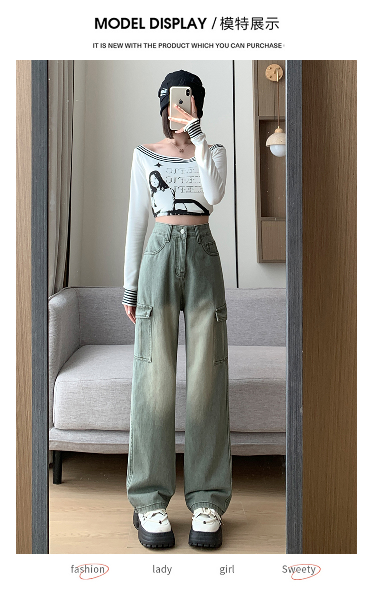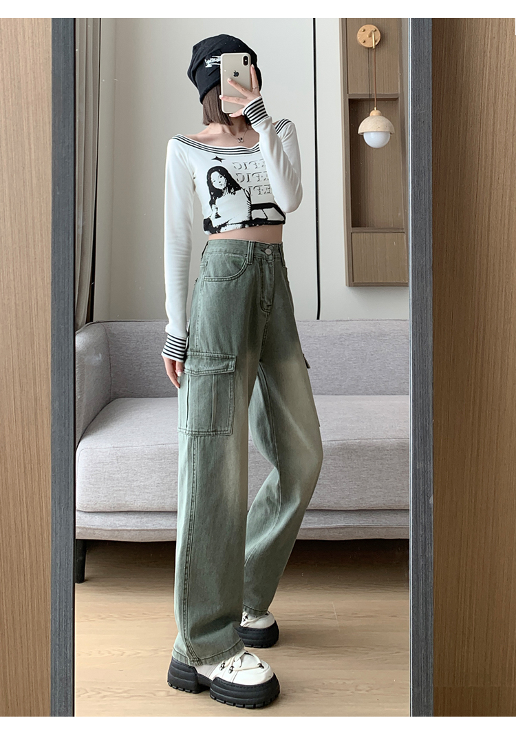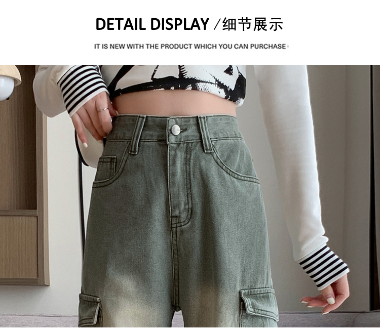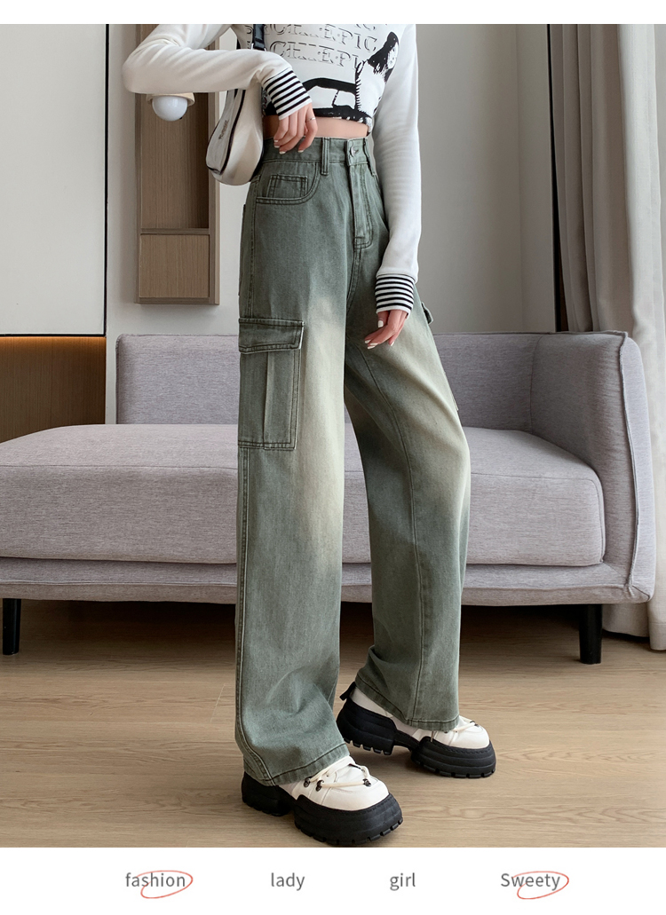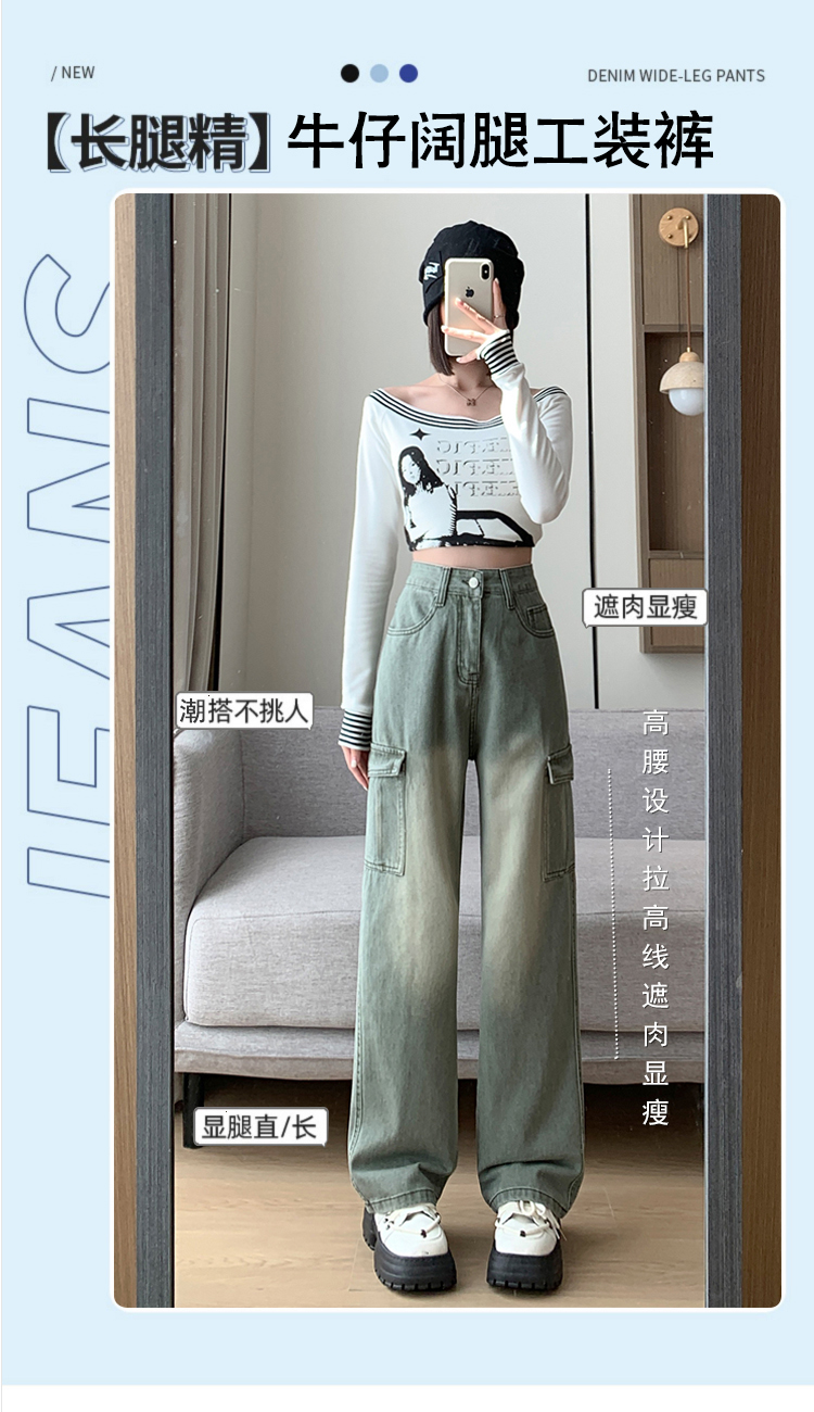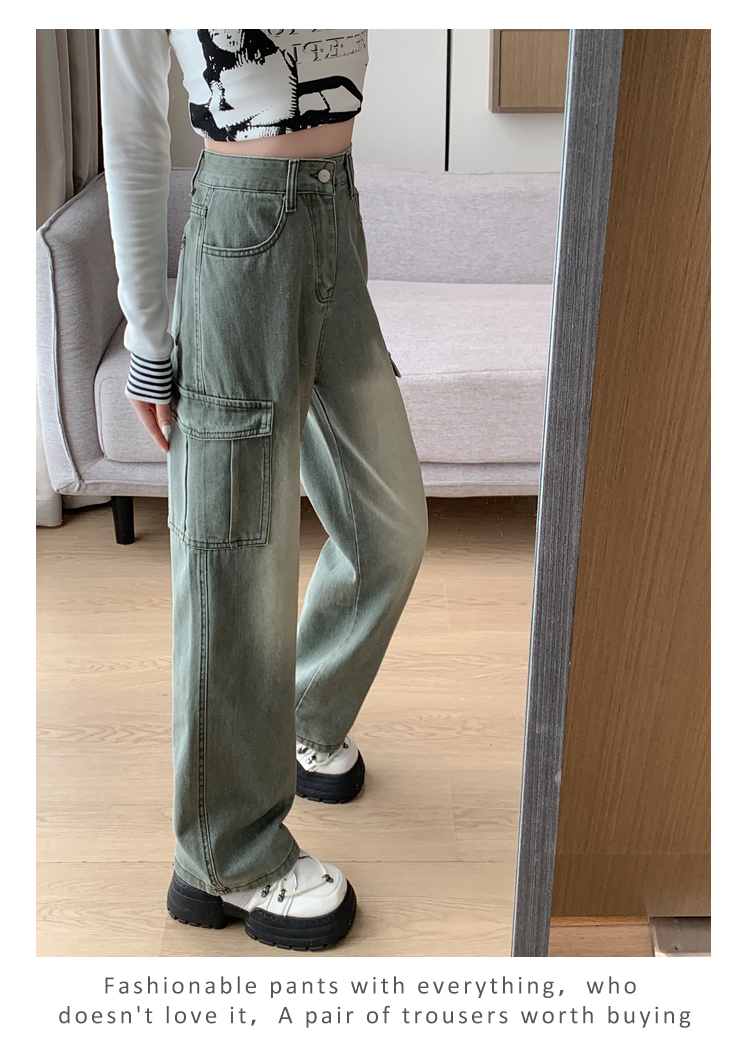 RM31561#怀旧美式工装裤女复古高街高腰显瘦休闲阔腿牛仔裤子潮