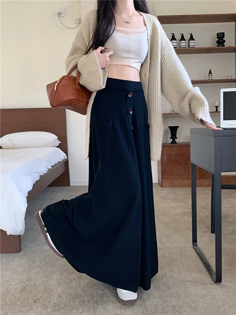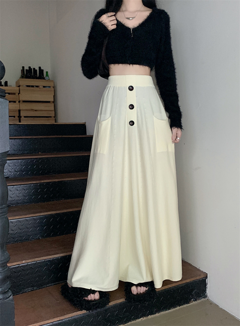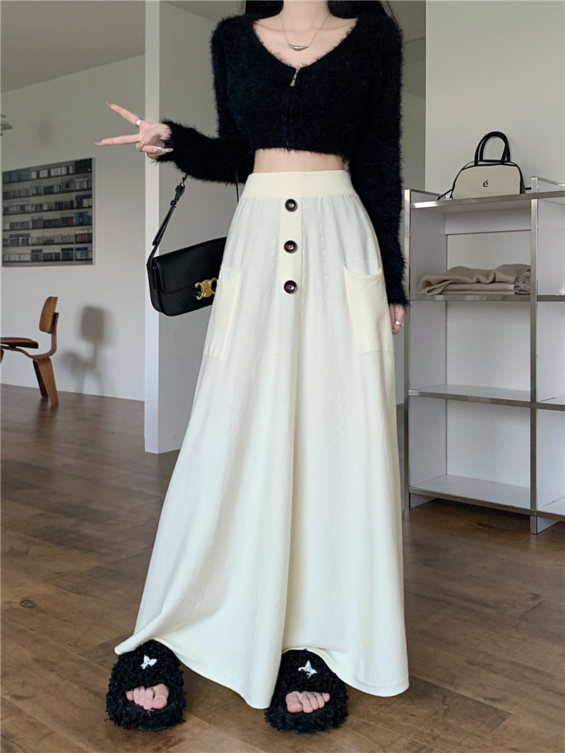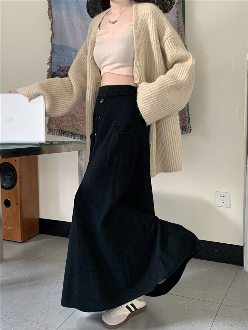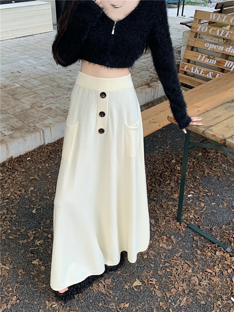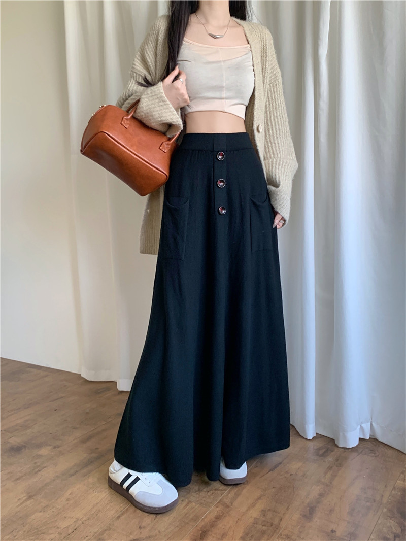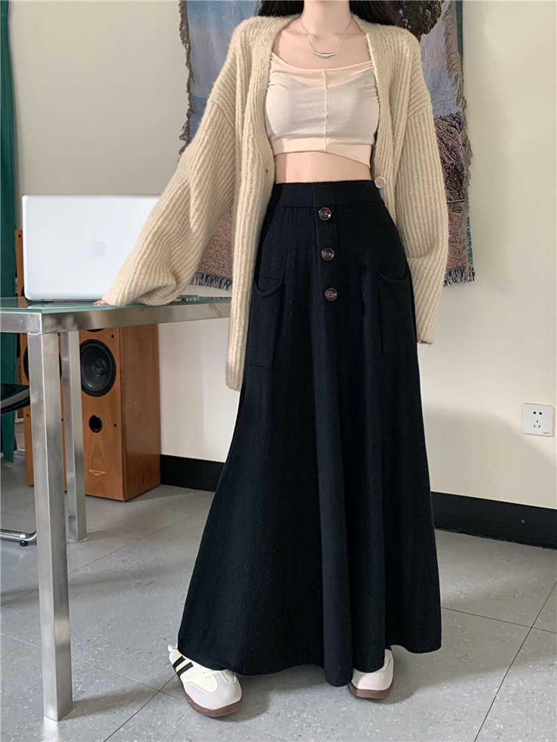 RM31780#排扣高腰针织半身裙女秋冬新款气质大摆A字毛线长裙