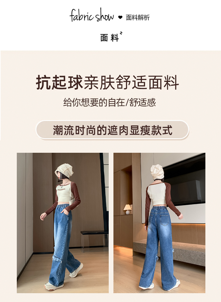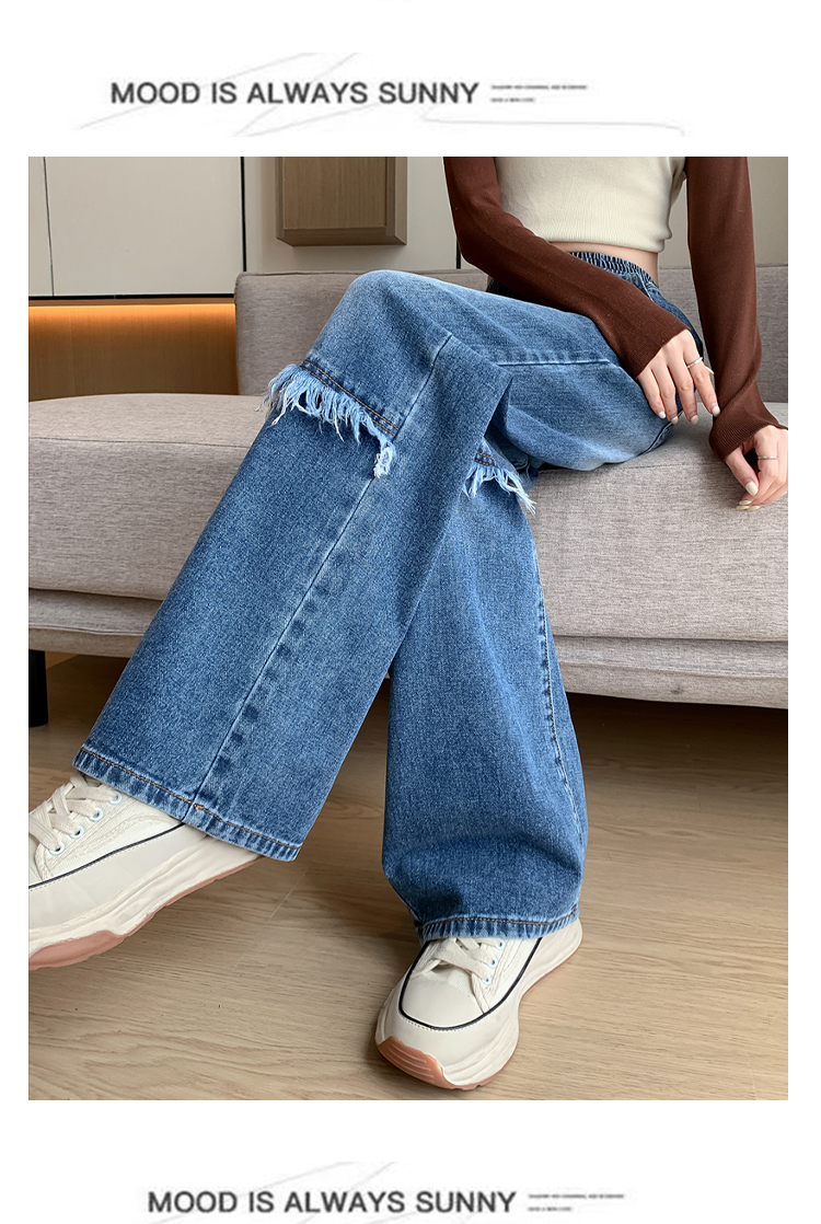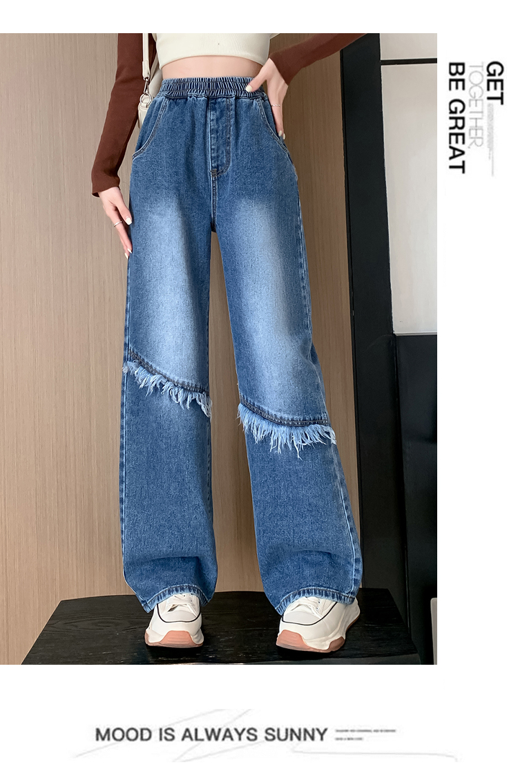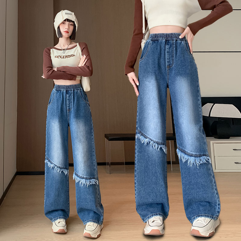 RM31806#拼接毛边阔腿高腰牛仔长裤女韩版百搭大码女装230