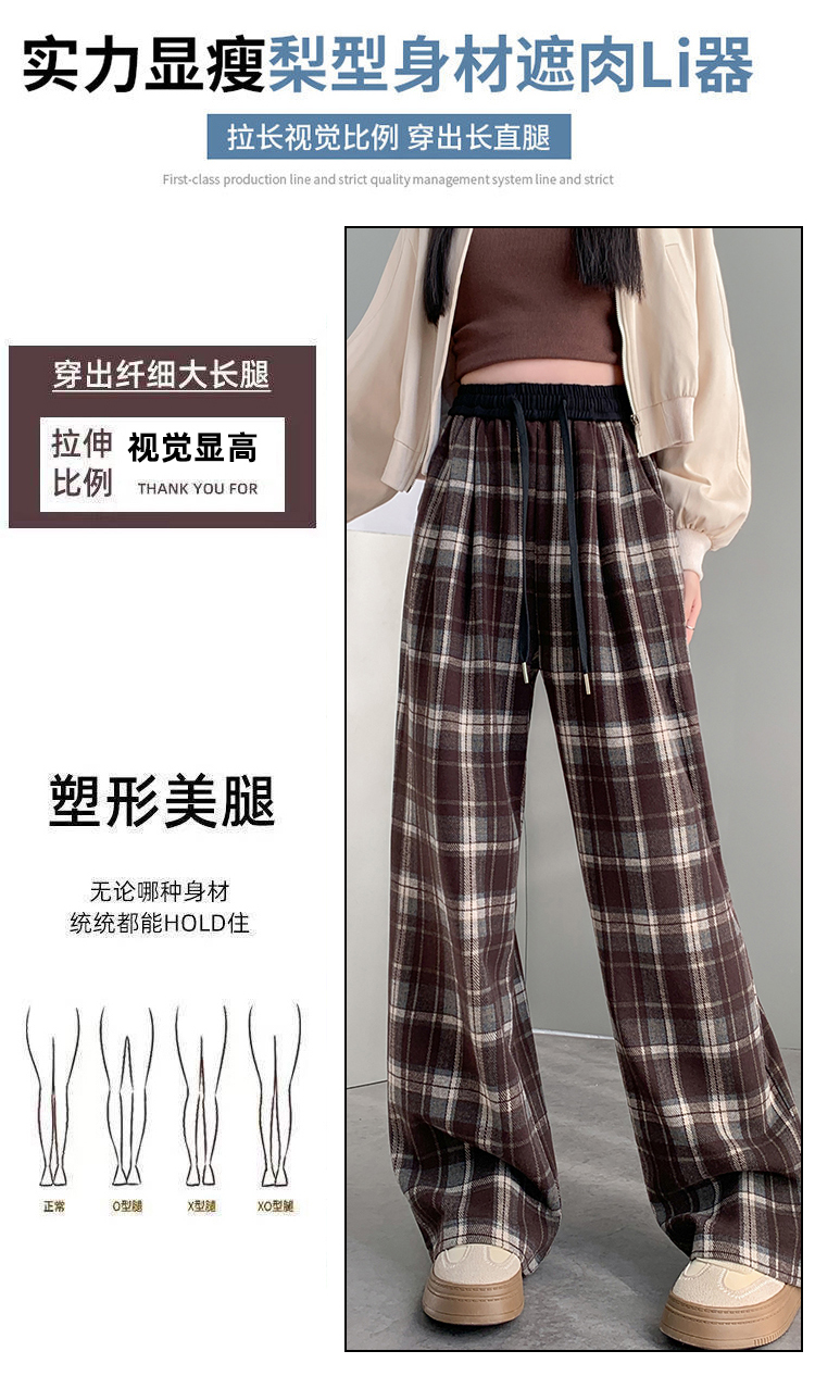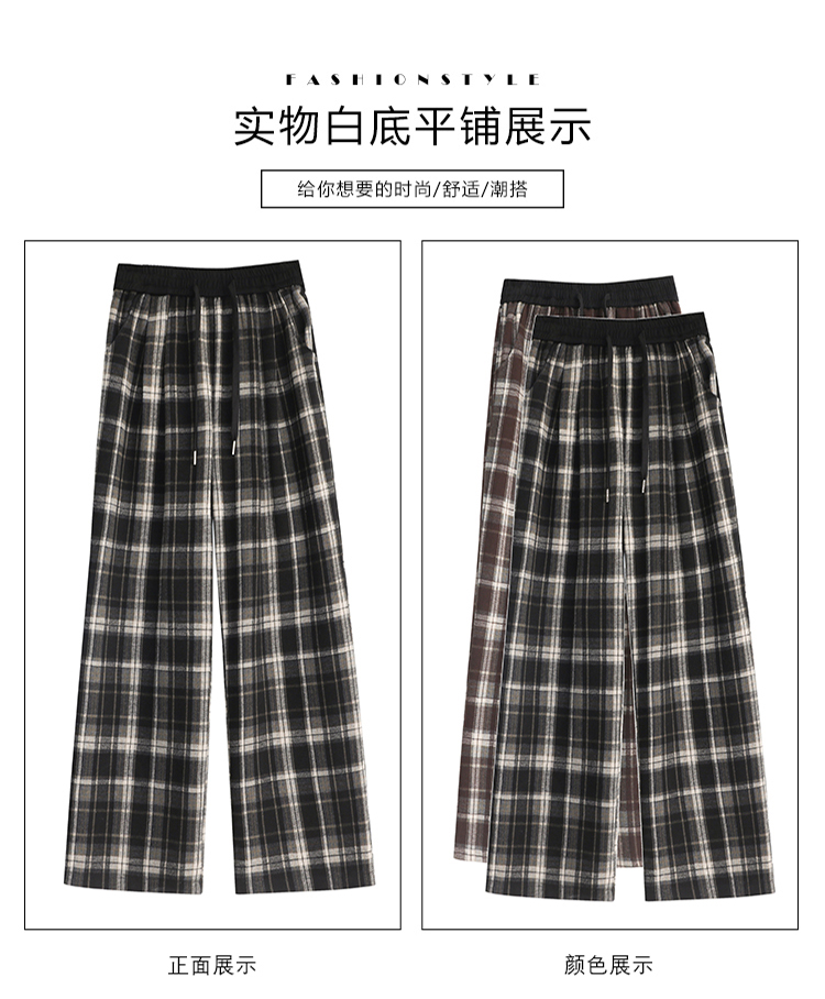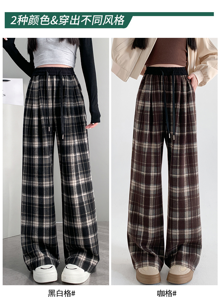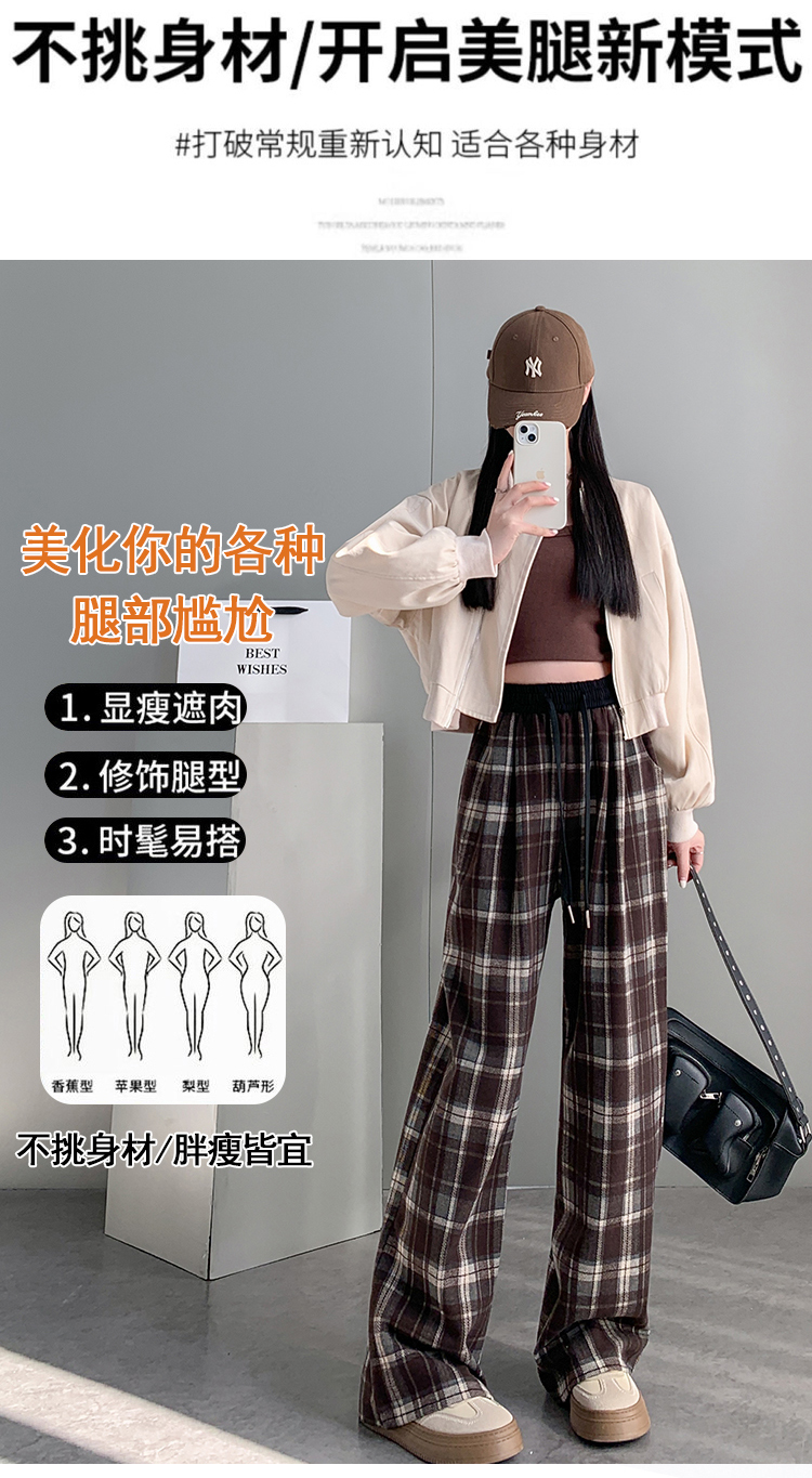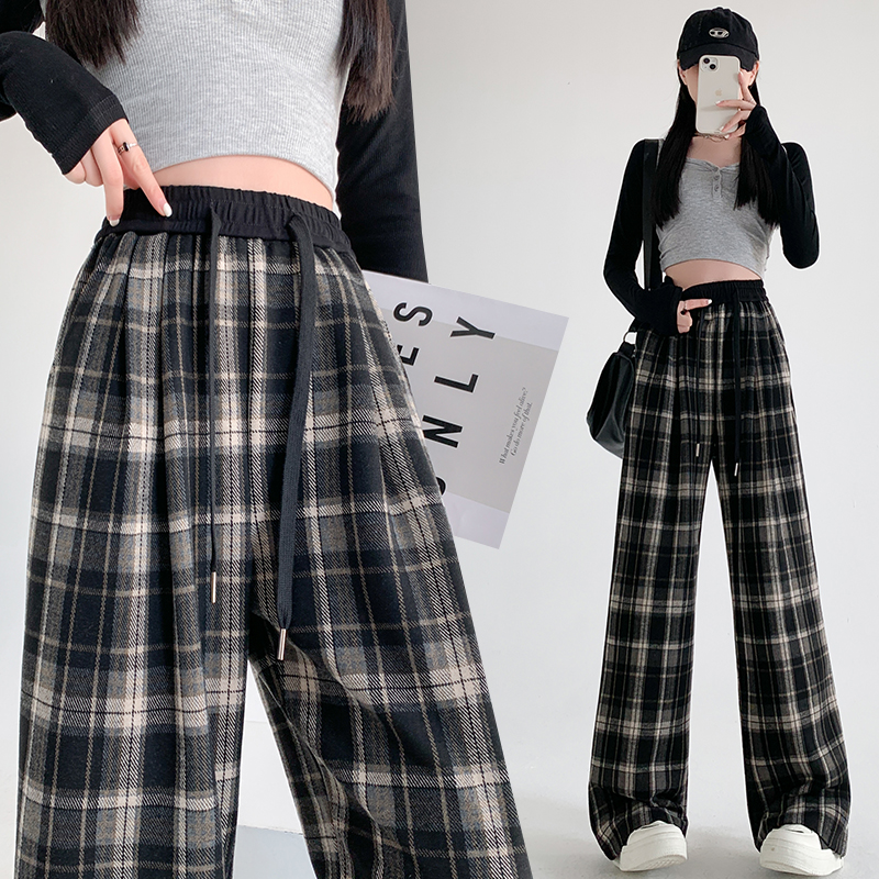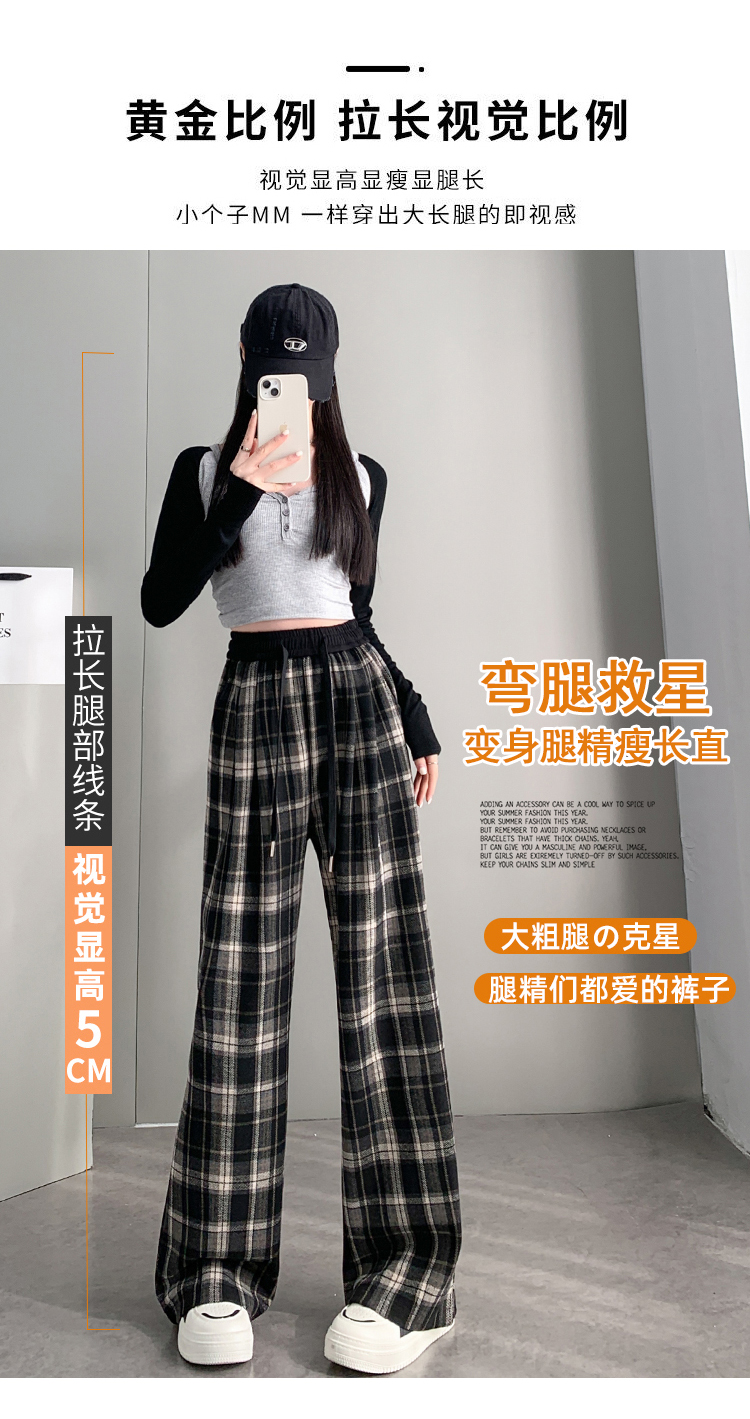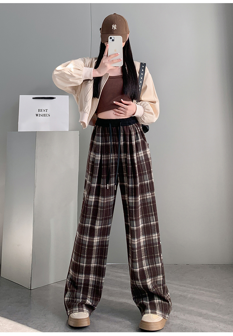 RM31836#撞色复古格子阔腿裤女百搭宽松显瘦休闲直筒裤垂感拖地裤