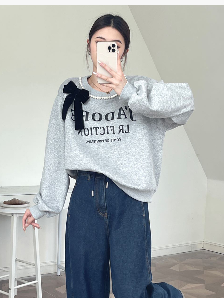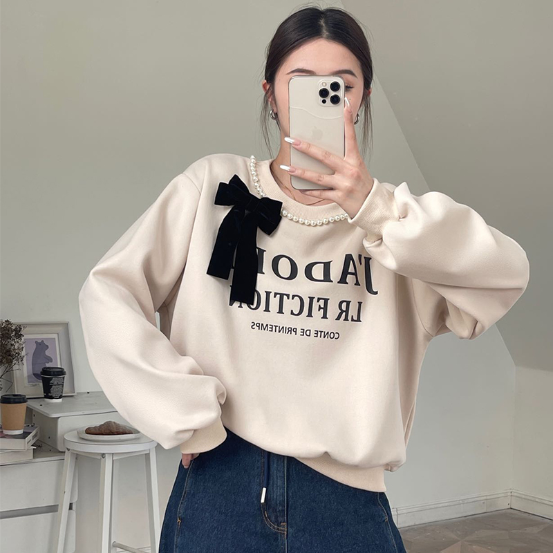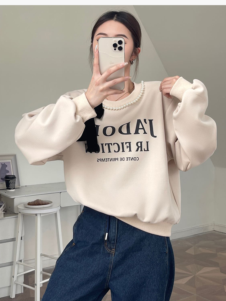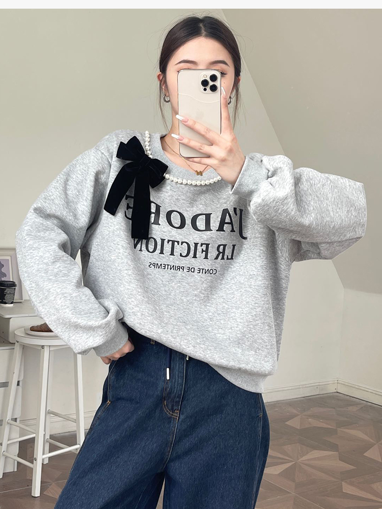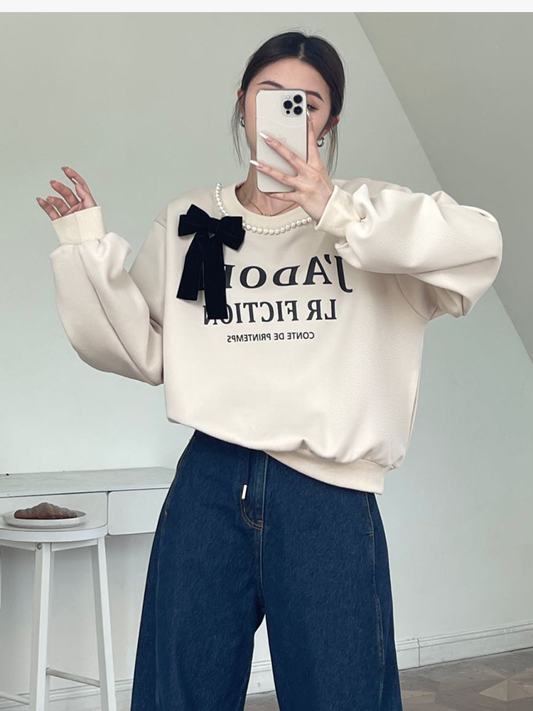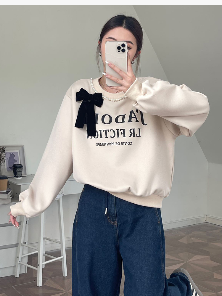 RM31845#十三行韩国女装秋季新款圆领珍珠蝴蝶结休闲长袖卫衣女