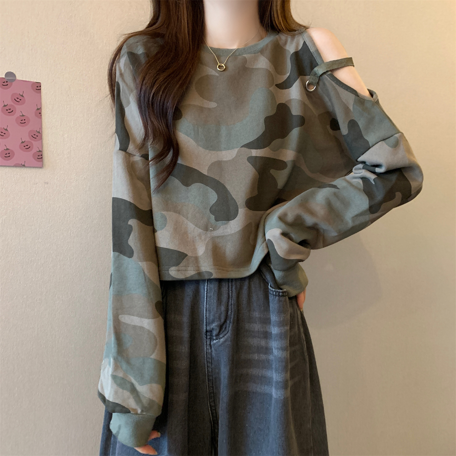 RM31990#胖MM韩版镂空露肩时尚迷彩减龄气质卫衣女新款