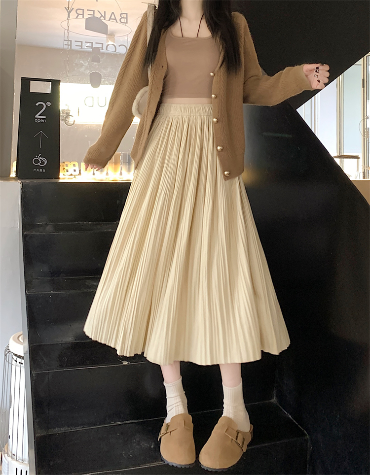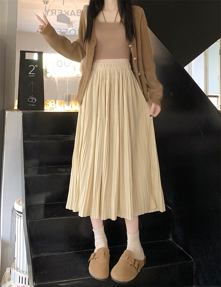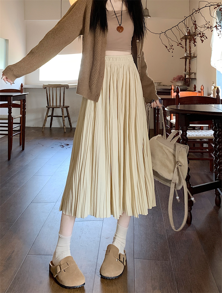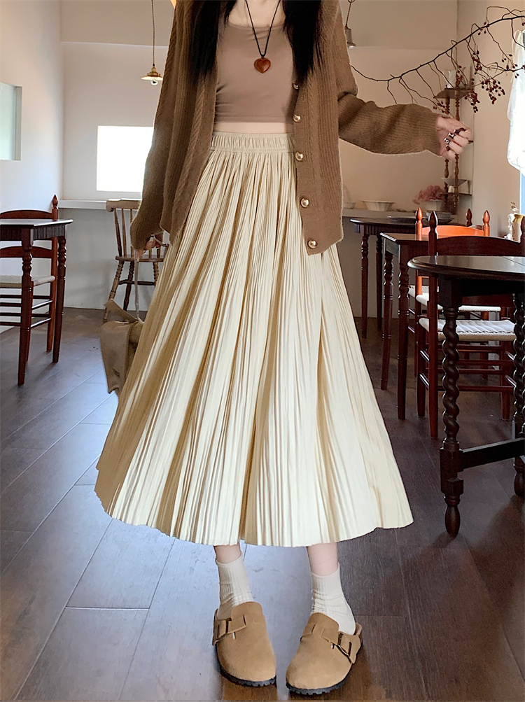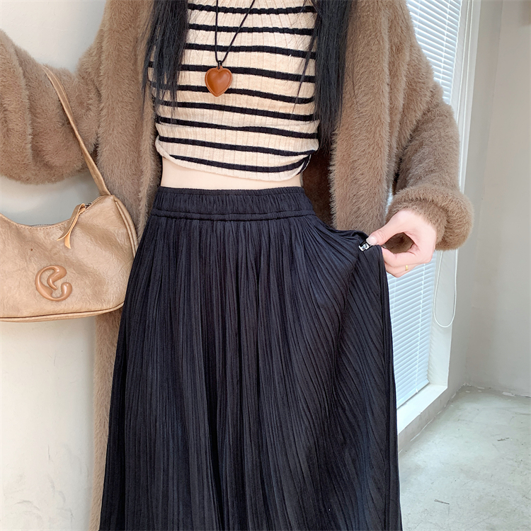 RM32088#新款韩版高腰显瘦纯色百褶丝绒中长款半身裙女