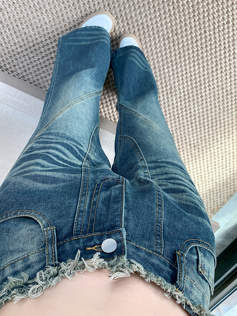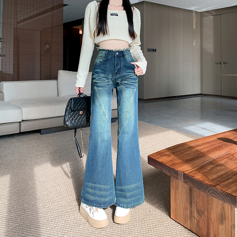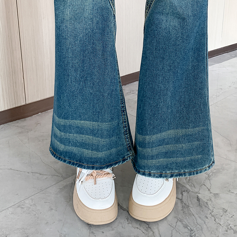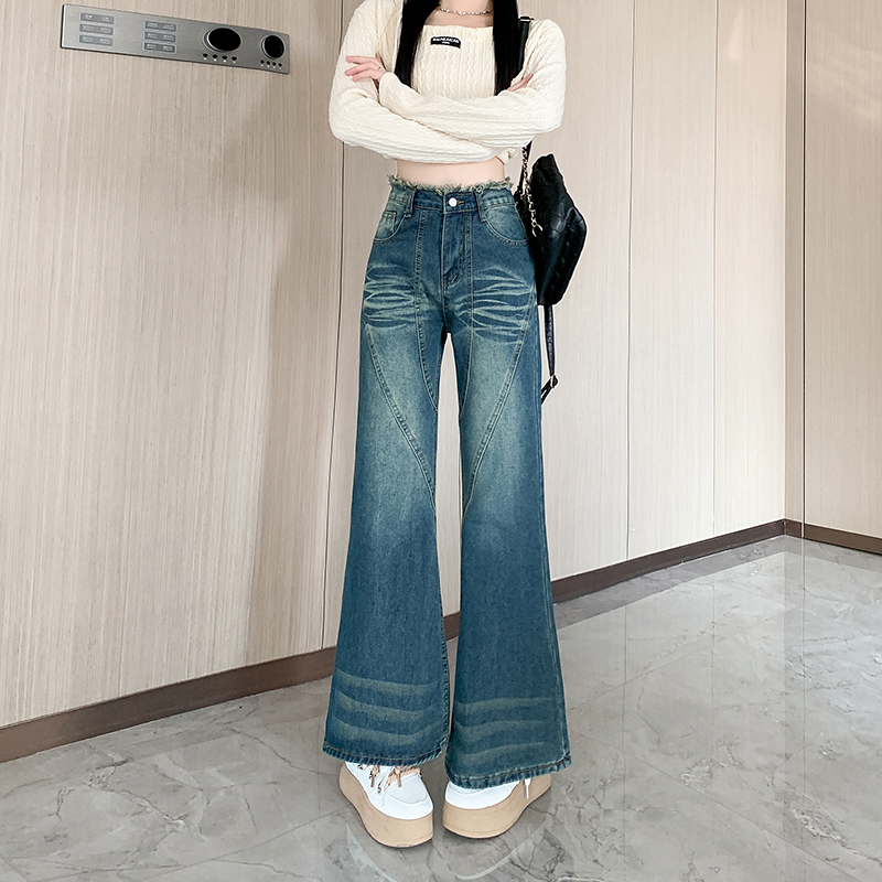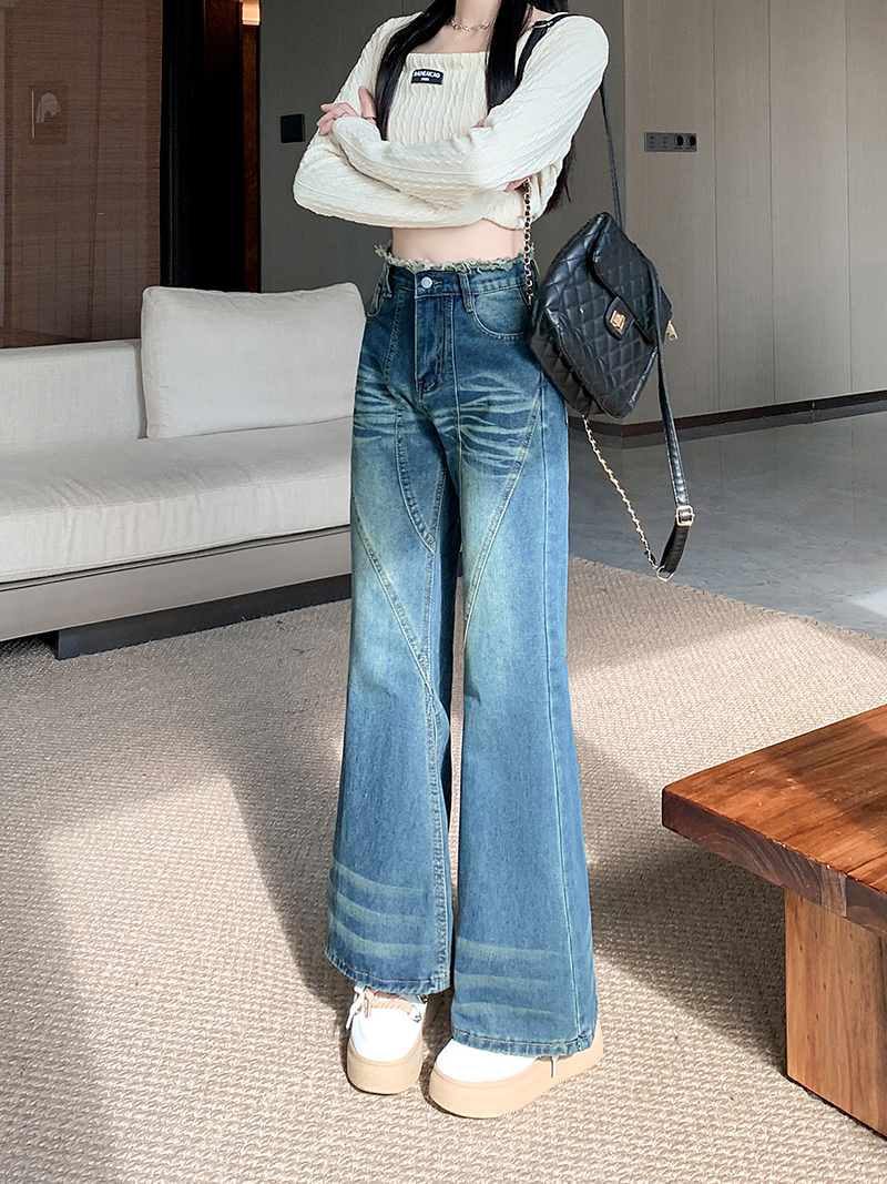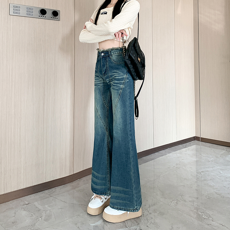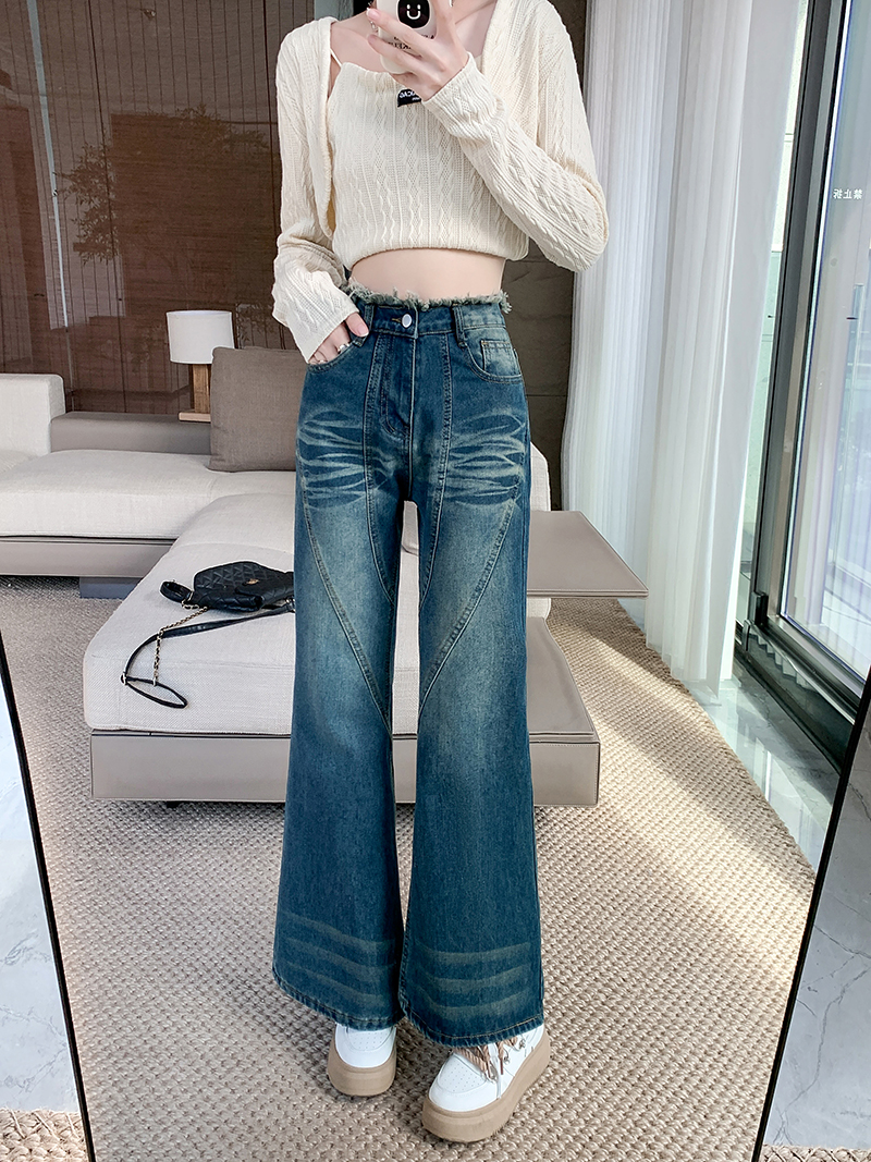 RM32099#水洗做旧毛边高腰长裤子辣妹显瘦复古阔腿微喇叭牛仔裤