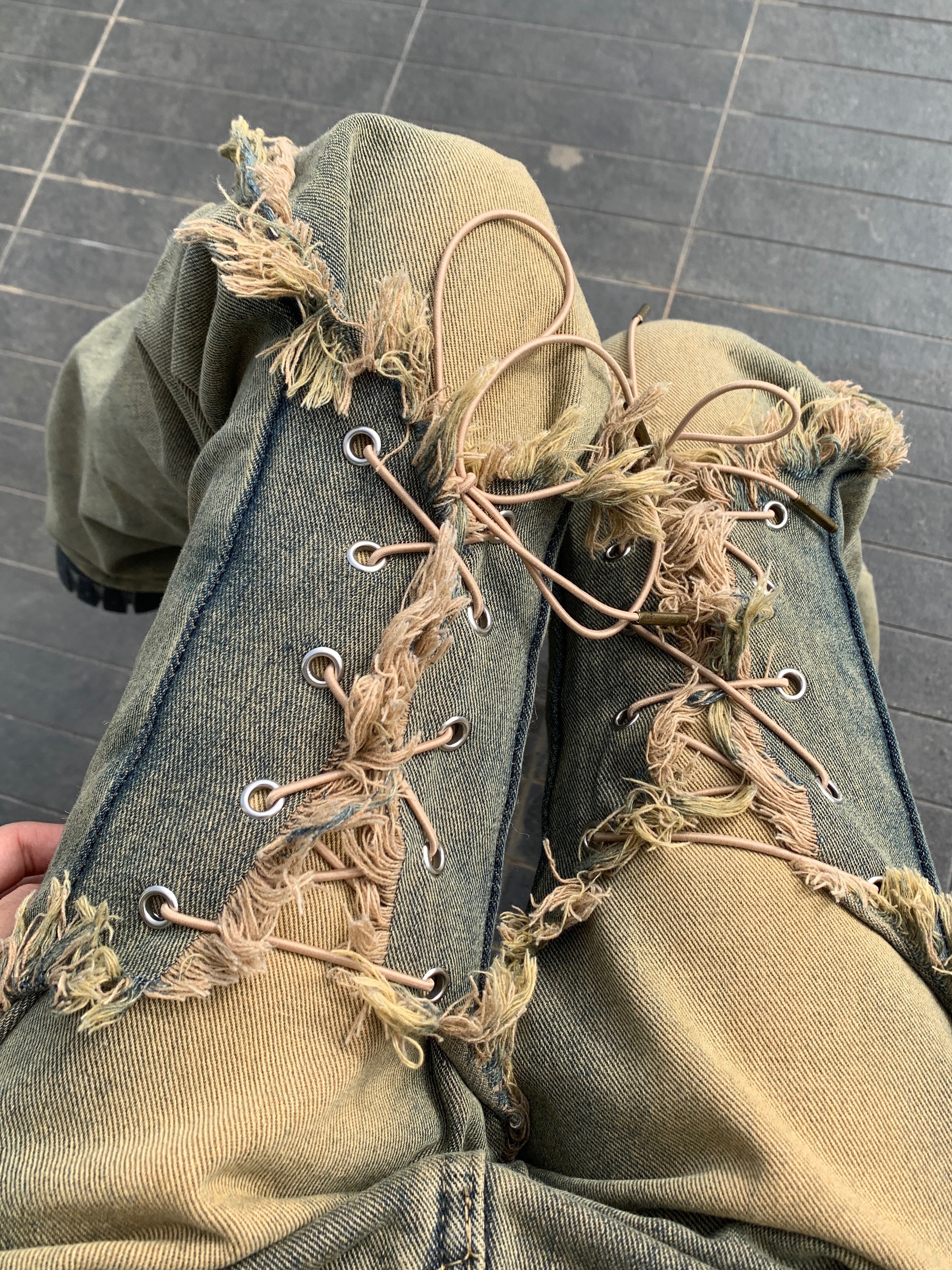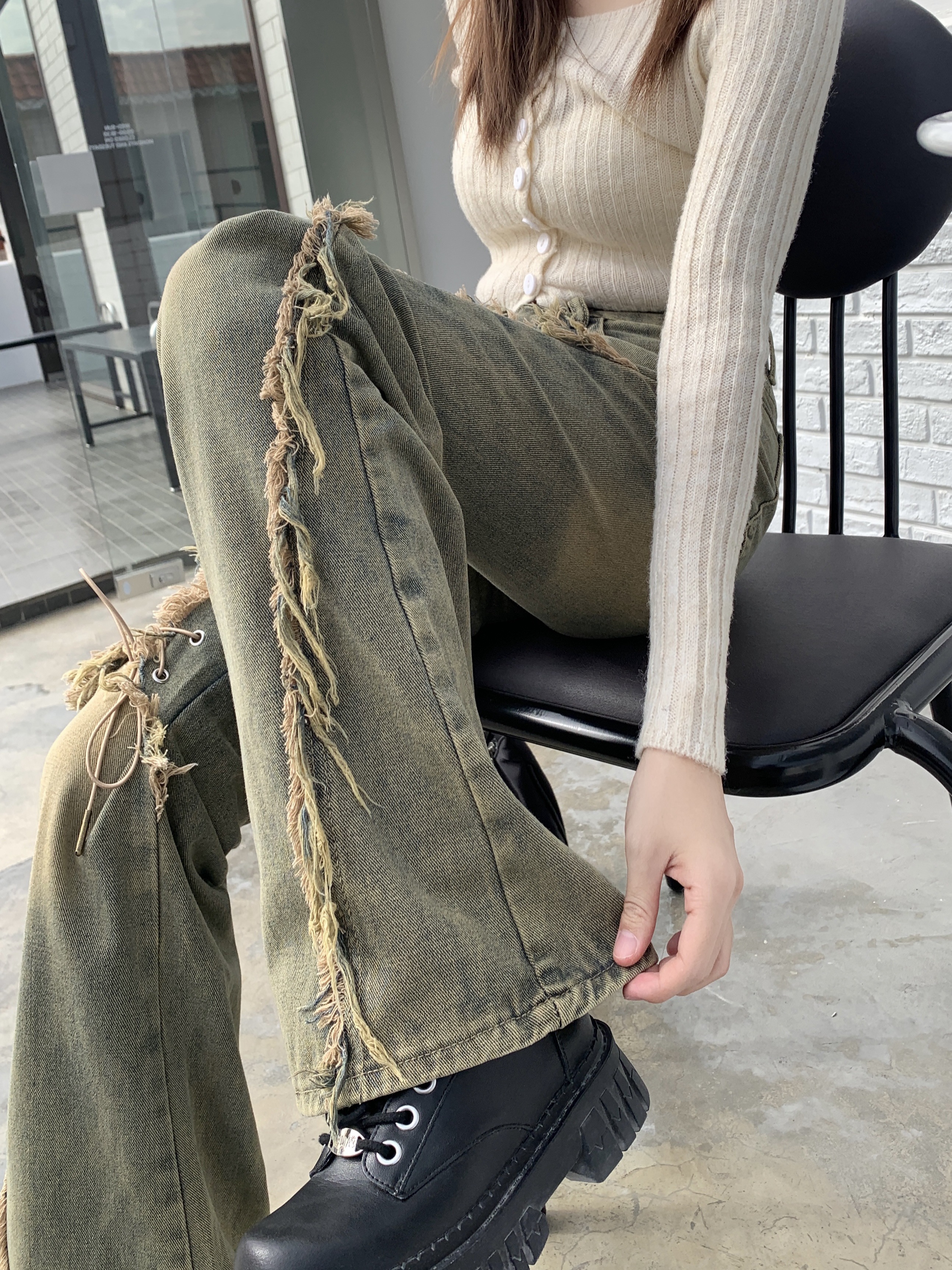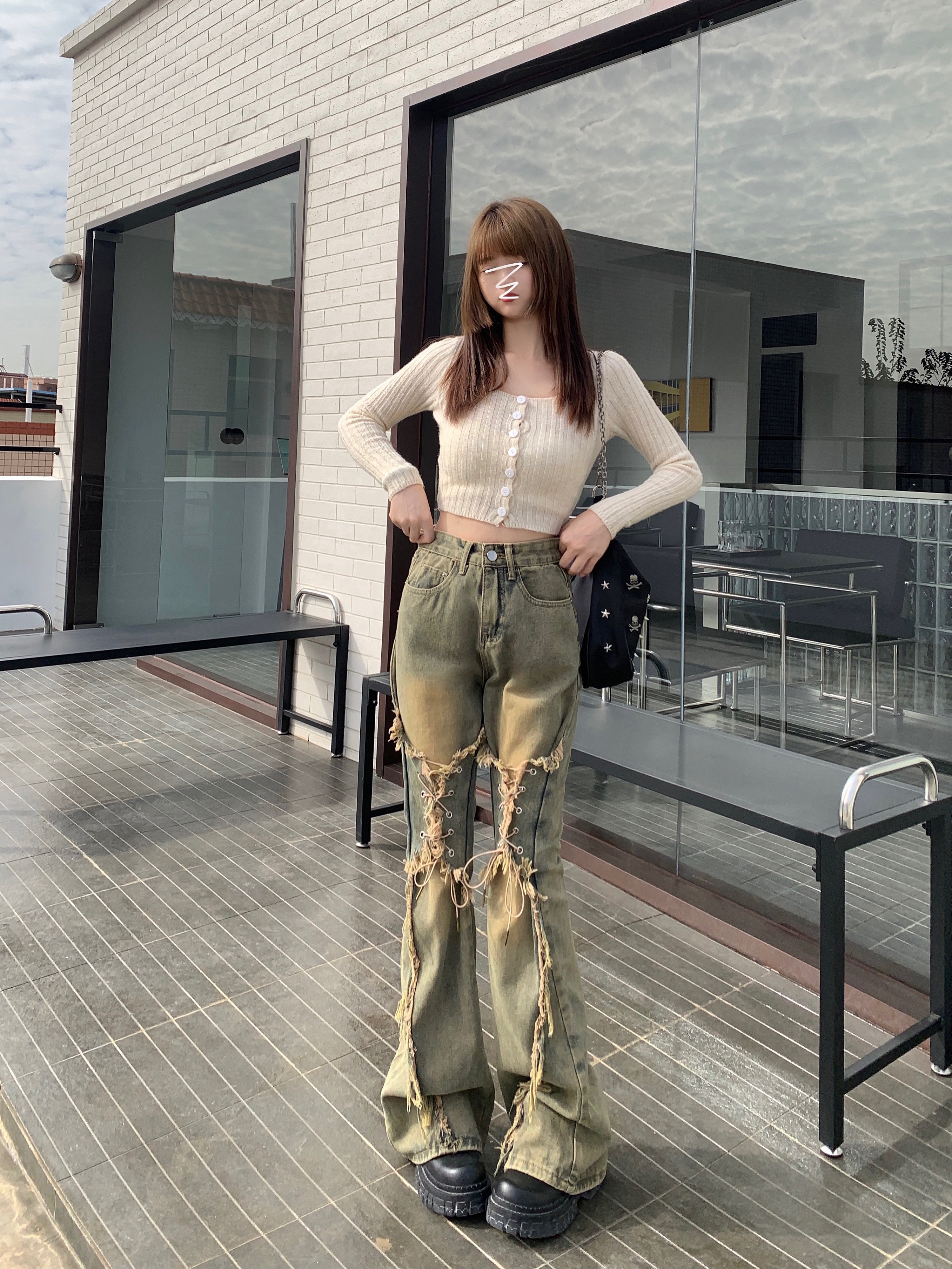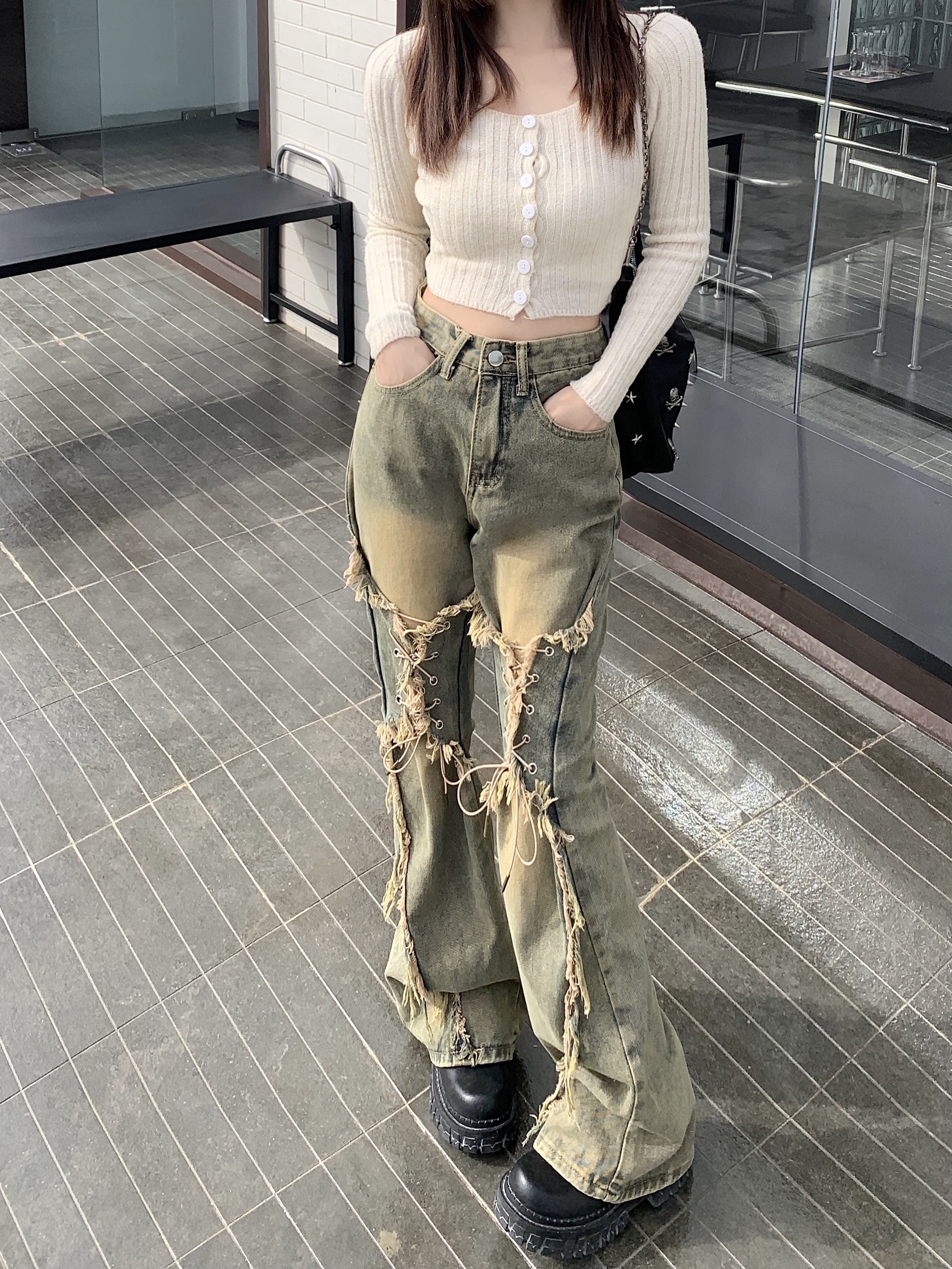 RM32104#美式复古辣妹绑带蝴蝶结毛边小众马蹄微喇叭牛仔裤