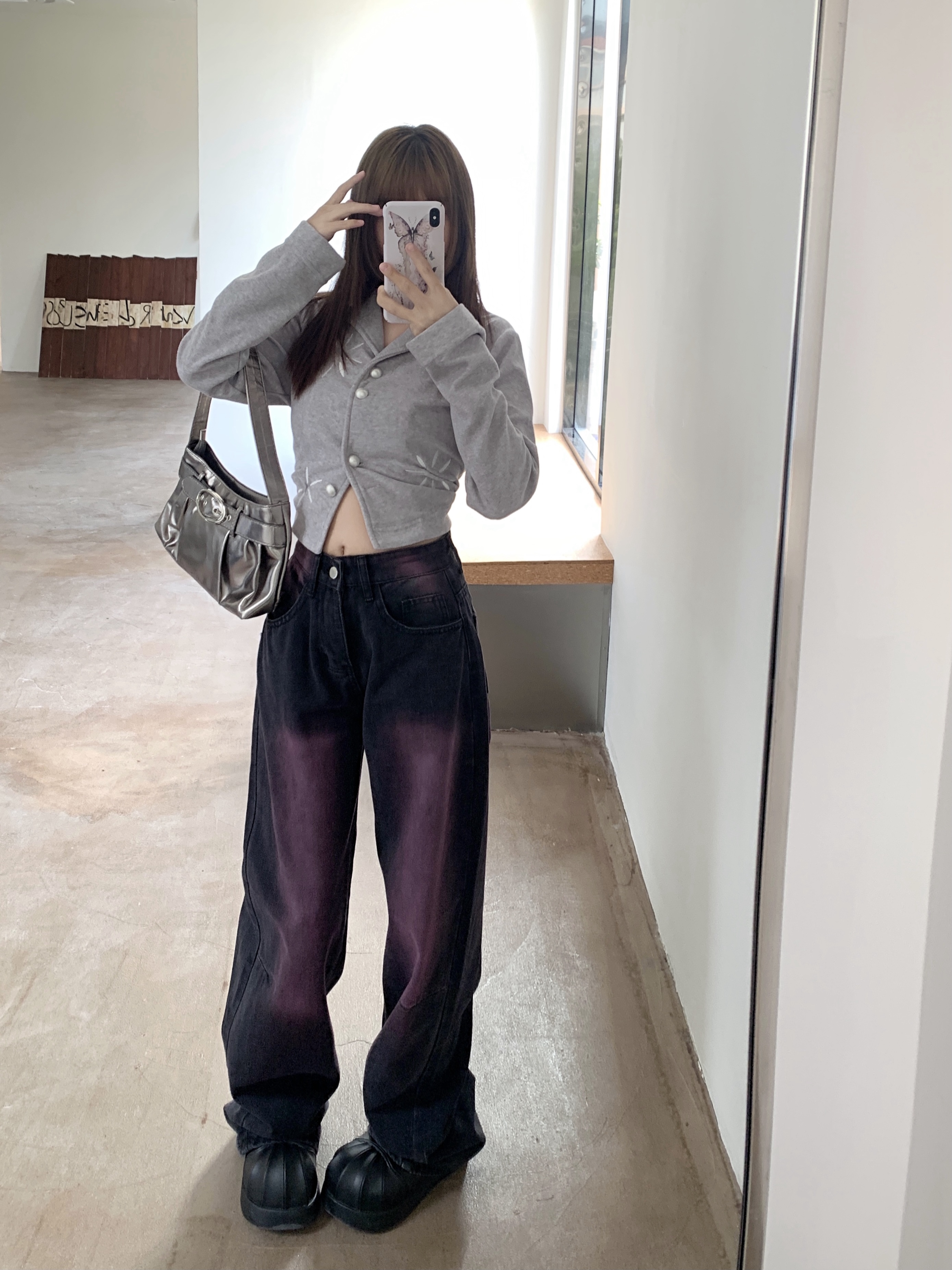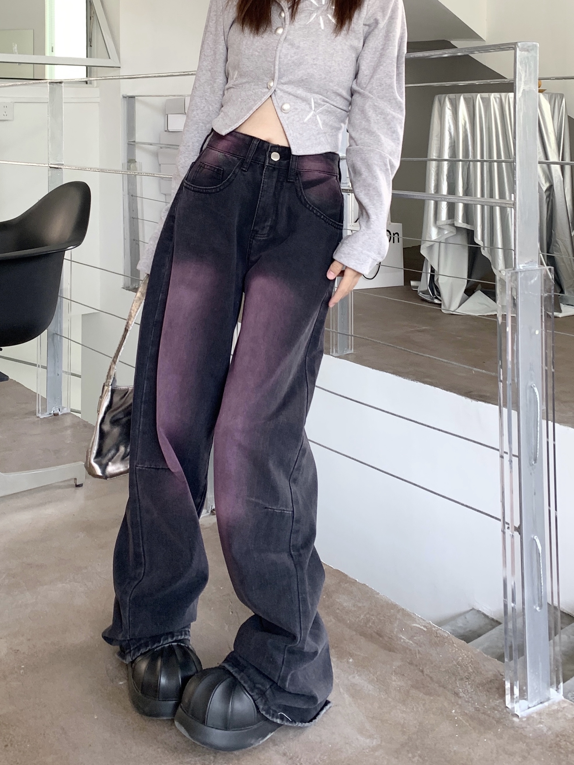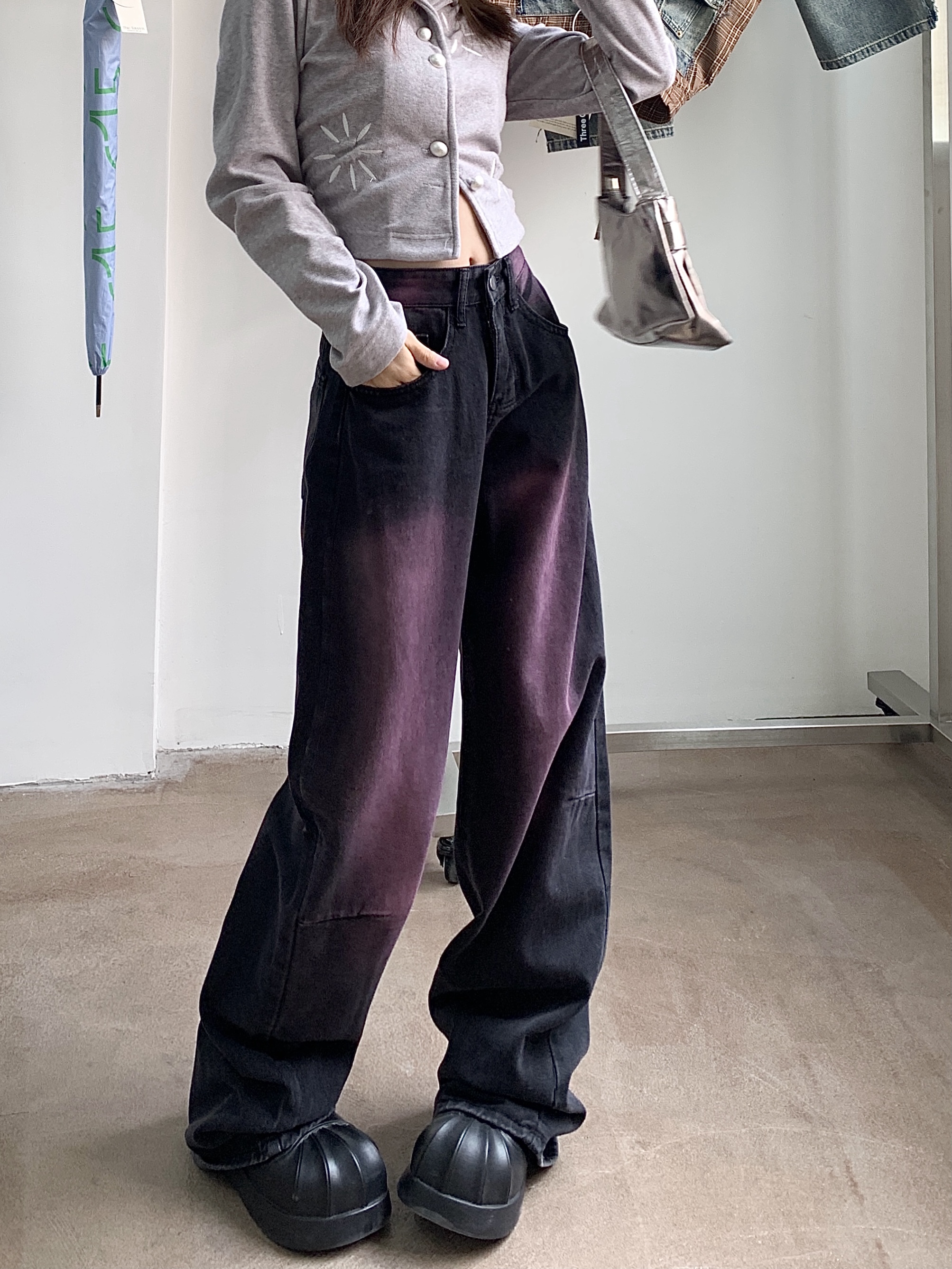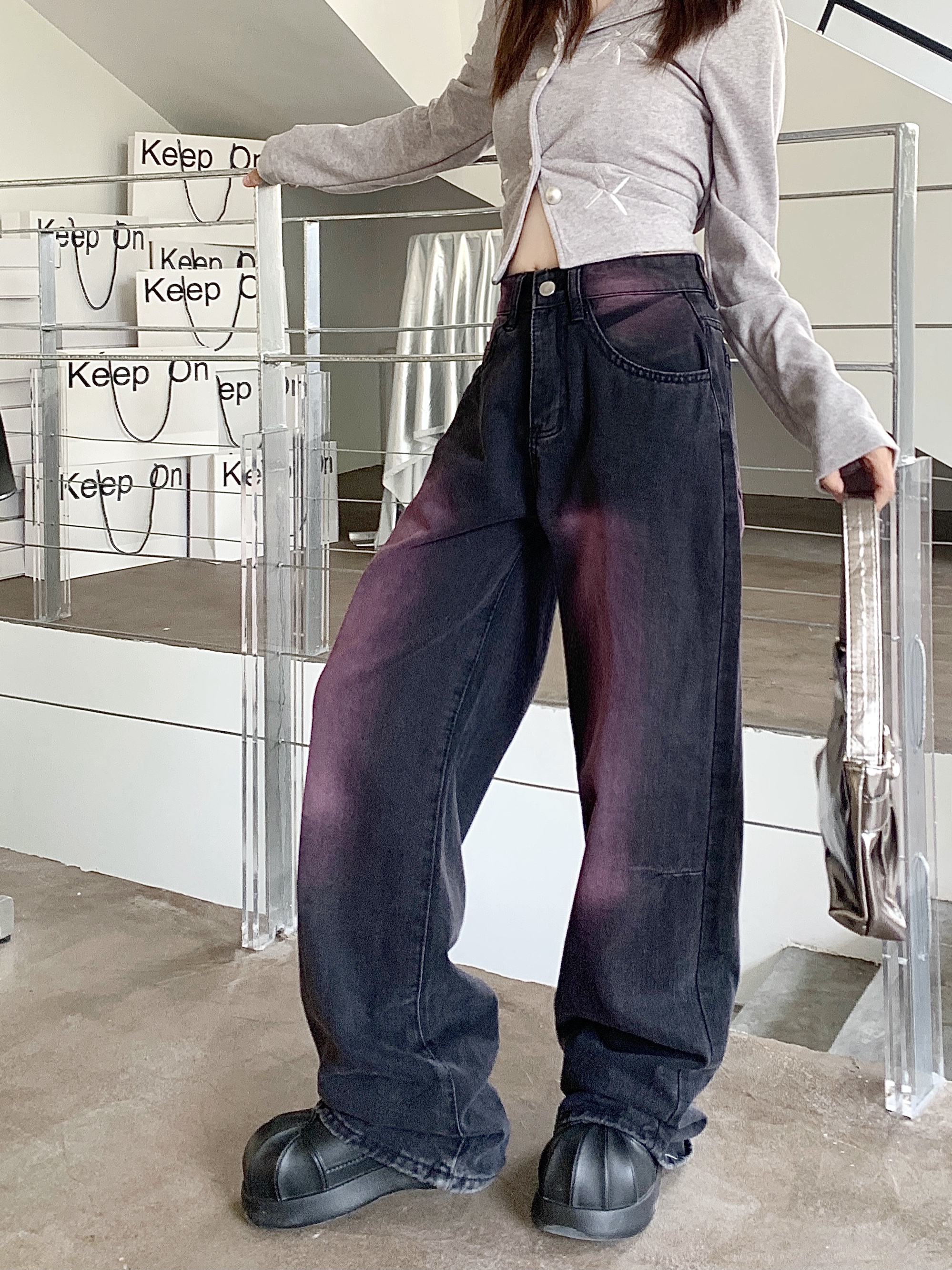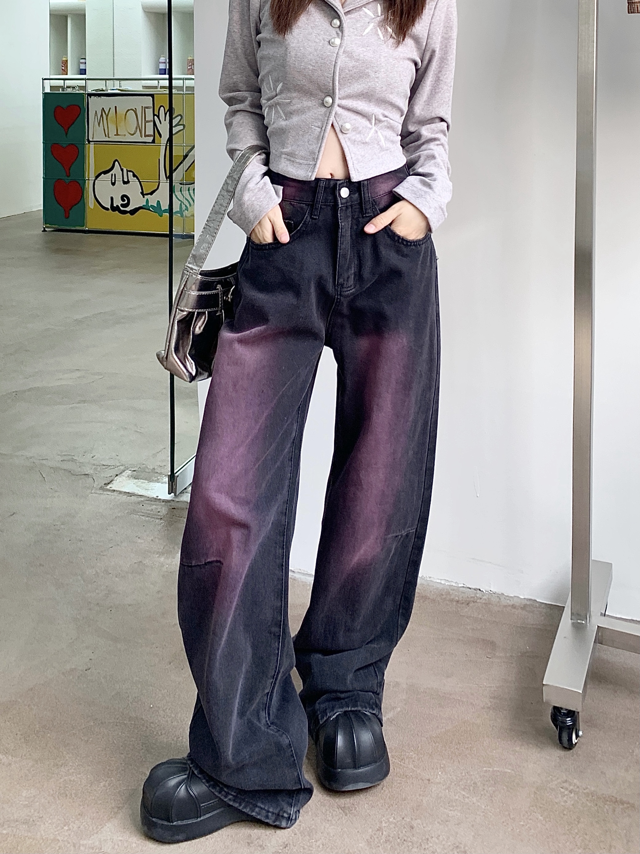 RM32106#水洗做旧新款涂鸦牛仔裤女复古设计感直筒阔腿长裤