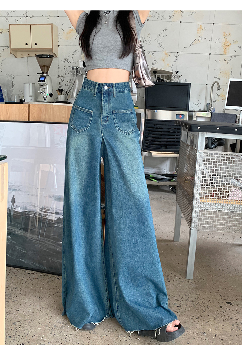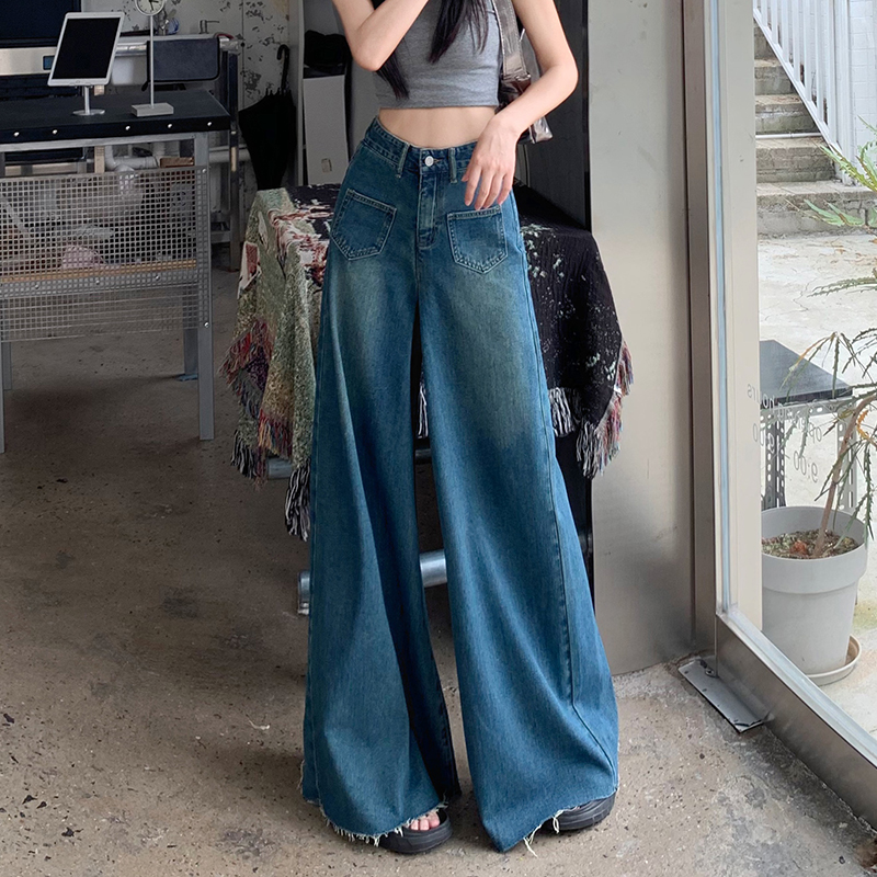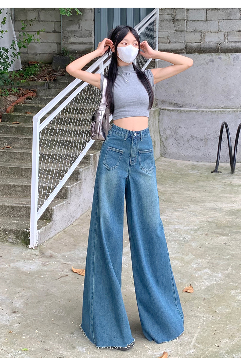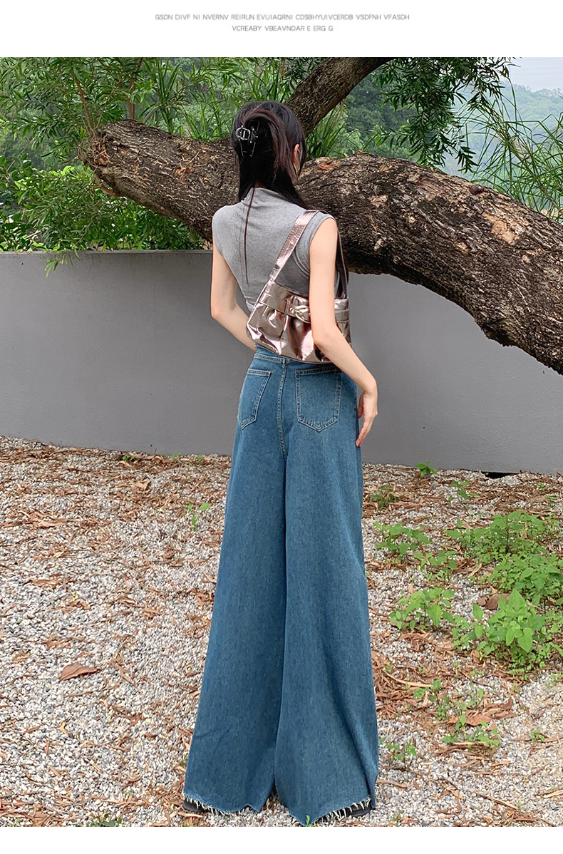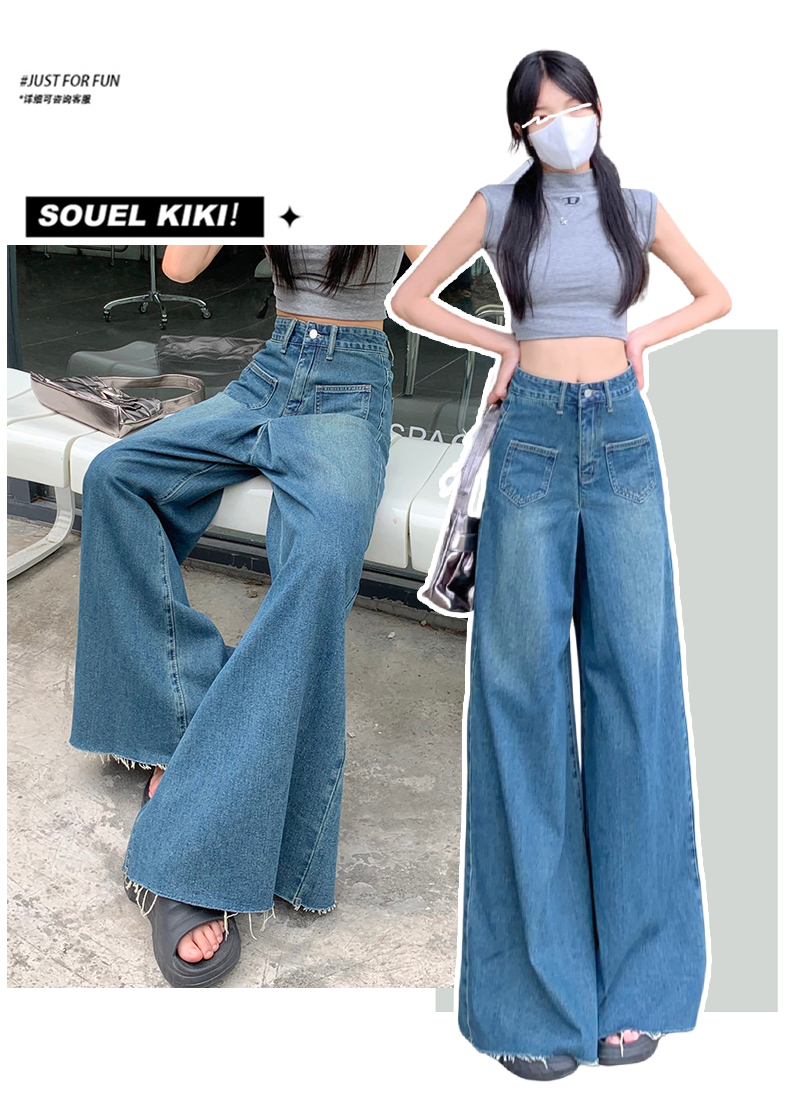 RM32183#复古阔腿牛仔裤裙女春季新款高腰显瘦设计感毛边宽松喇叭裤子