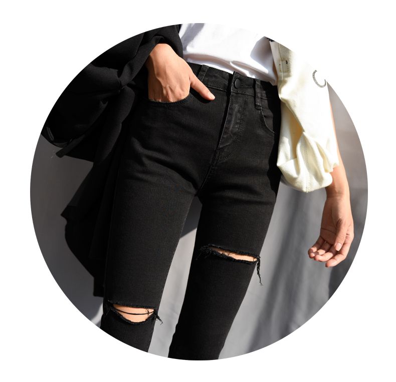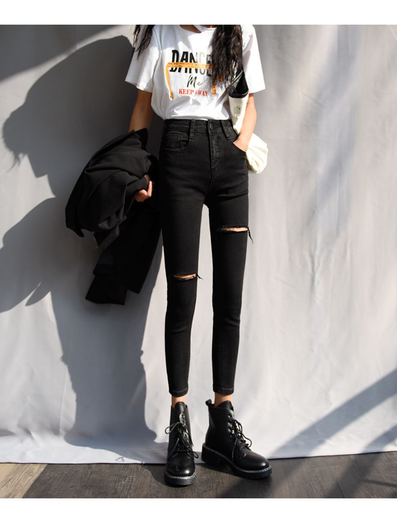 RM32201#韩国黑色大破洞牛仔裤女九分高腰小脚显瘦24年春秋新款毛边铅笔裤