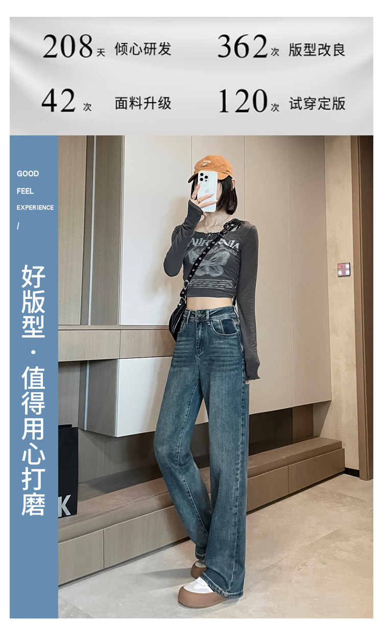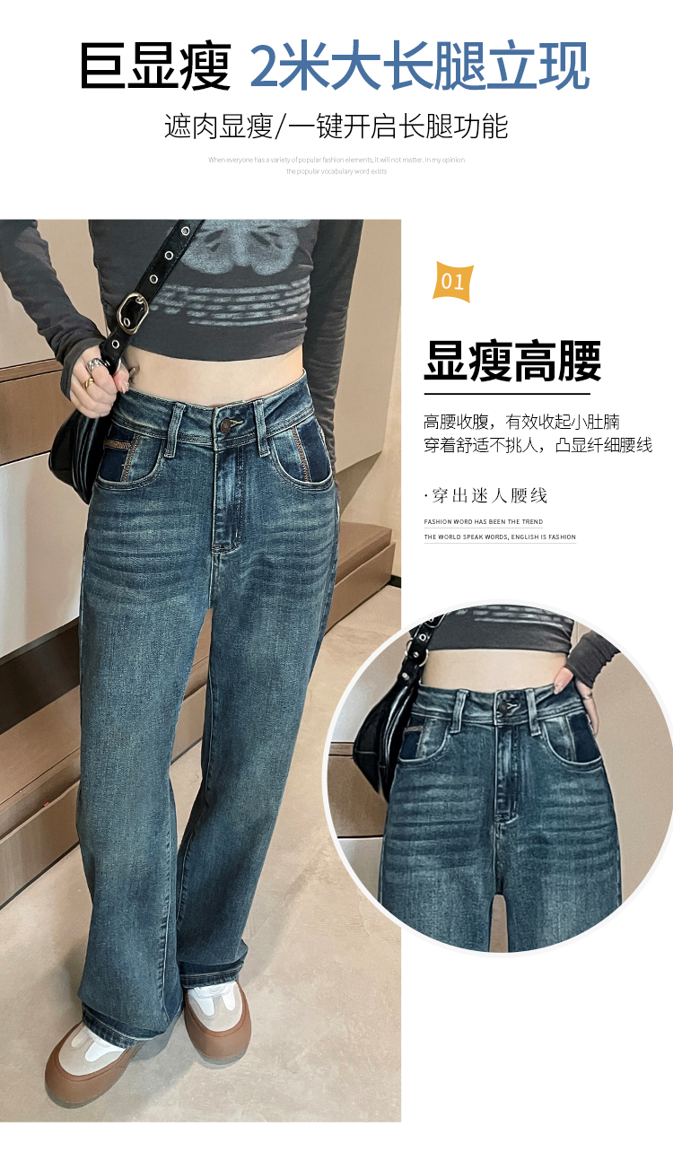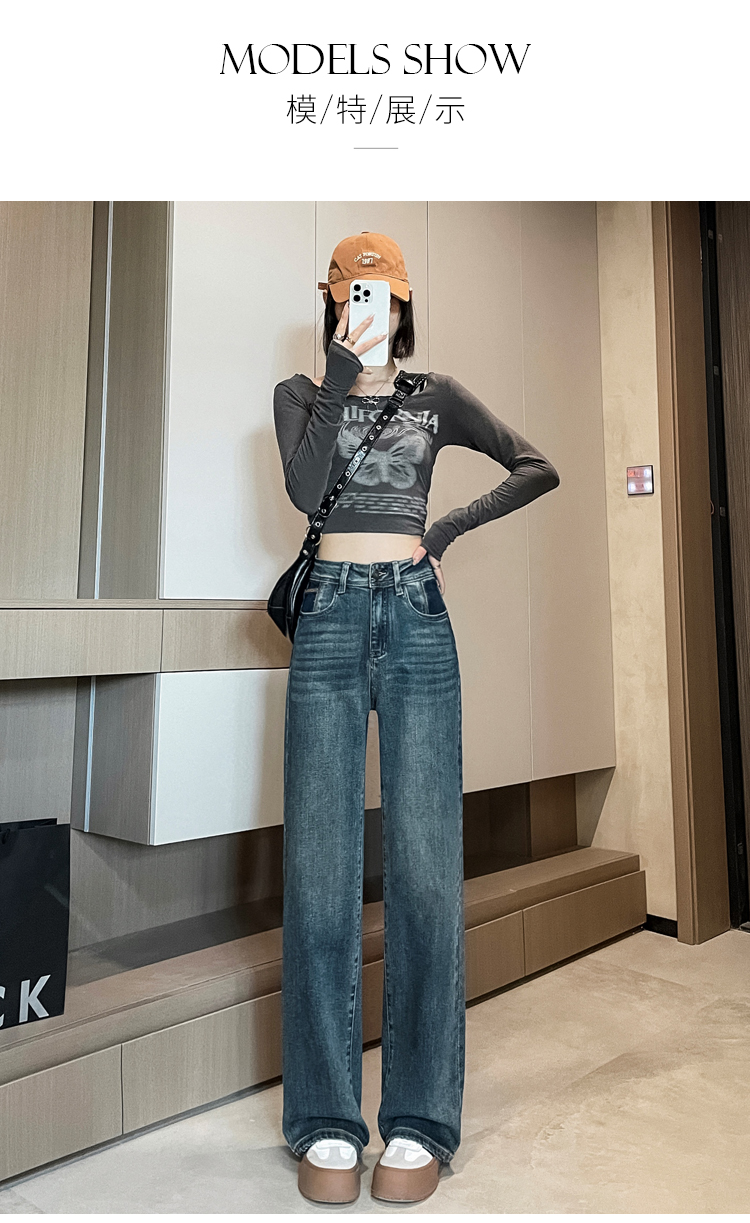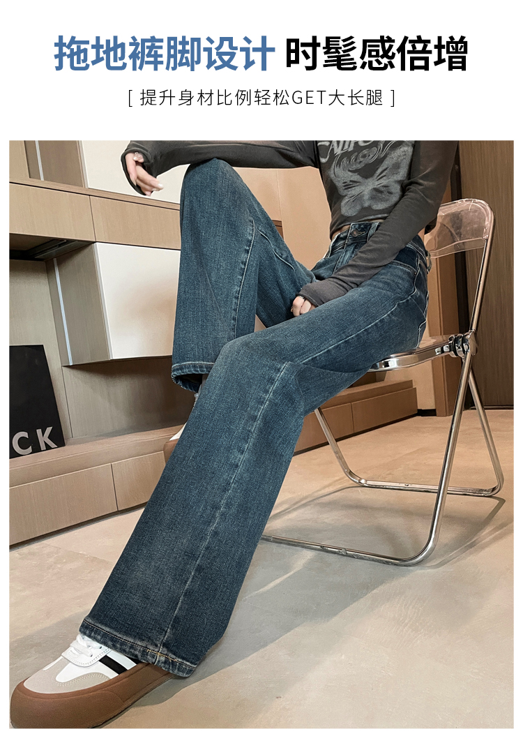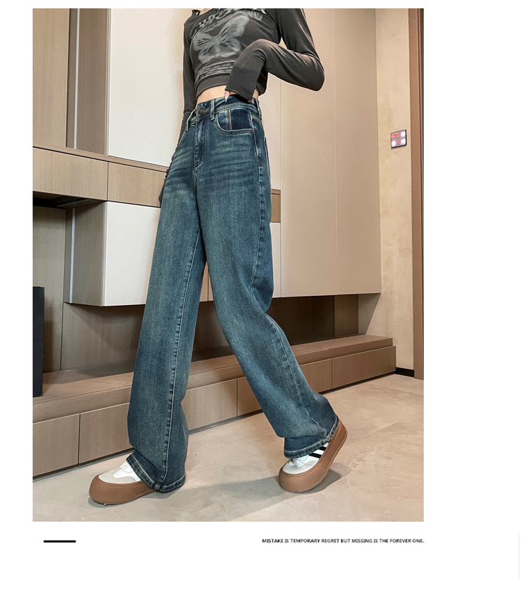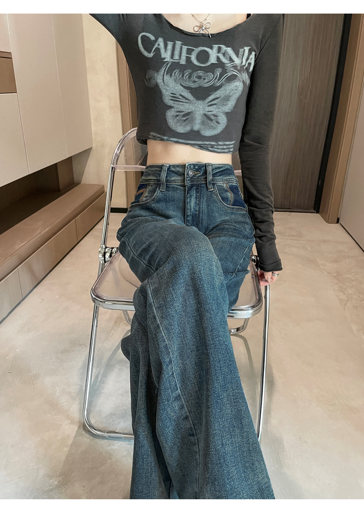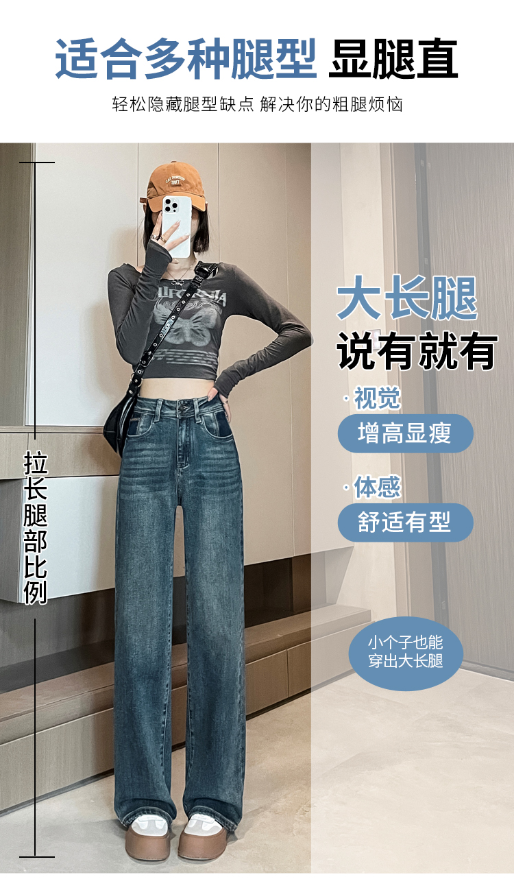 RM32223#窄版阔腿牛仔裤 新款港风高腰显瘦水泥灰撞色设计感直筒裤