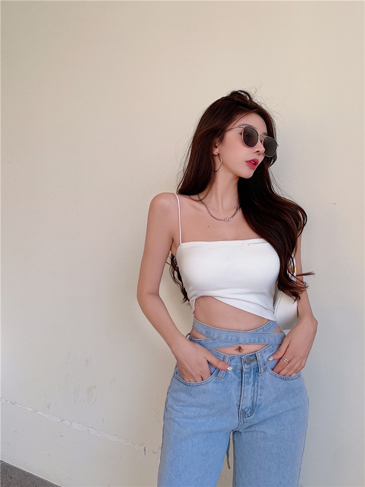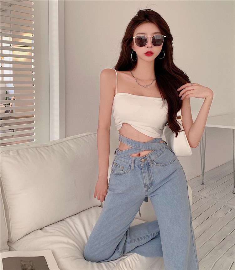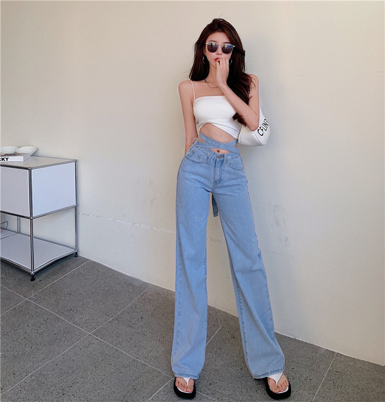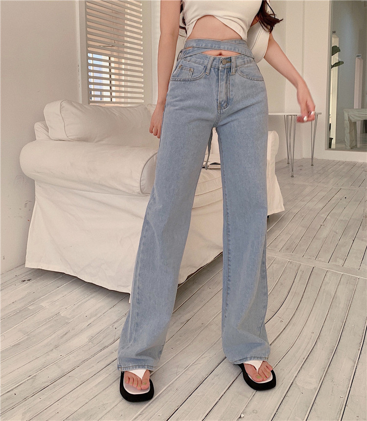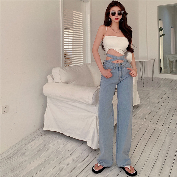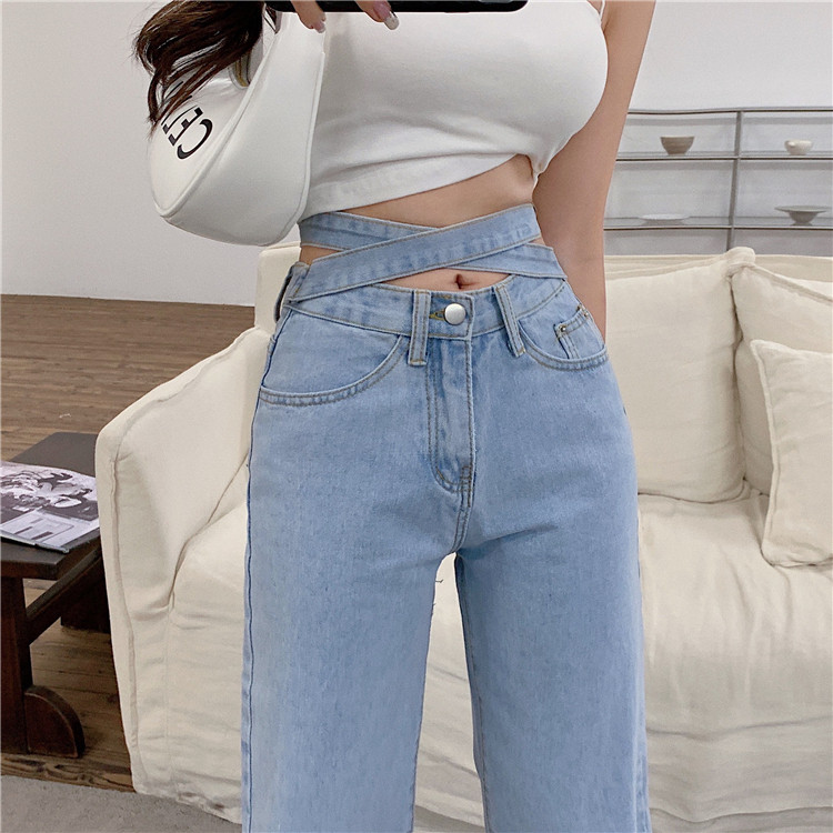 RM32318#时尚交叉高腰阔腿裤女显瘦复古港味新款牛仔裤潮