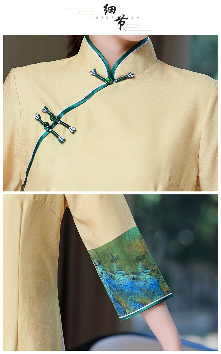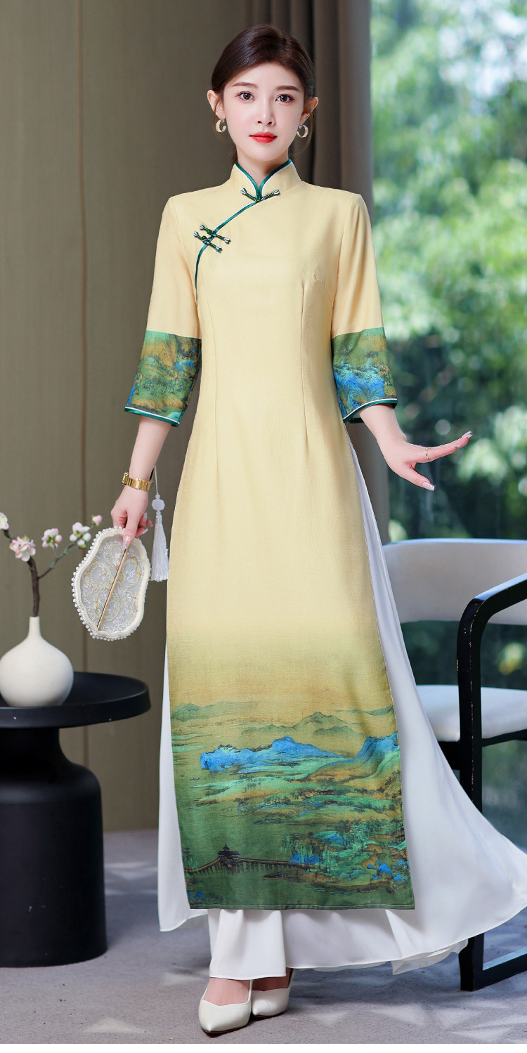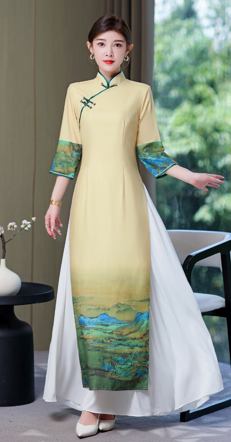 RM32505#千里江山图奥黛旗袍中国风改良2024年新款高端气质走秀演出服长款