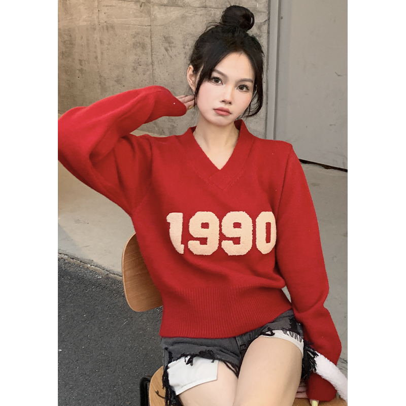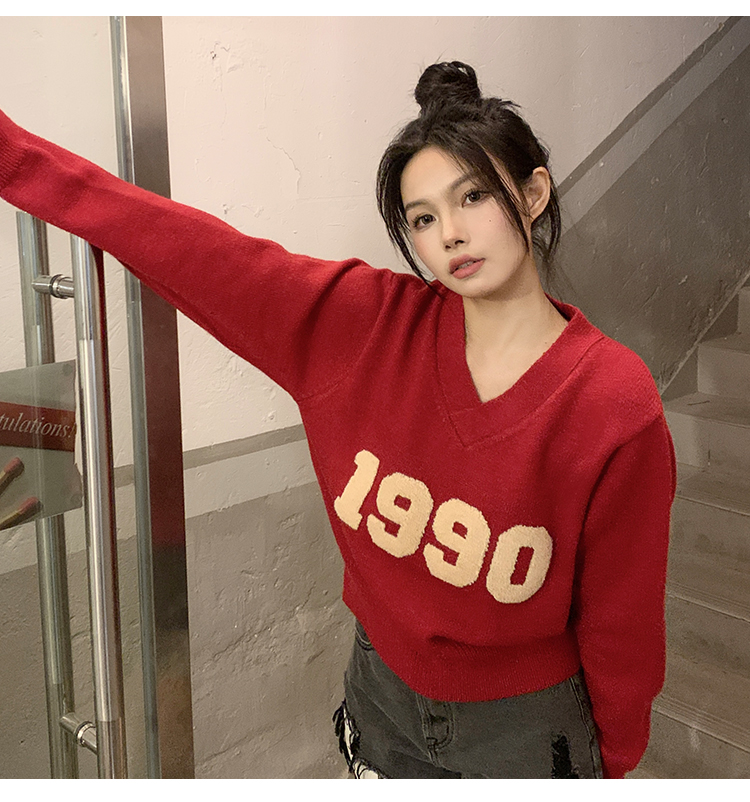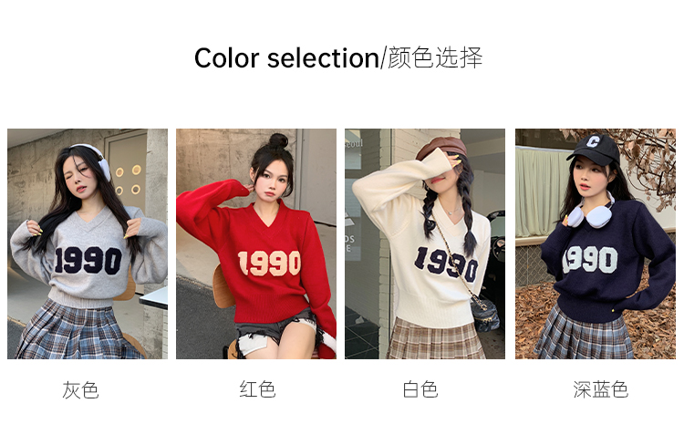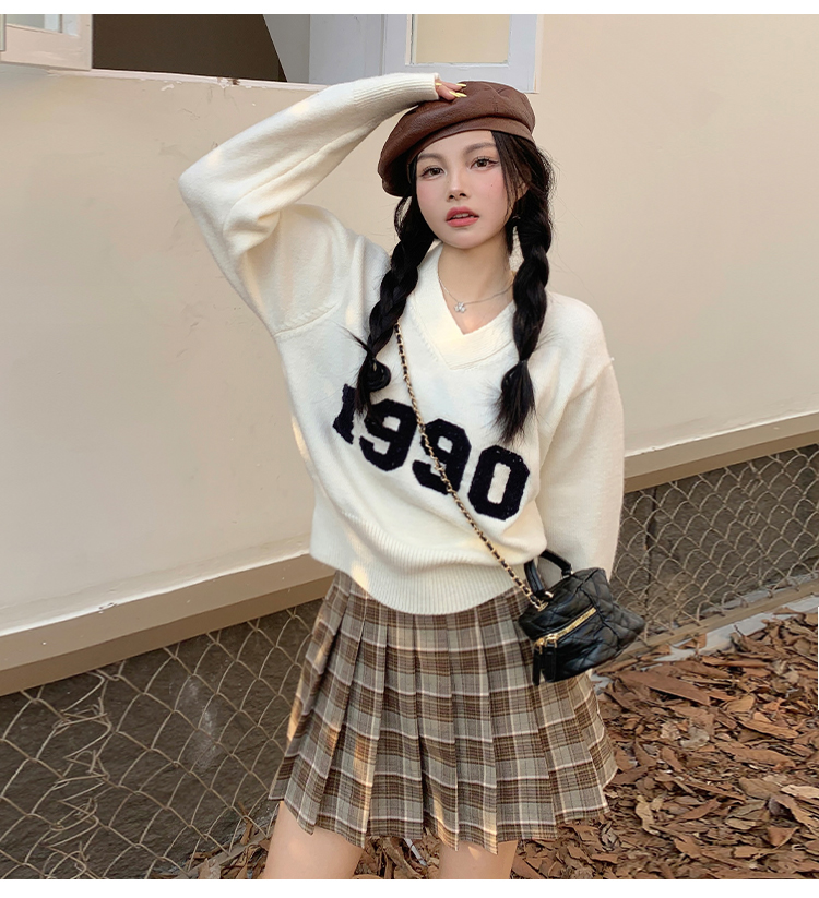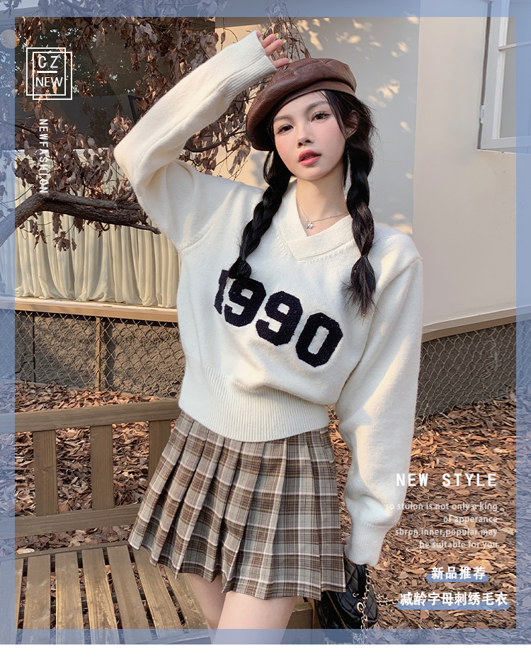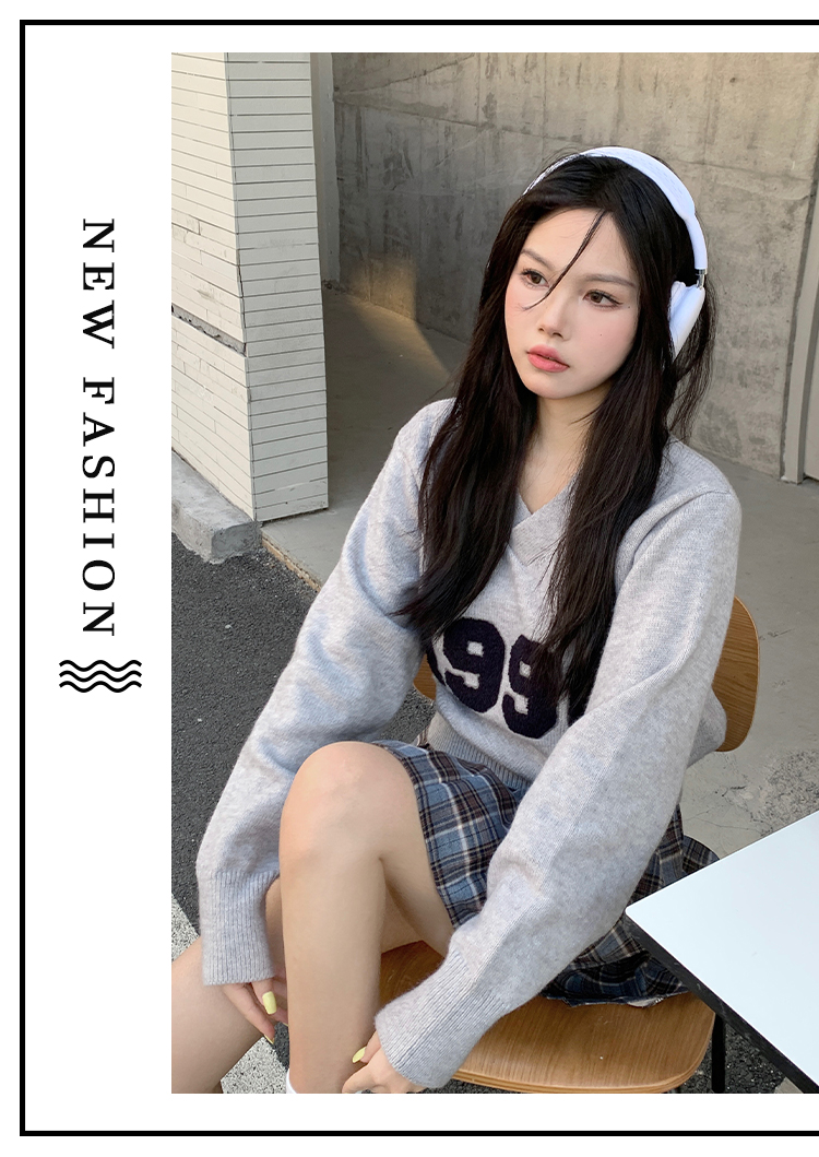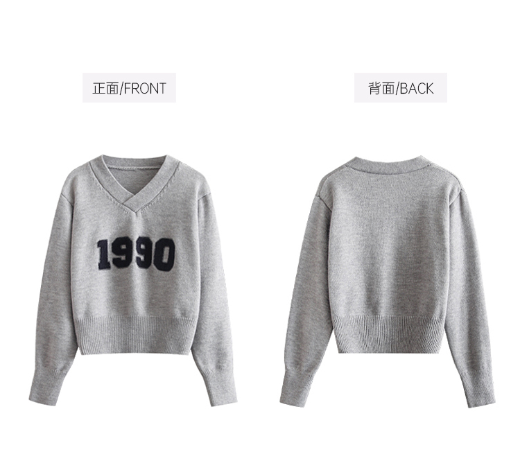 RM32598#韩版学院风减龄百搭V领宽松刺绣字母套头毛衣
