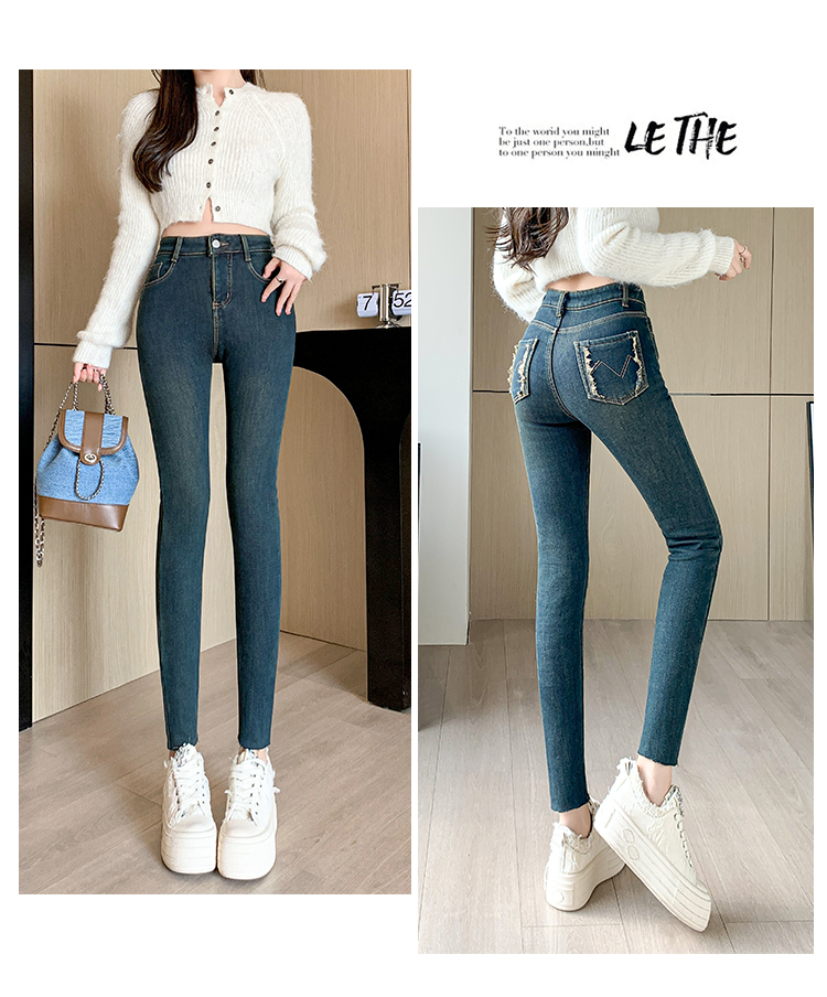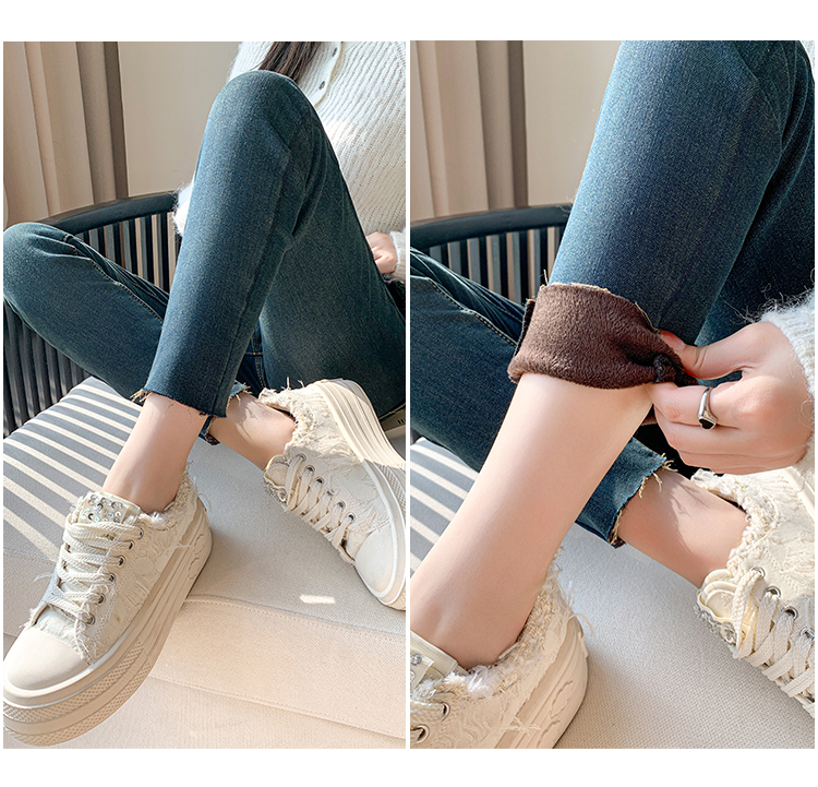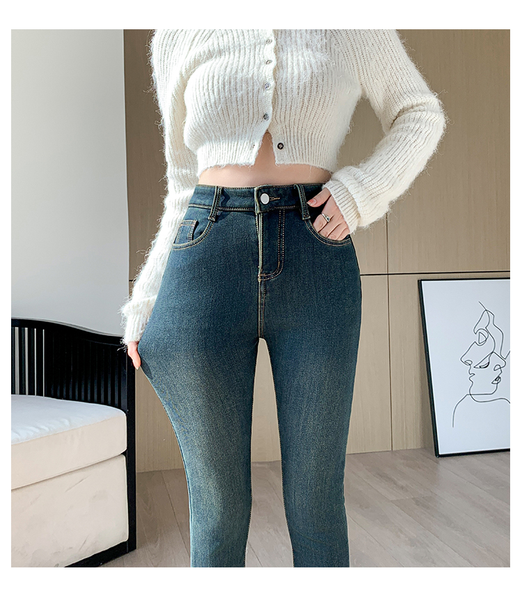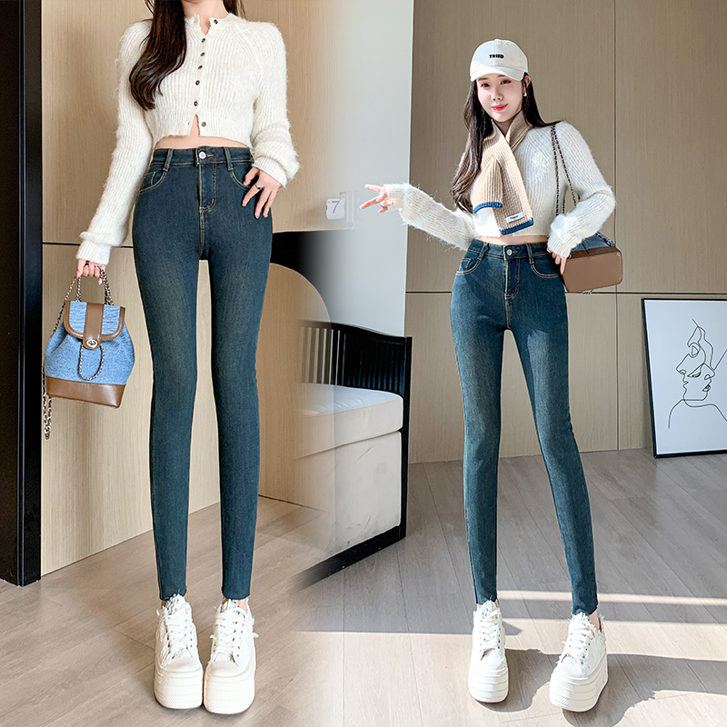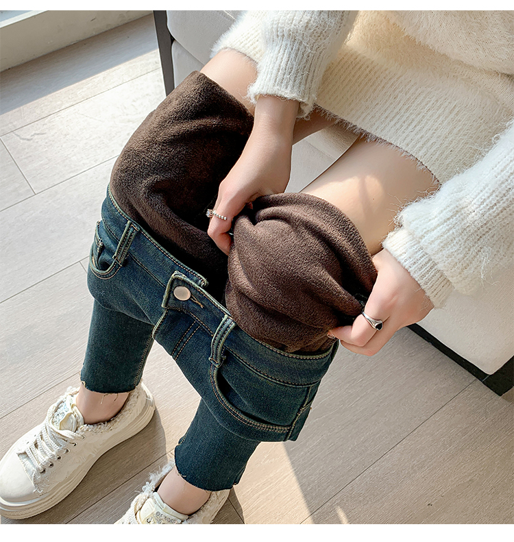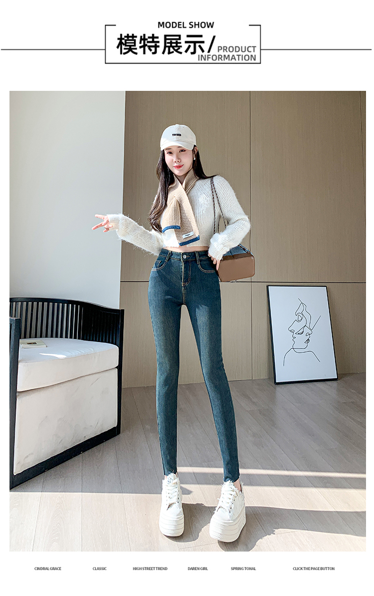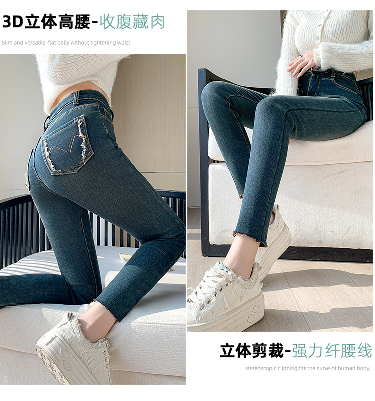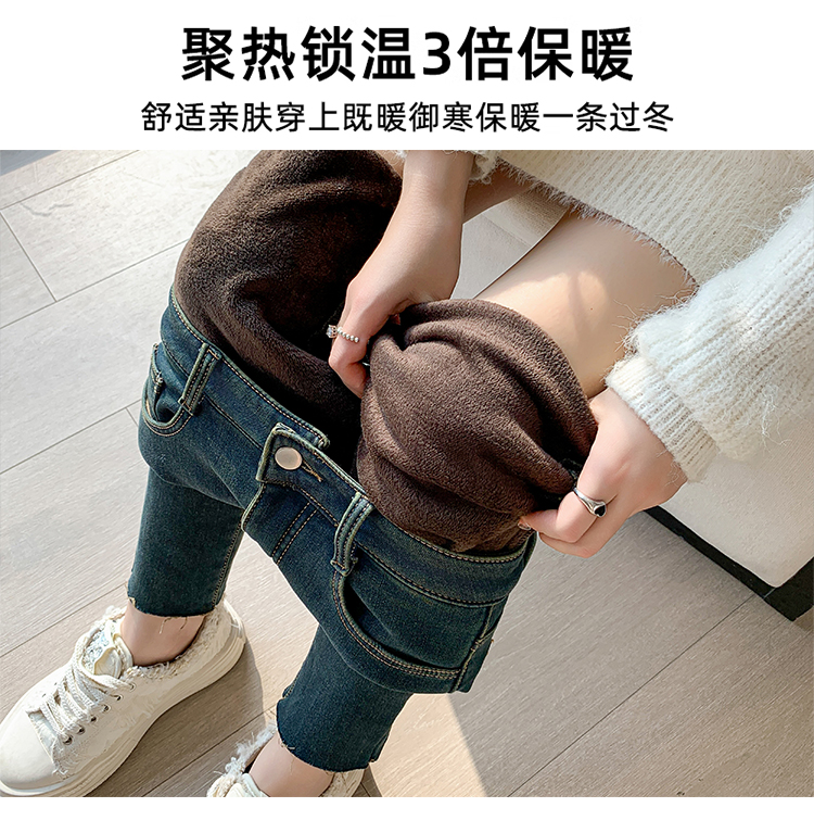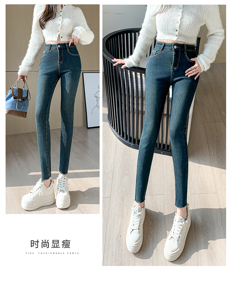 RM32613#牛仔裤女紧身加绒小脚裤 高腰弹性铅笔复古搭配靴子长裤