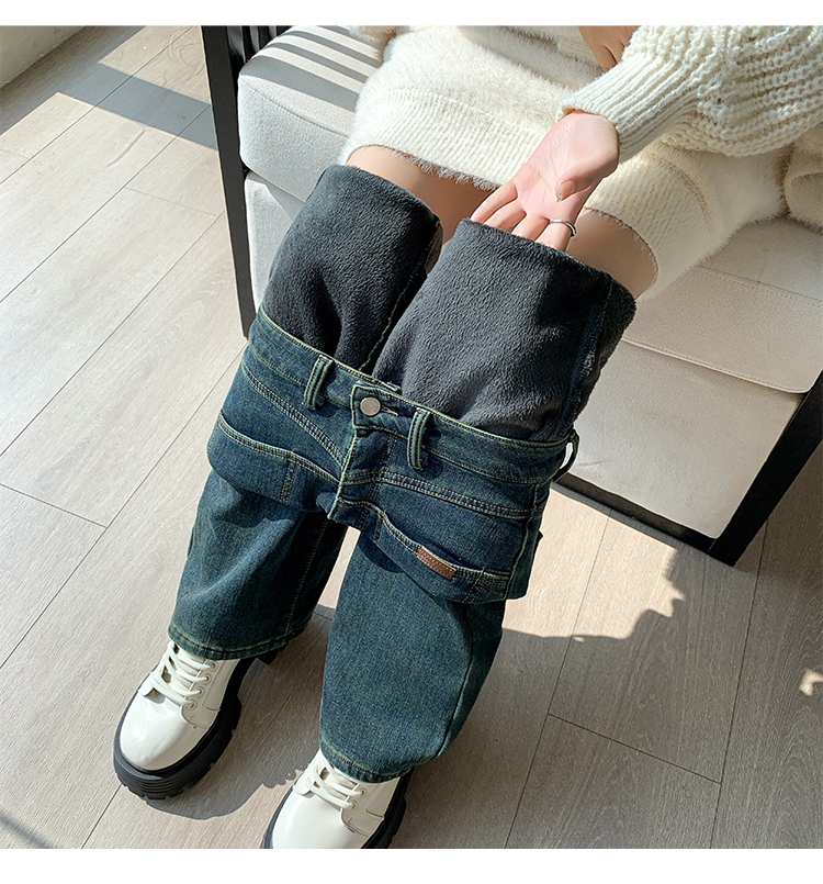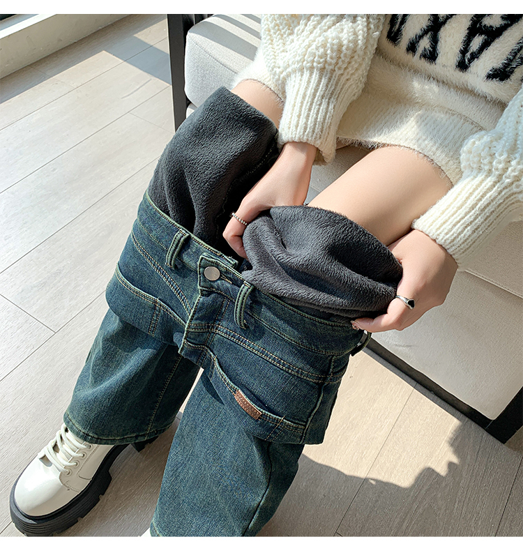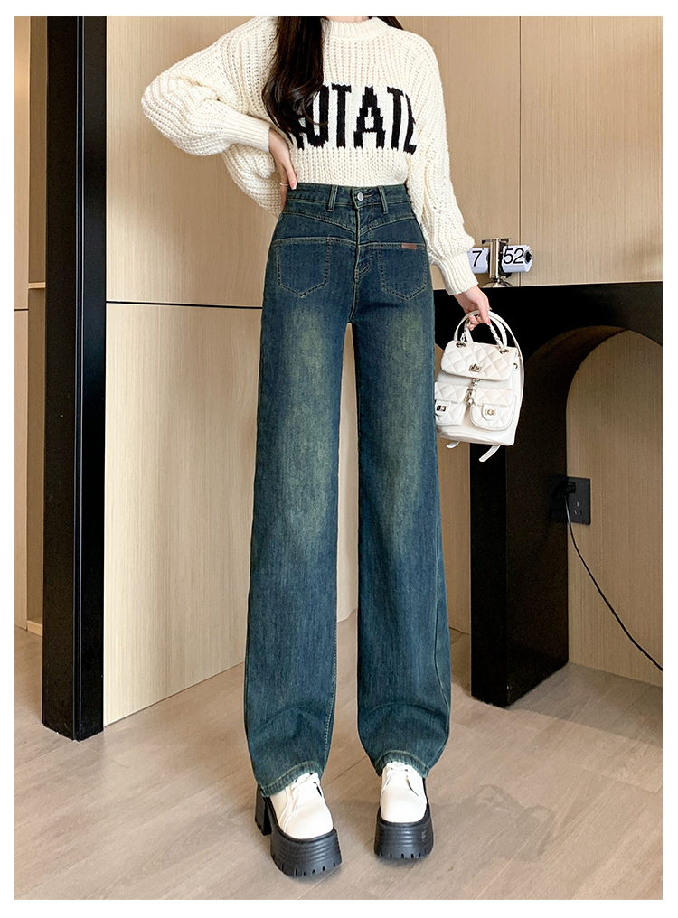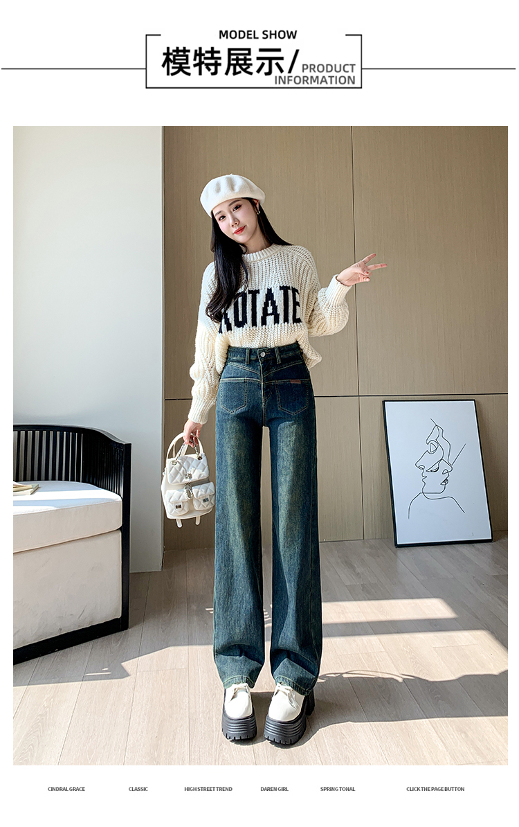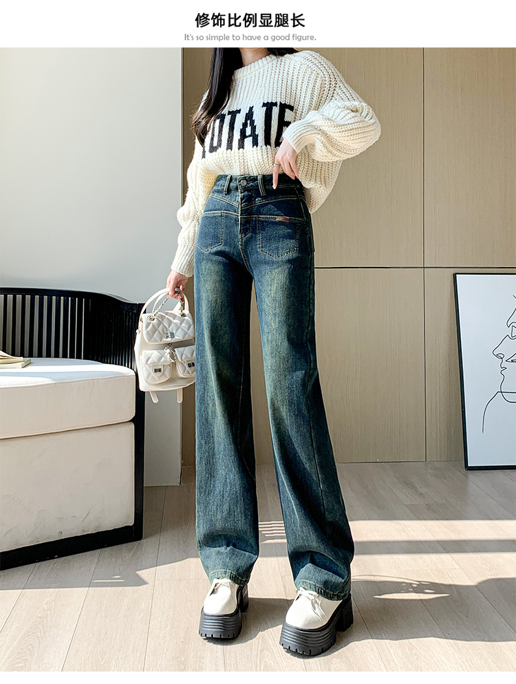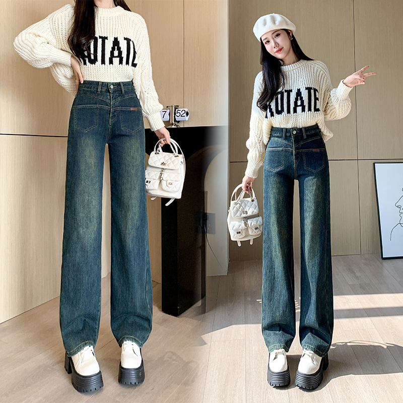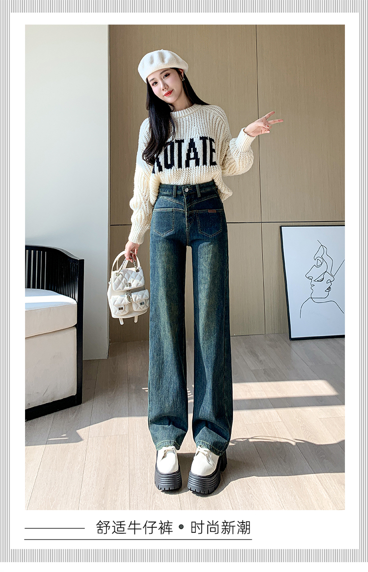 RM32615#水泥色直筒牛仔裤女 高腰显瘦加绒小个子垂感阔腿裤秋冬