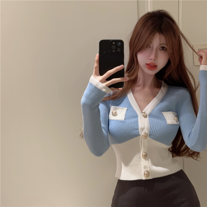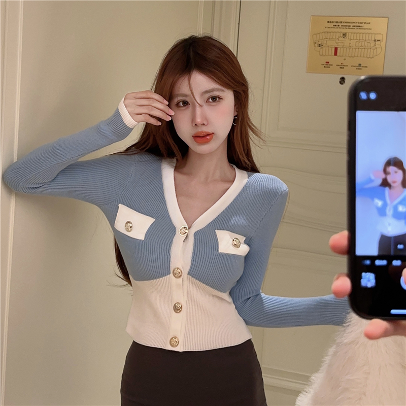 RM32663#小香风针织开衫女秋冬金扣撞色V领修身长袖打底毛衣上衣