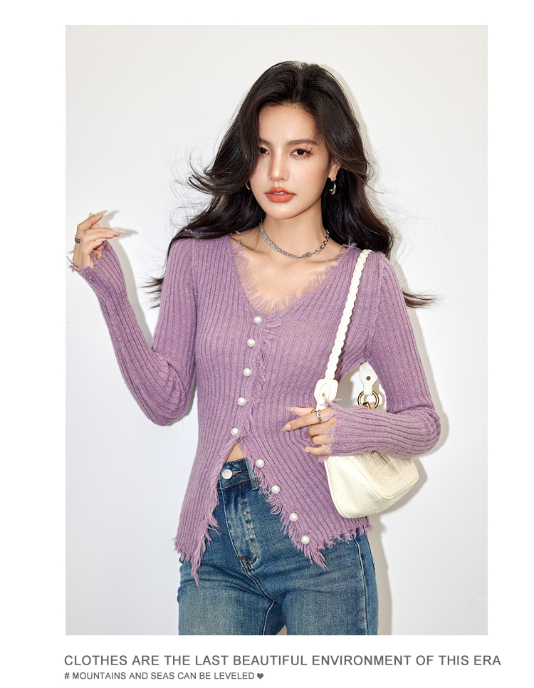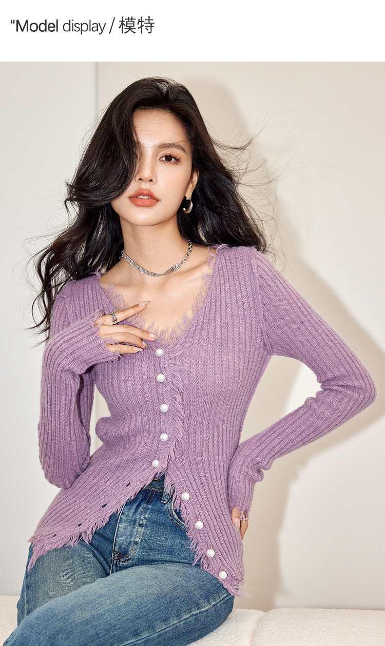 RM32674#新款V领毛衣纯色修身型坑条毛边设计感针织开衫女