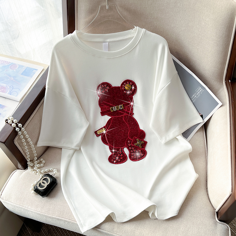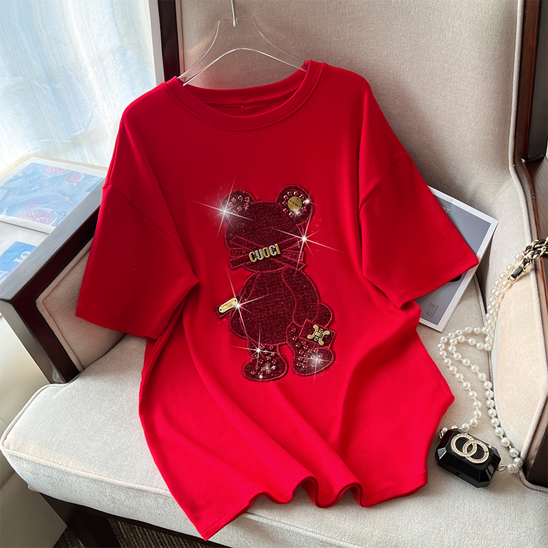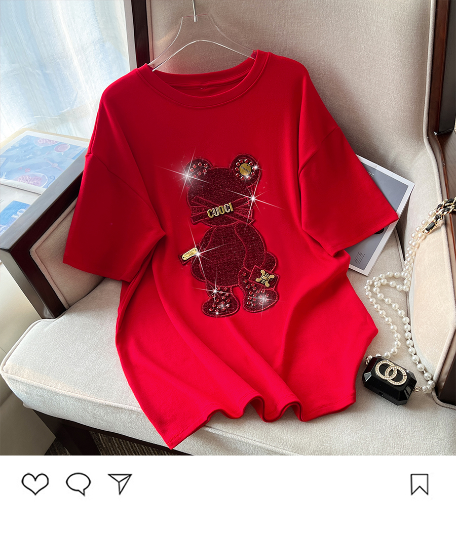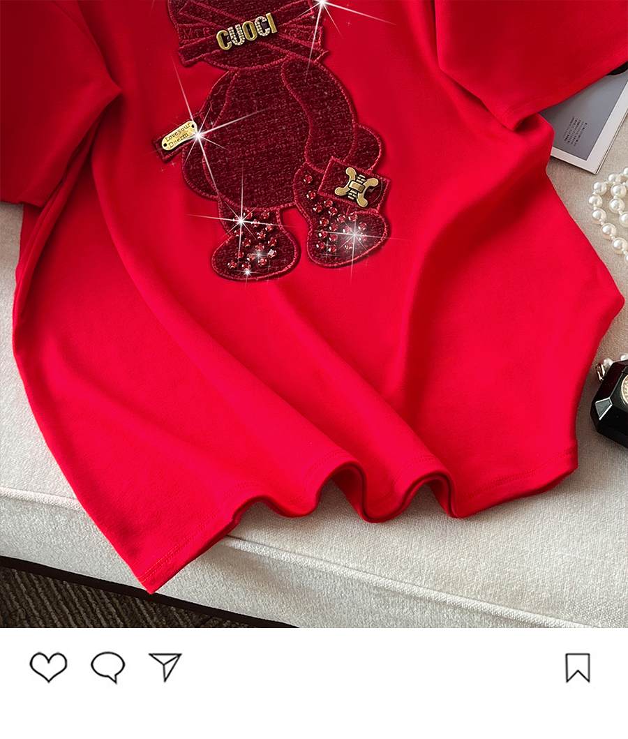 RM32709#新款重工镶钻新年红重磅磨毛纯棉T恤女洋气百搭