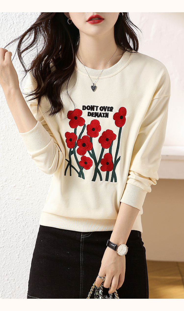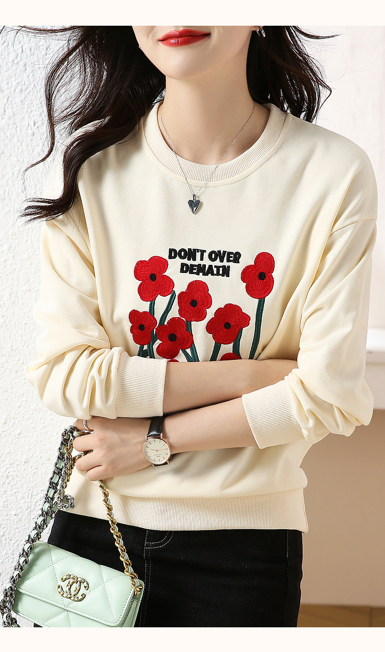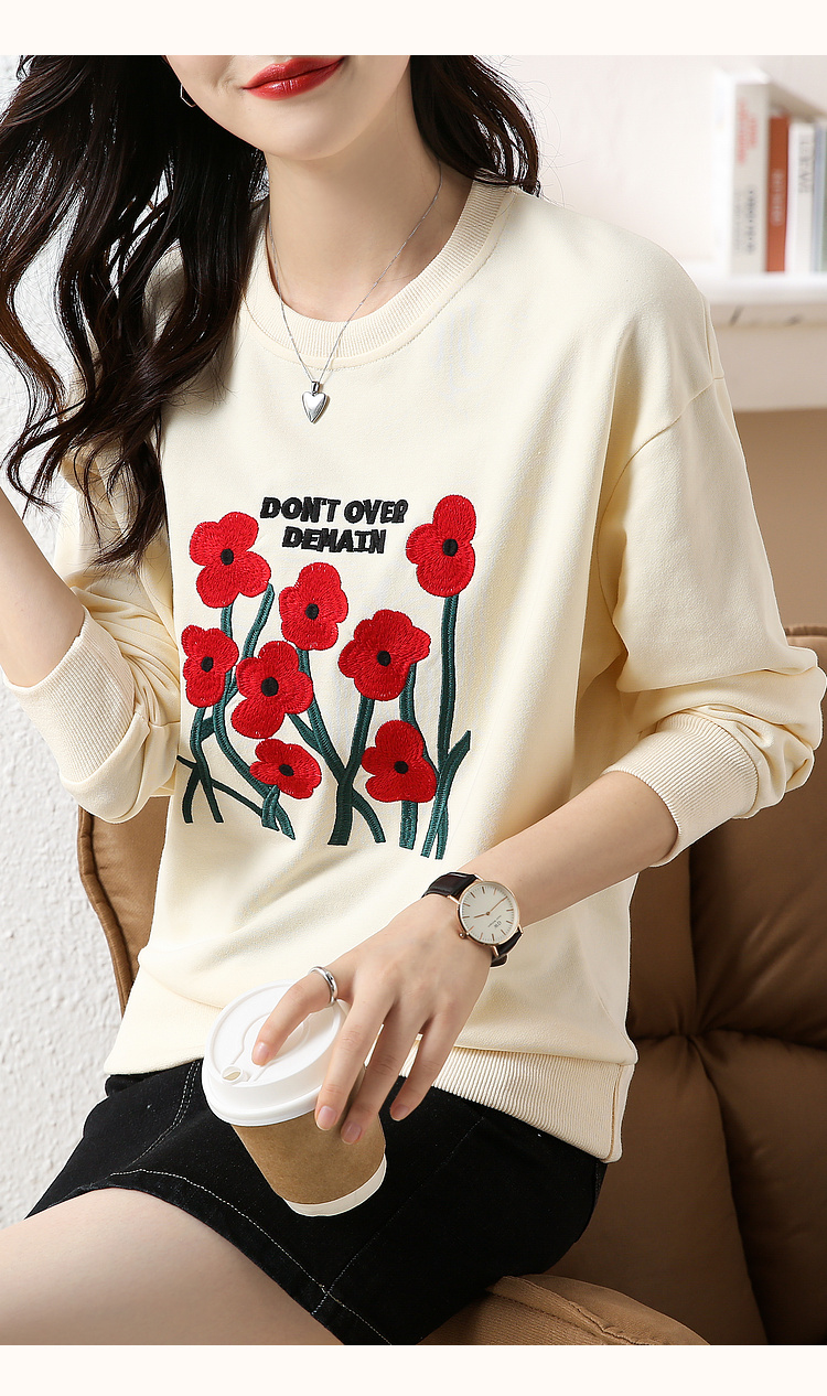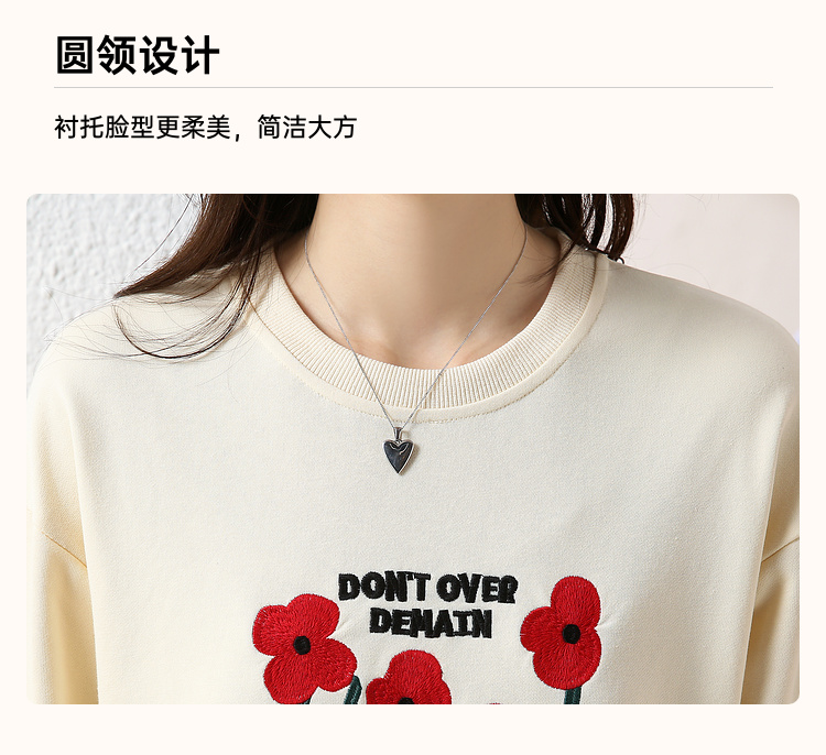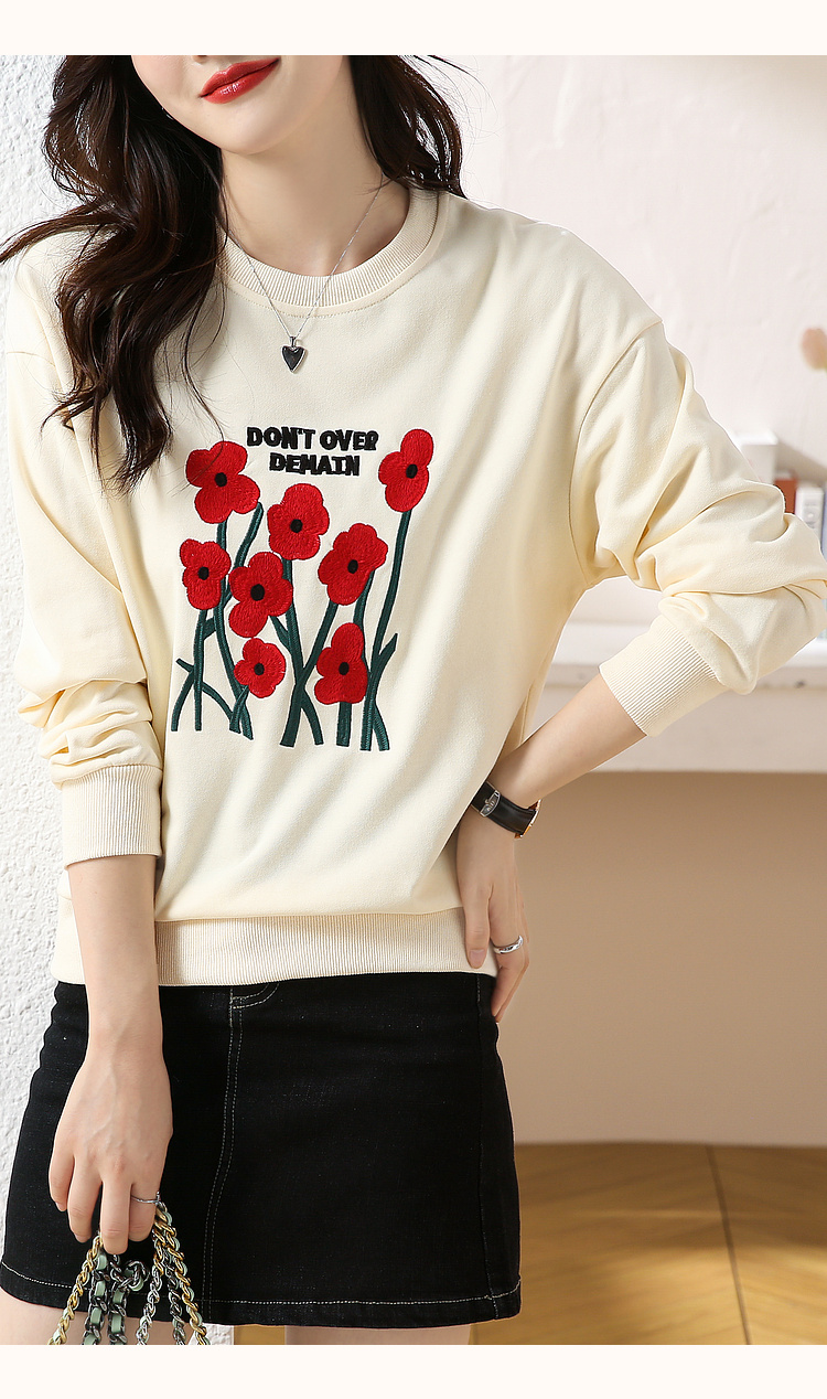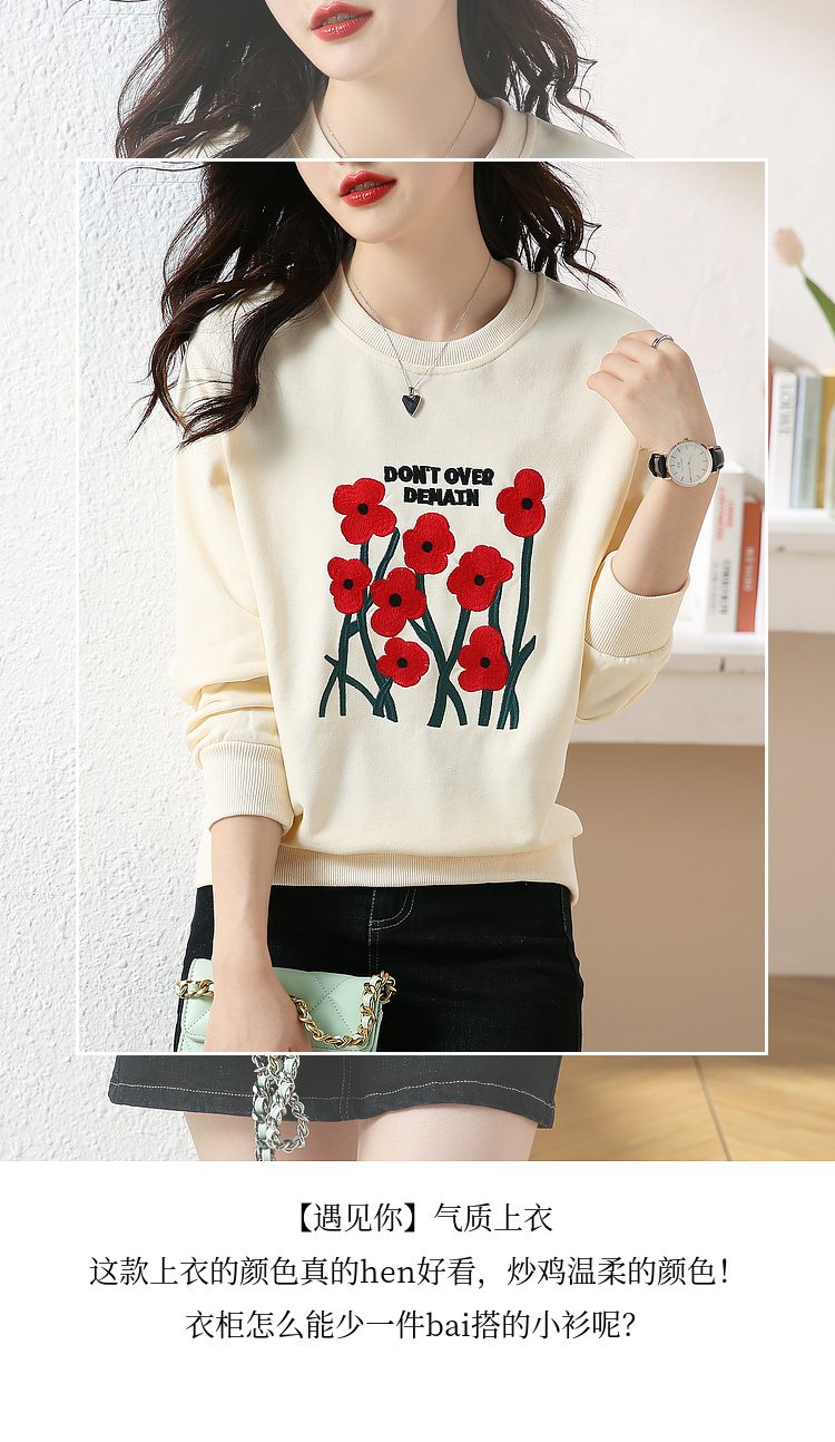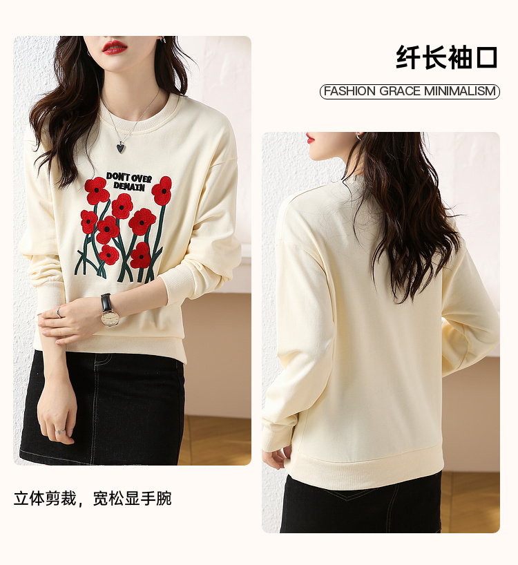 RM32729#绣花白色卫衣女春季新款2024年圆领无帽套头短款显瘦长袖上衣