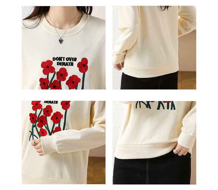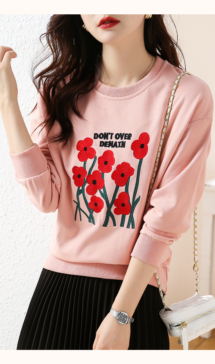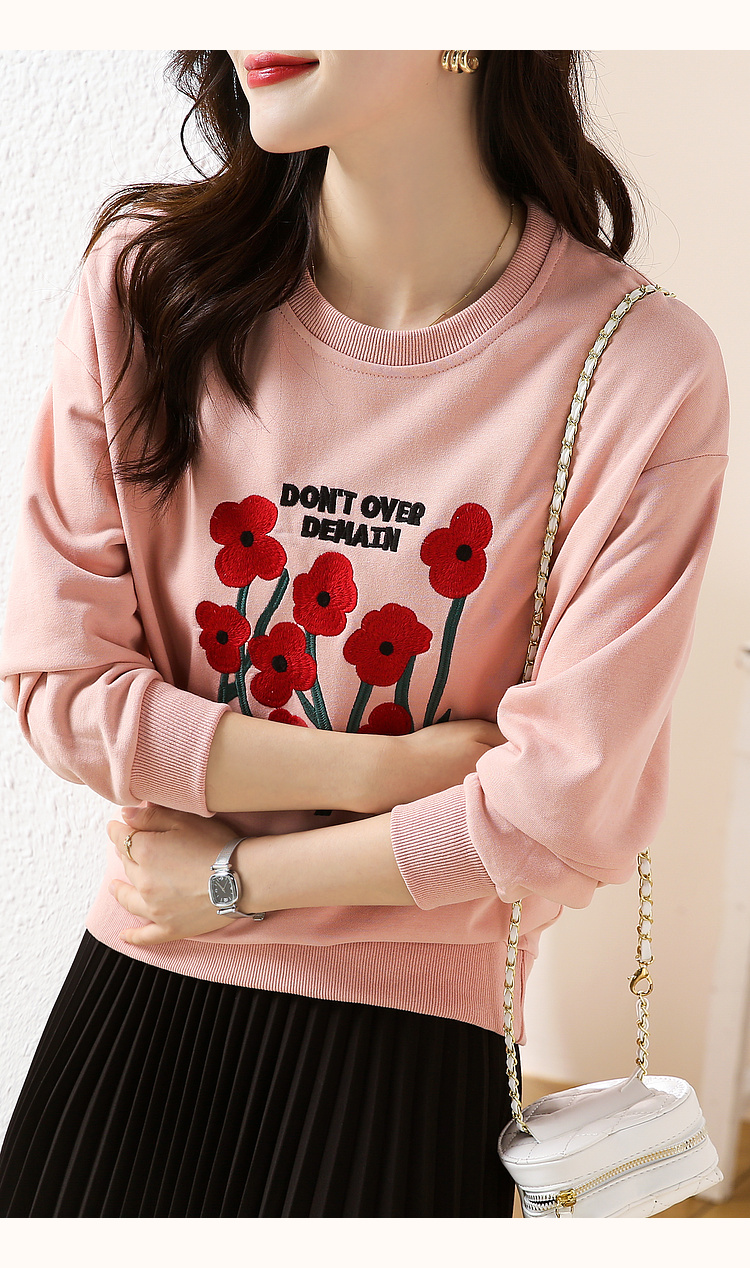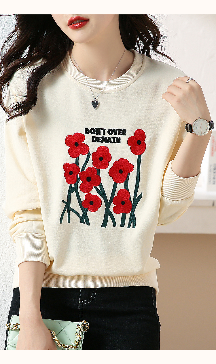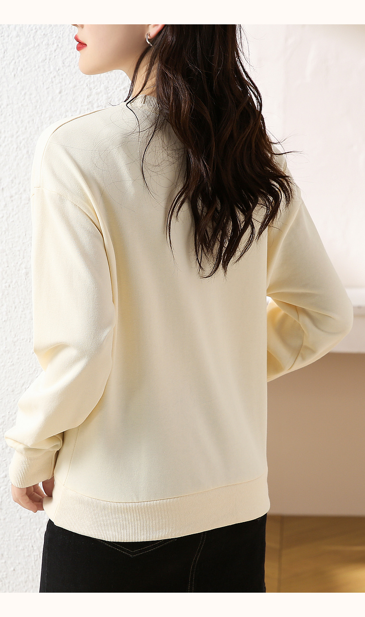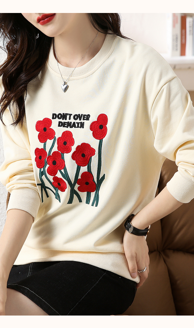 RM32729#绣花白色卫衣女春季新款2024年圆领无帽套头短款显瘦长袖上衣