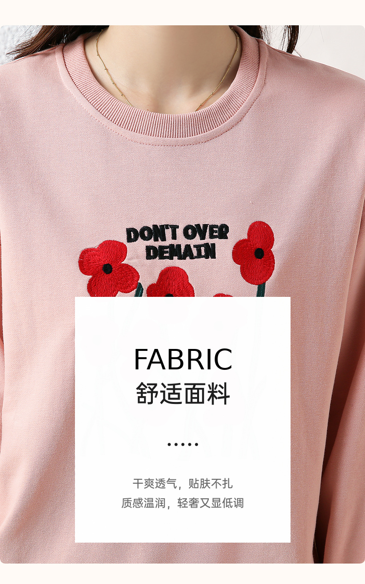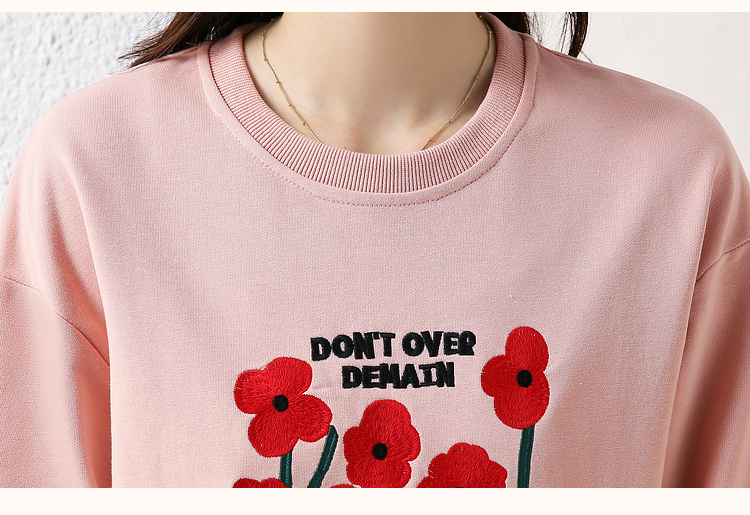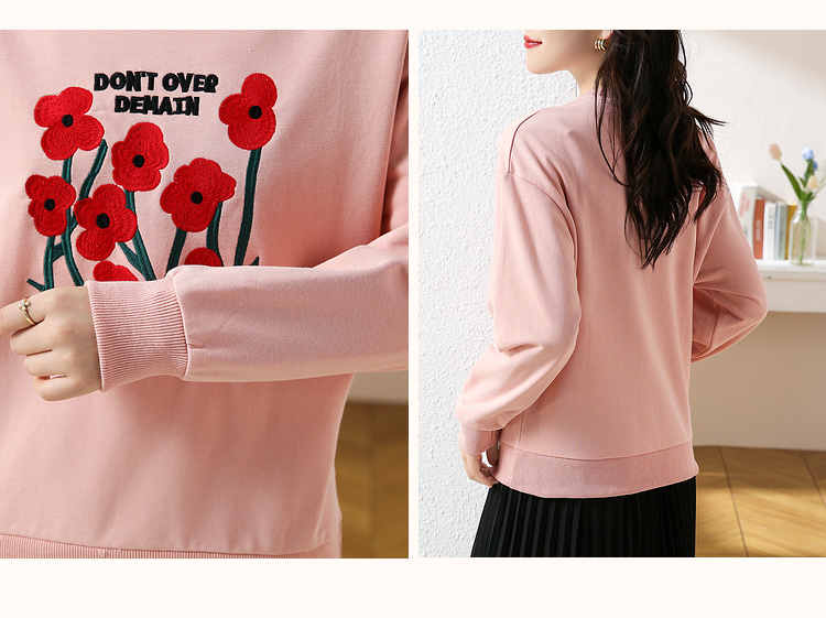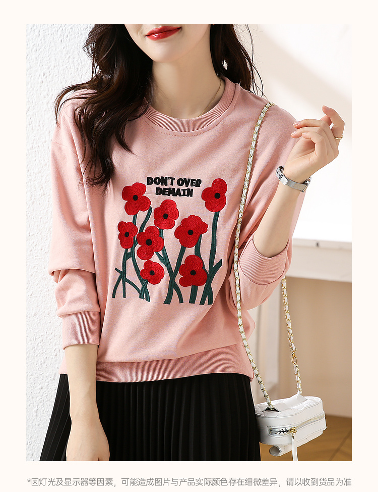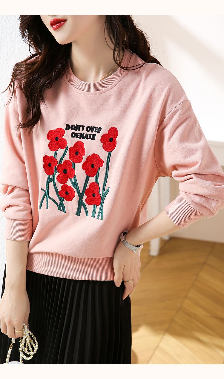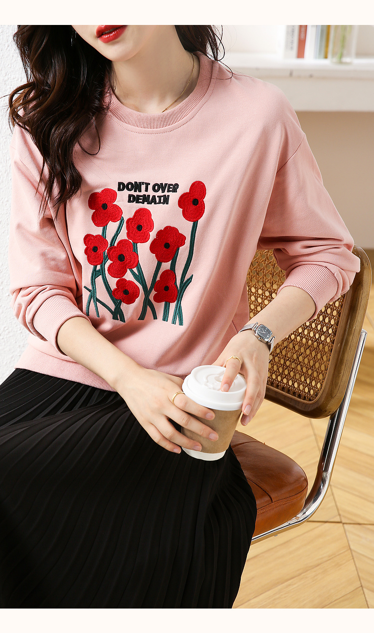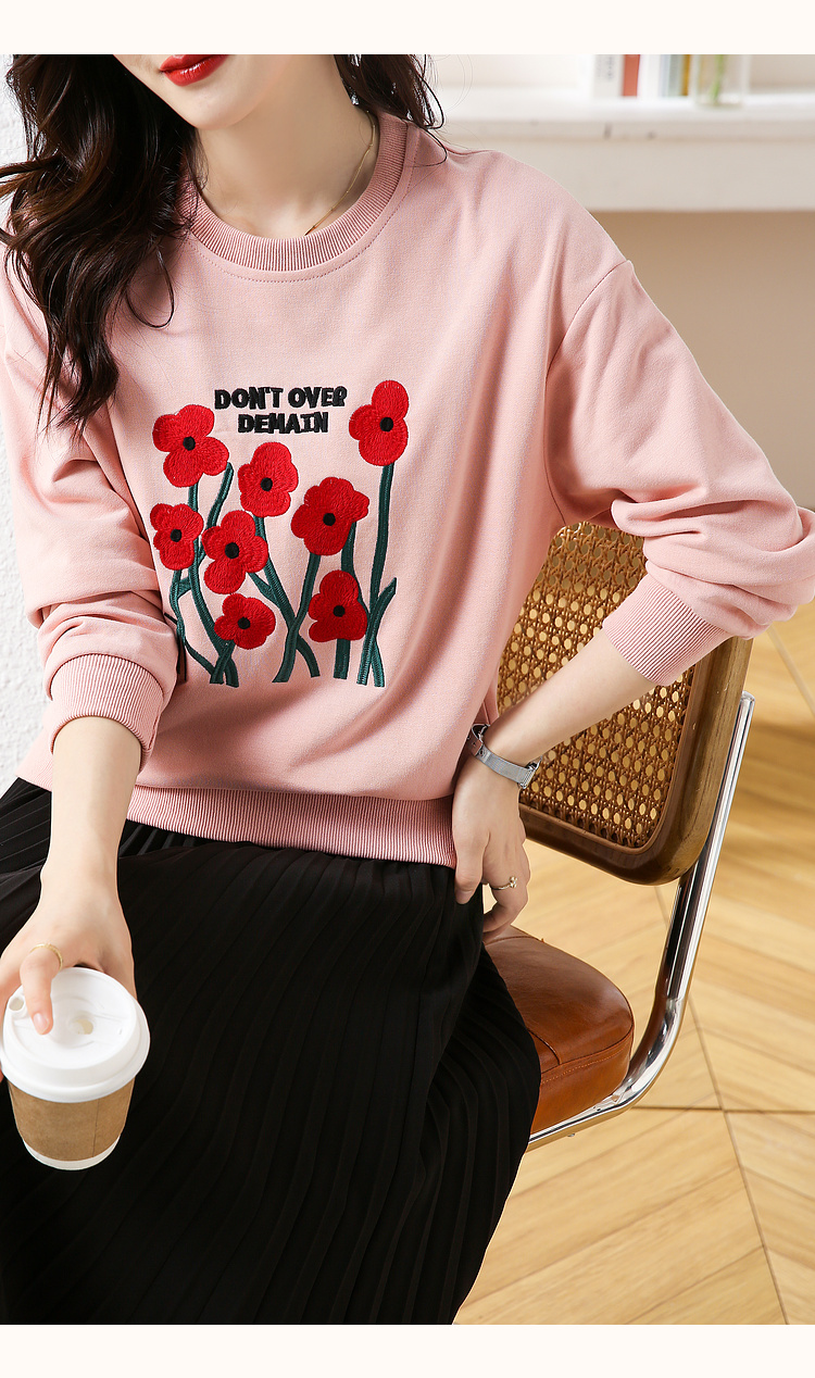 RM32729#绣花白色卫衣女春季新款2024年圆领无帽套头短款显瘦长袖上衣