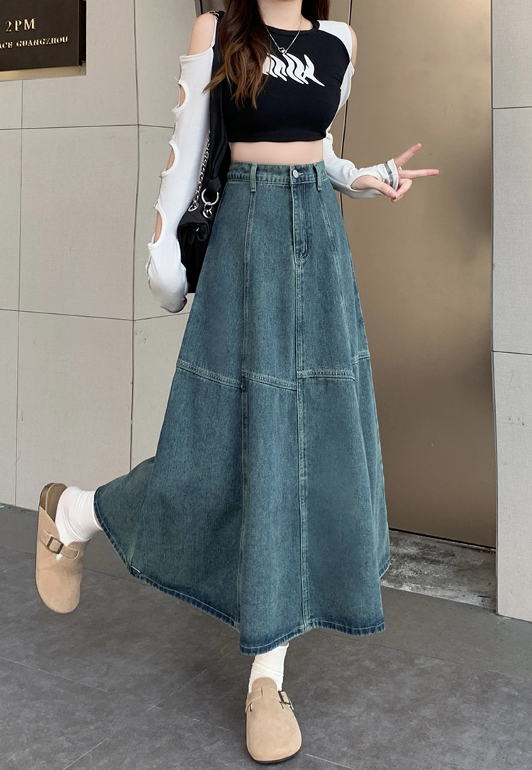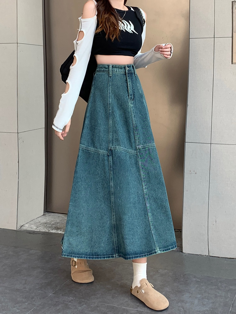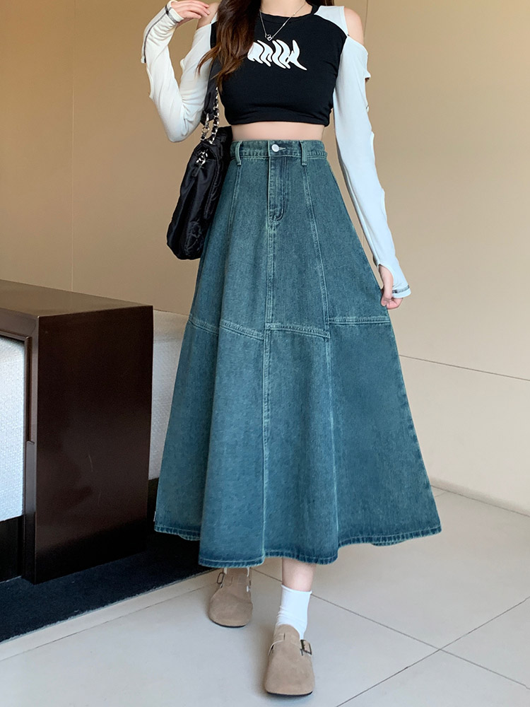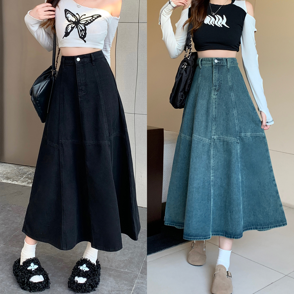RM32765#新款胖mm大码女装高腰宽松复古中长款a字牛仔半身裙