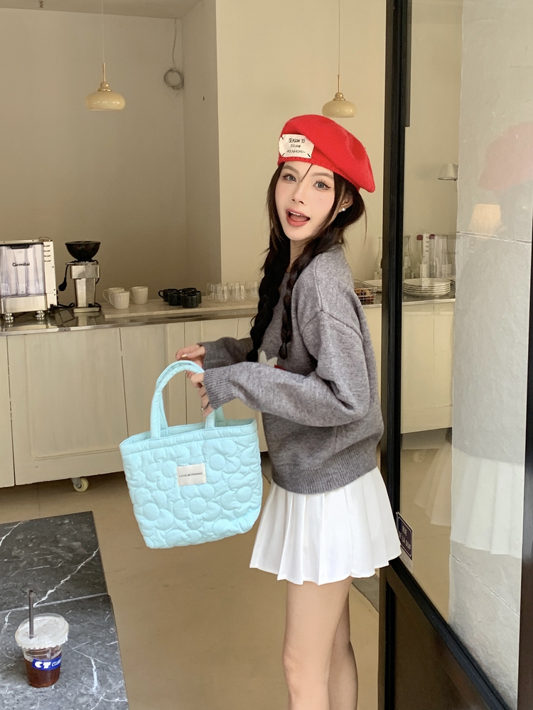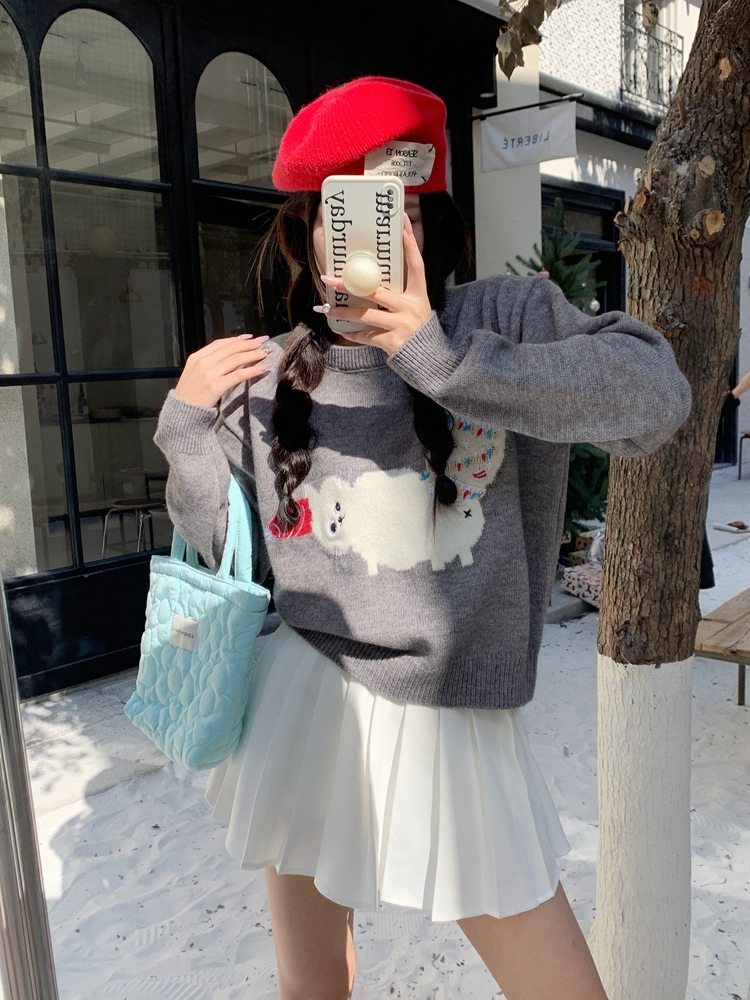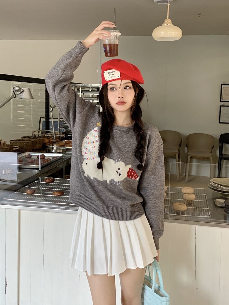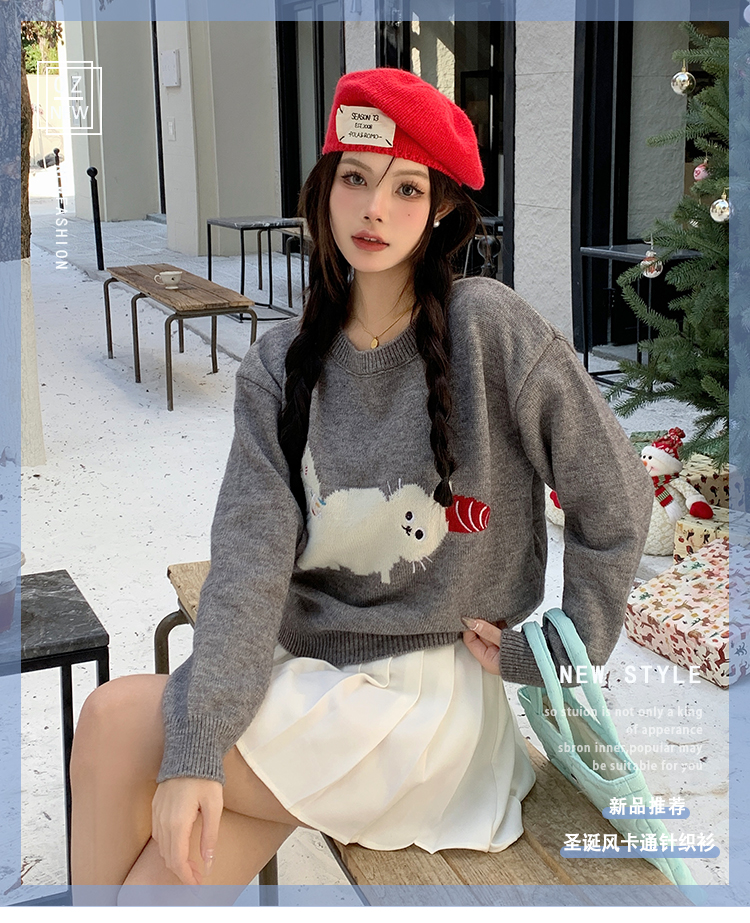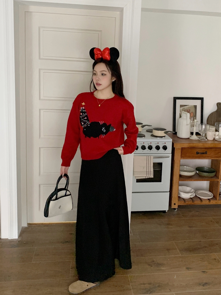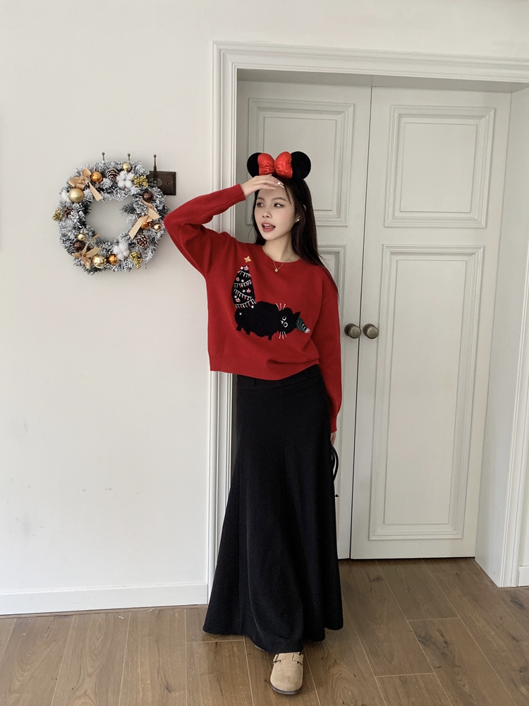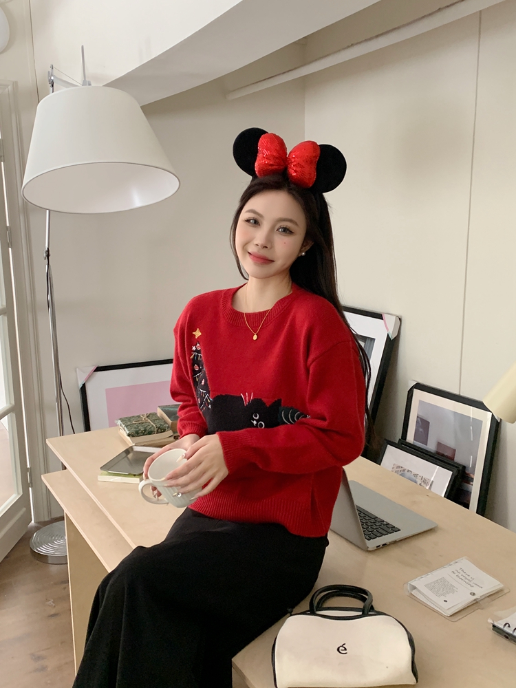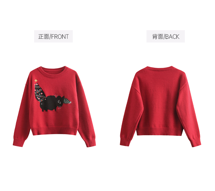 RM32776#甜美圣诞风减龄卡通小猫刺绣圆领套头针织毛衣
