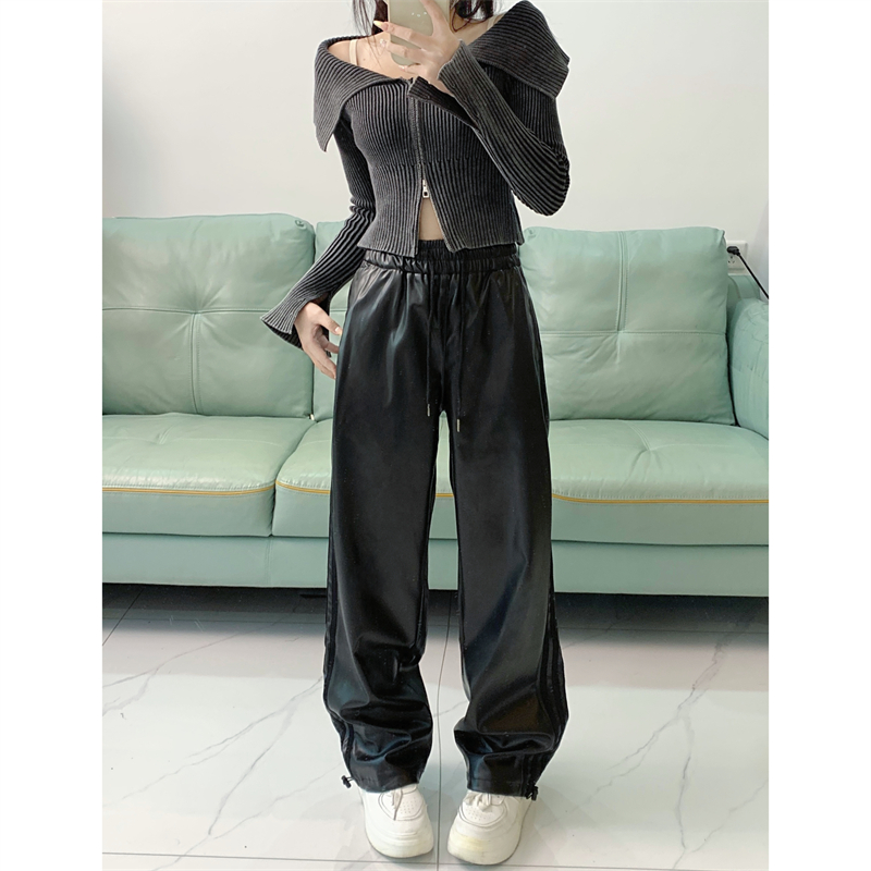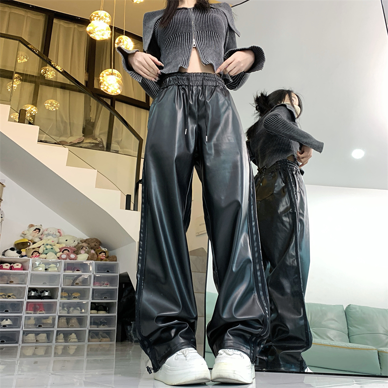 RM32825#直筒裤子女 新款显瘦束脚休闲设计感阔腿pu皮长裤潮