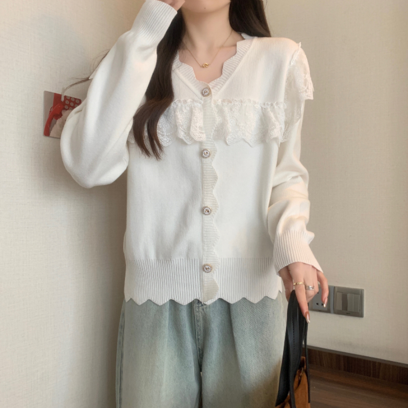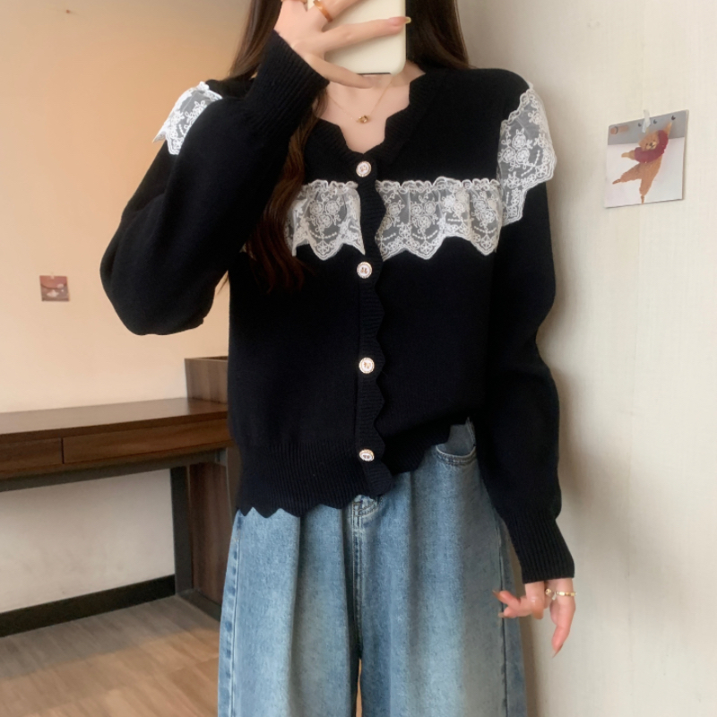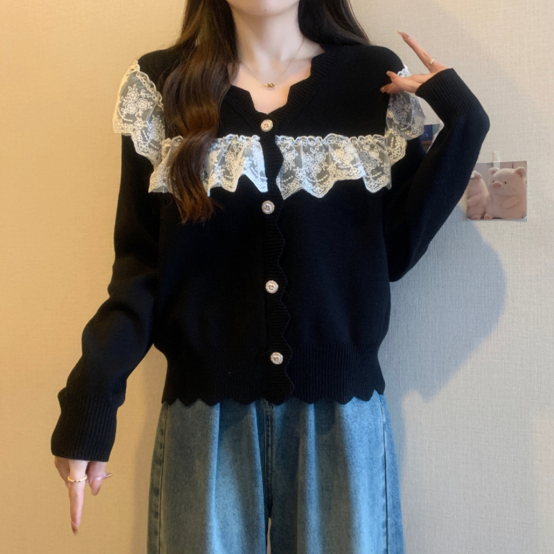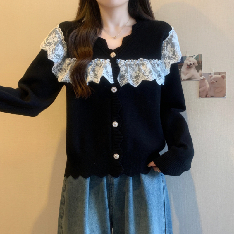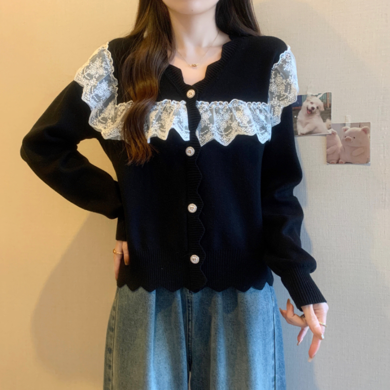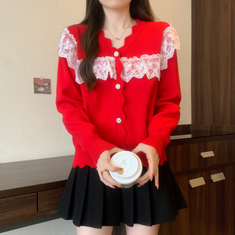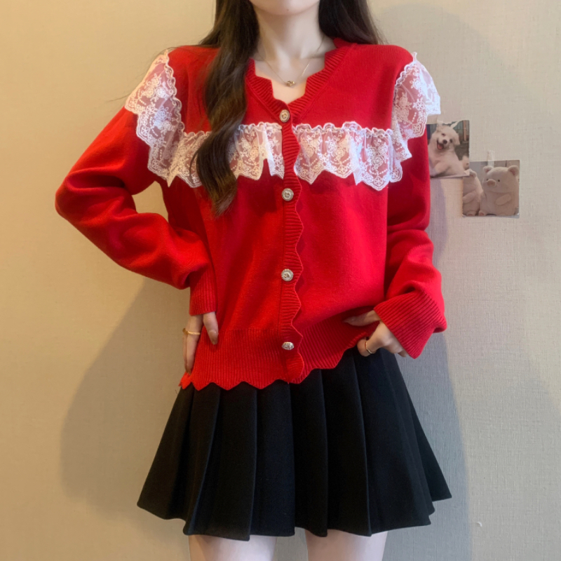 RM32913#蕾丝拼接娃娃领甜美套头毛衣女宽松外穿2023新款秋冬红色圣诞女装