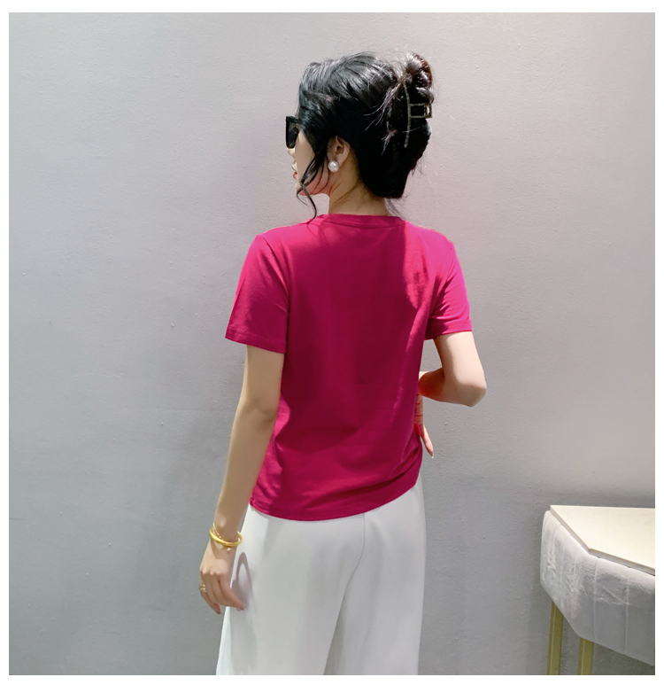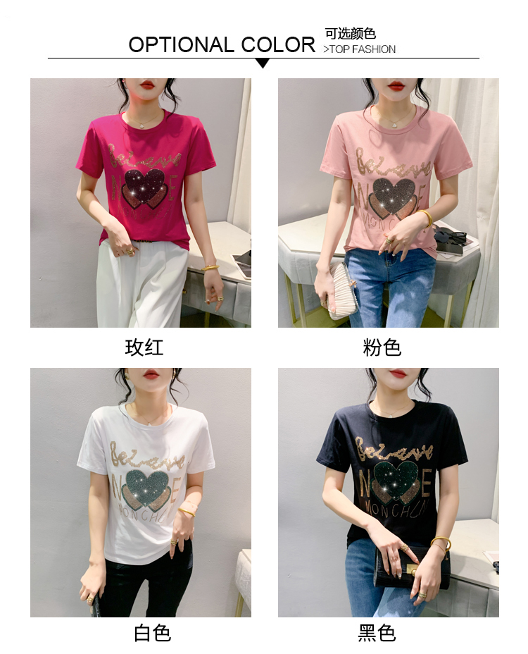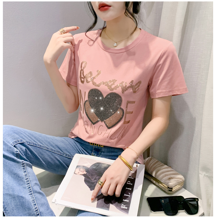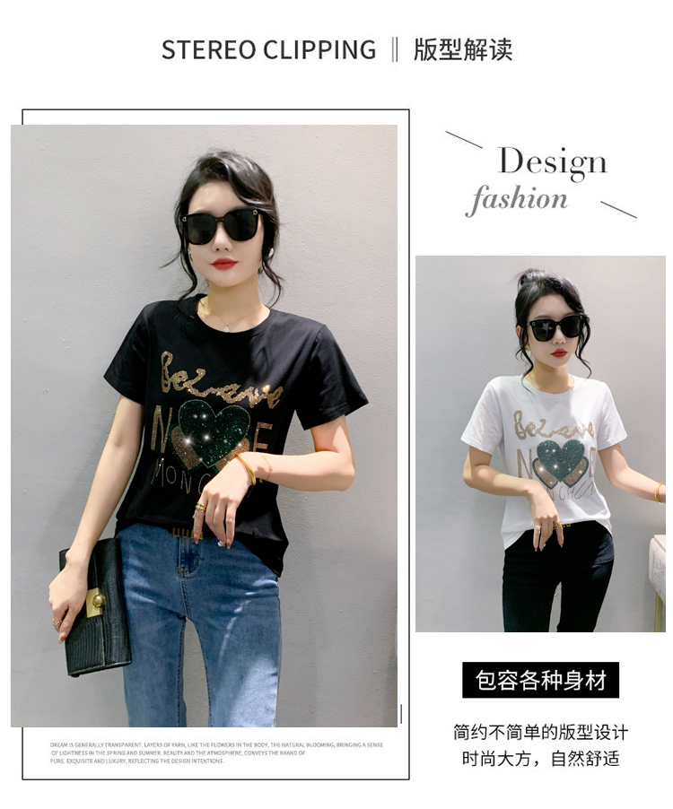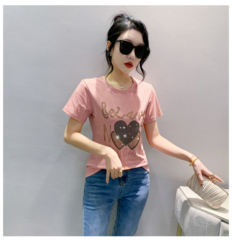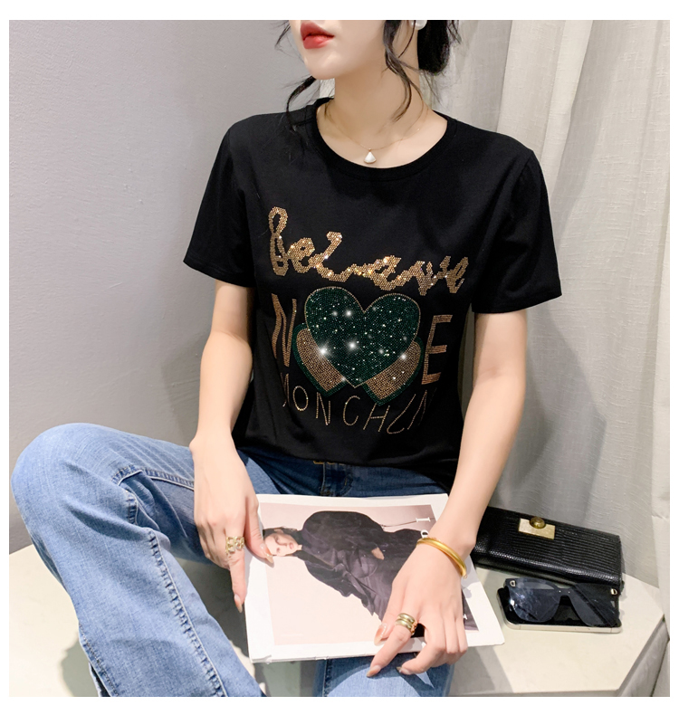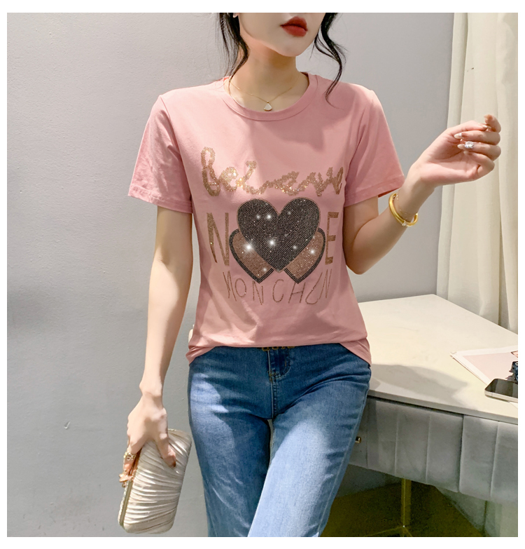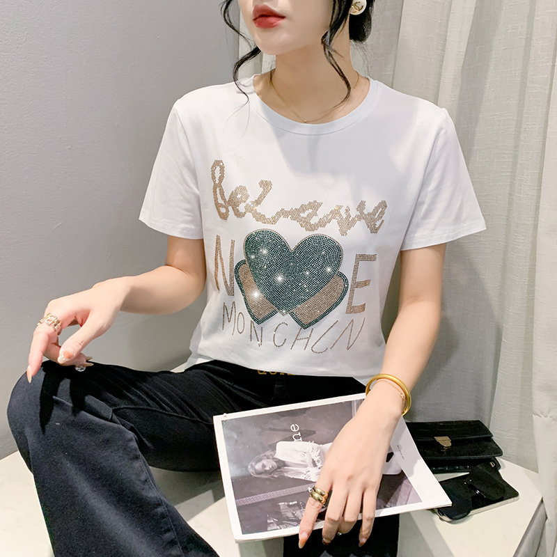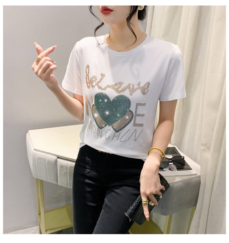 RM32953#镶钻 夏季时尚显瘦圆领高级重工烫钻百搭短袖女t恤