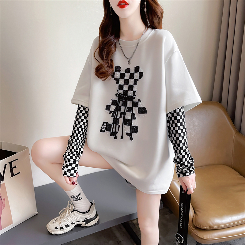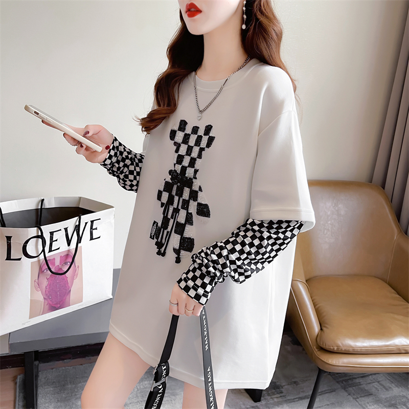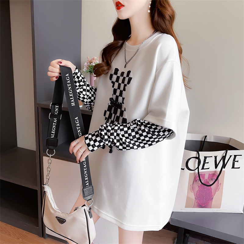 RM33192#新款 宽松双面德绒圆领拼接长袖打底衫T恤女