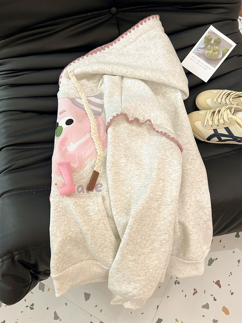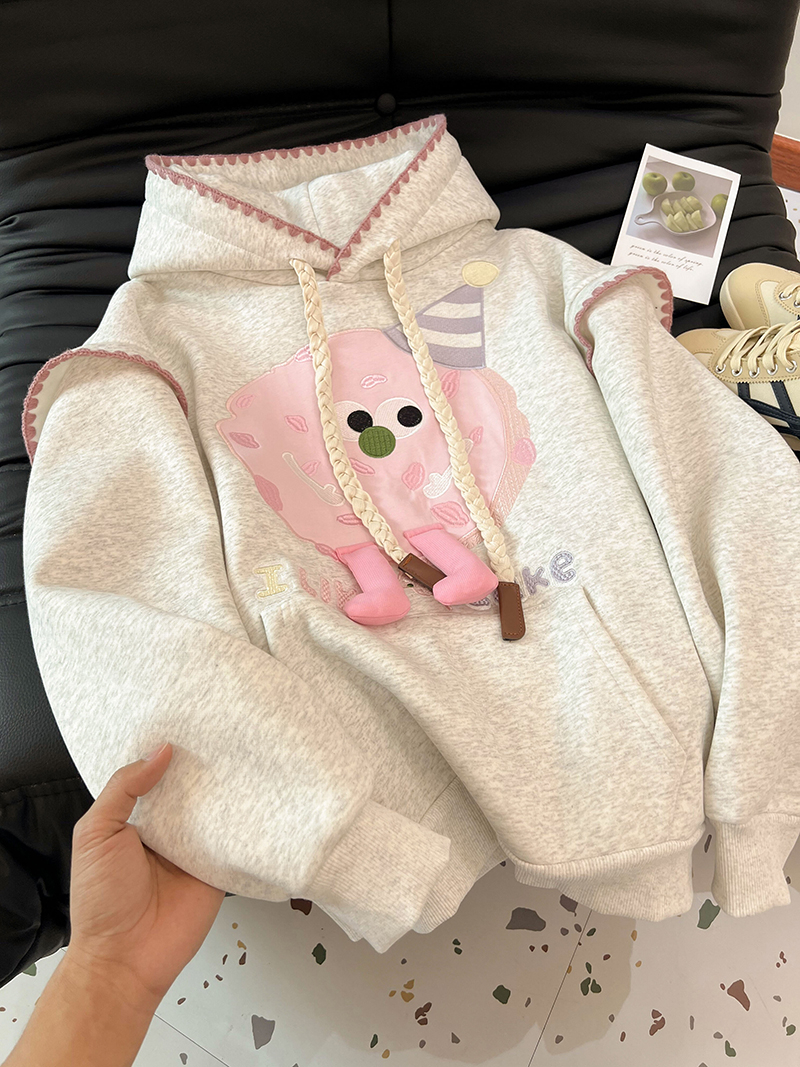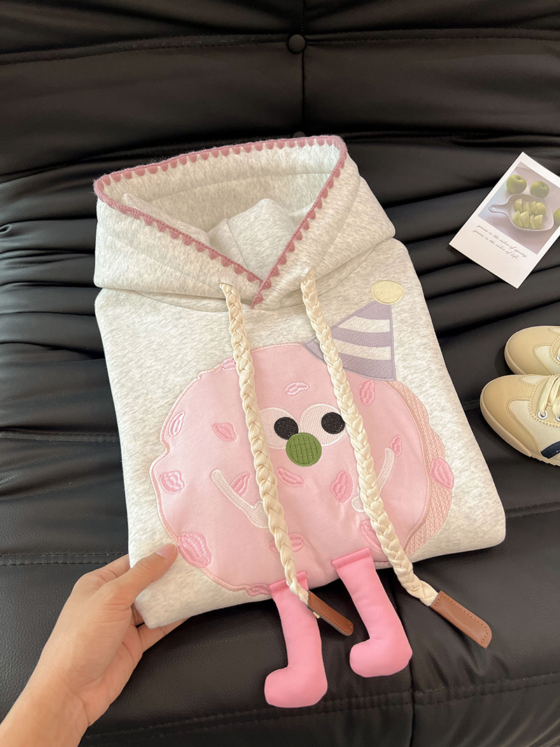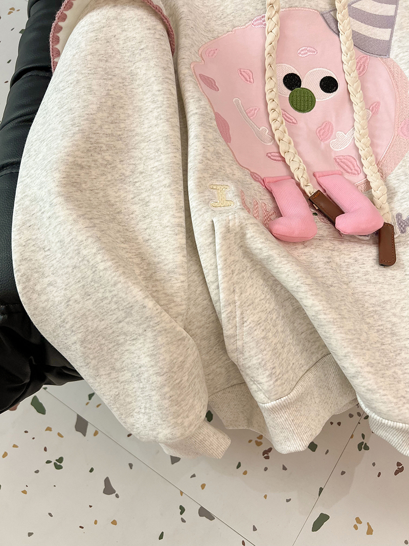 RM33194#韩版宽松华棉复合连帽卡通刺绣中长款大码加绒卫衣女