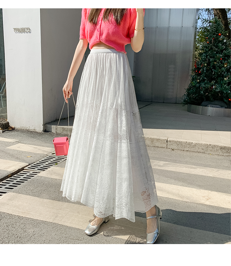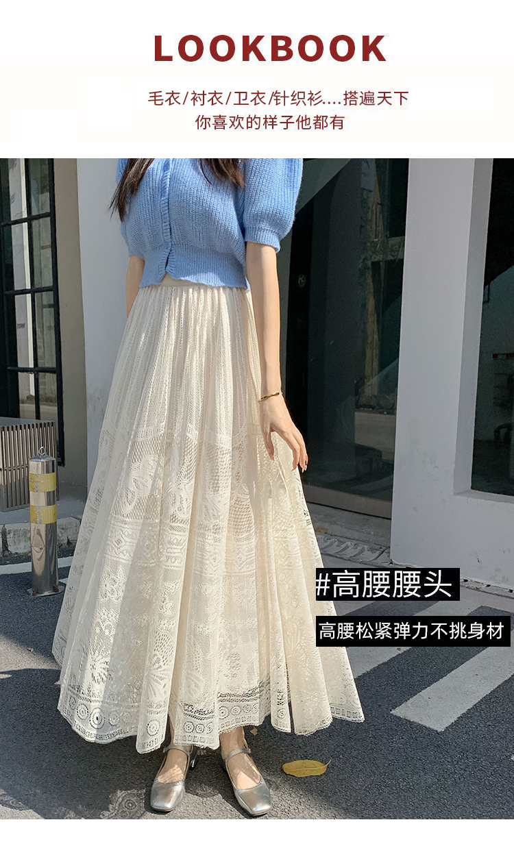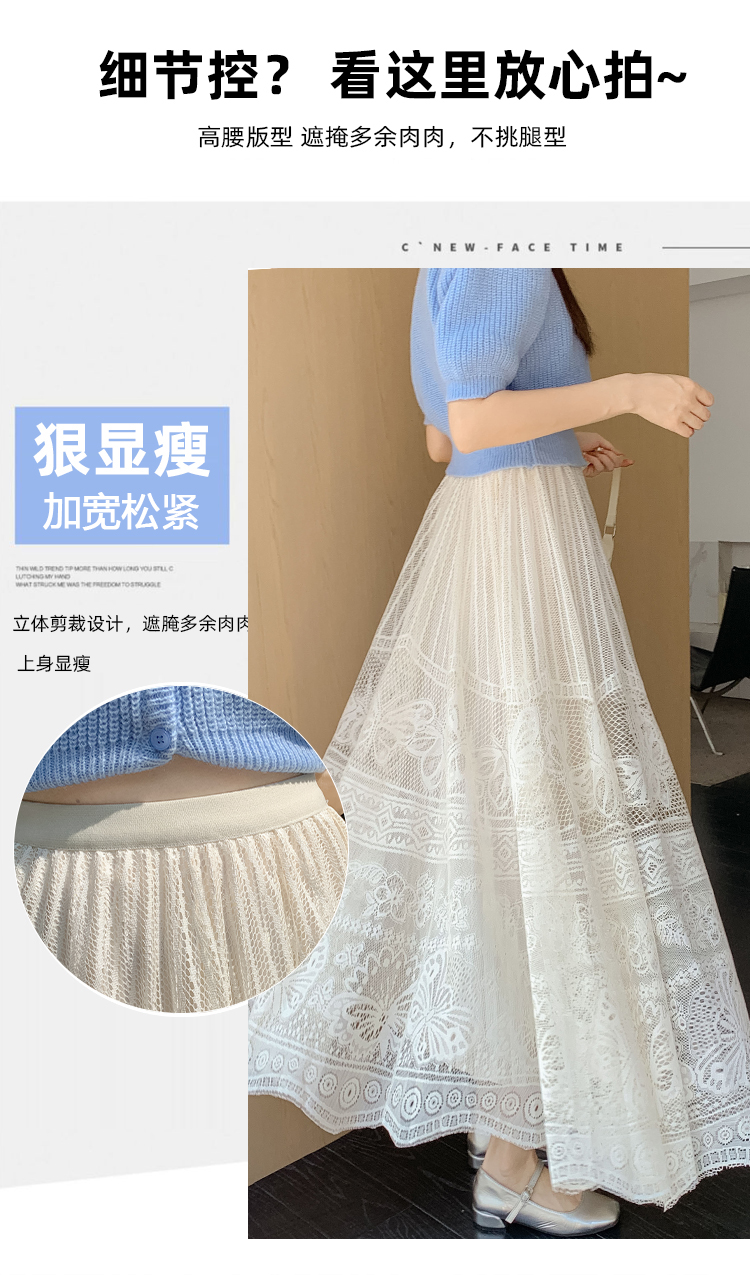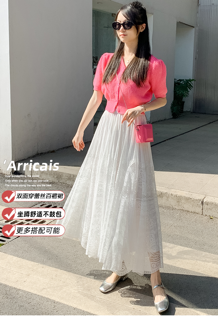 RM33227#法式蕾丝半身裙女春夏高腰中长款a字裙气质垂感百褶裙大摆镂空裙