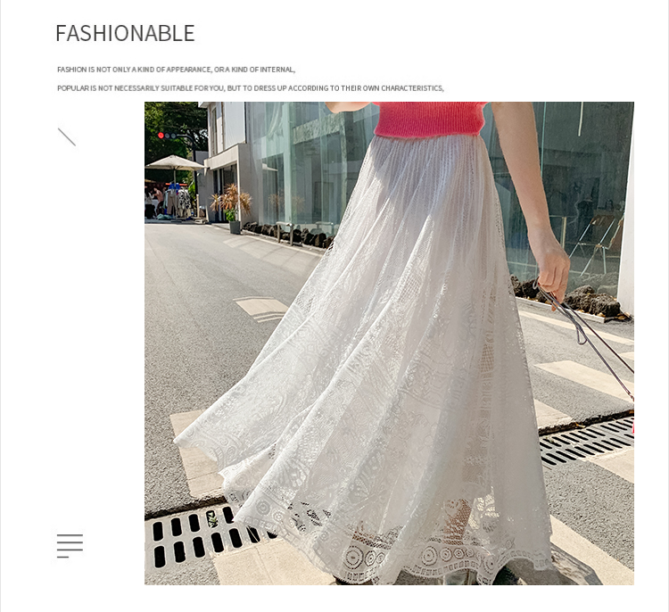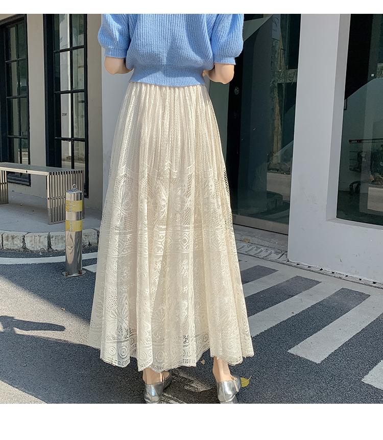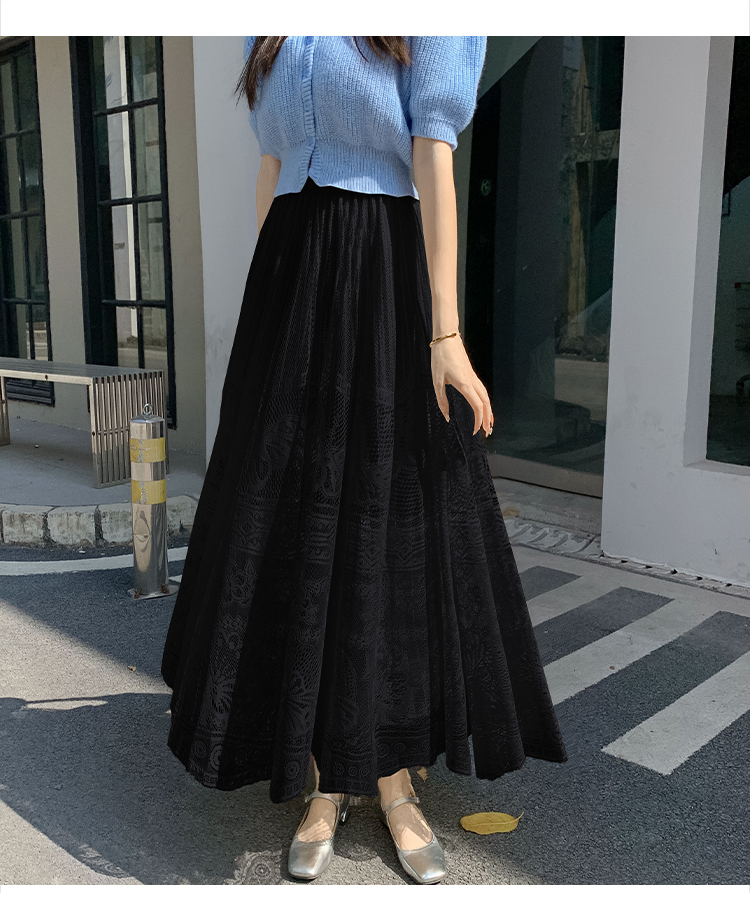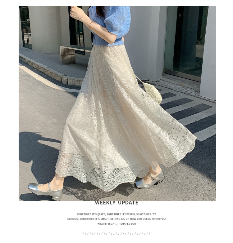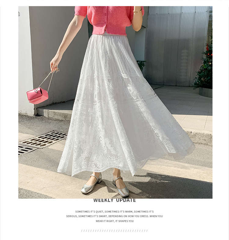 RM33227#法式蕾丝半身裙女春夏高腰中长款a字裙气质垂感百褶裙大摆镂空裙