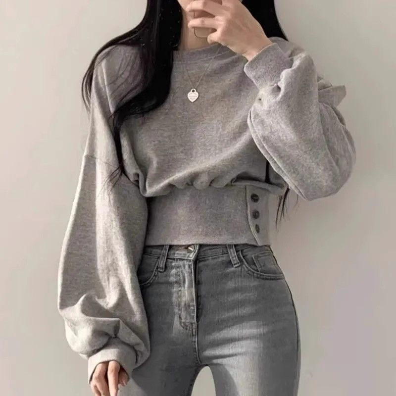 RM33396#鱼鳞布 小众设计感圆领收腰上衣显瘦长袖短款套头纯色卫衣女