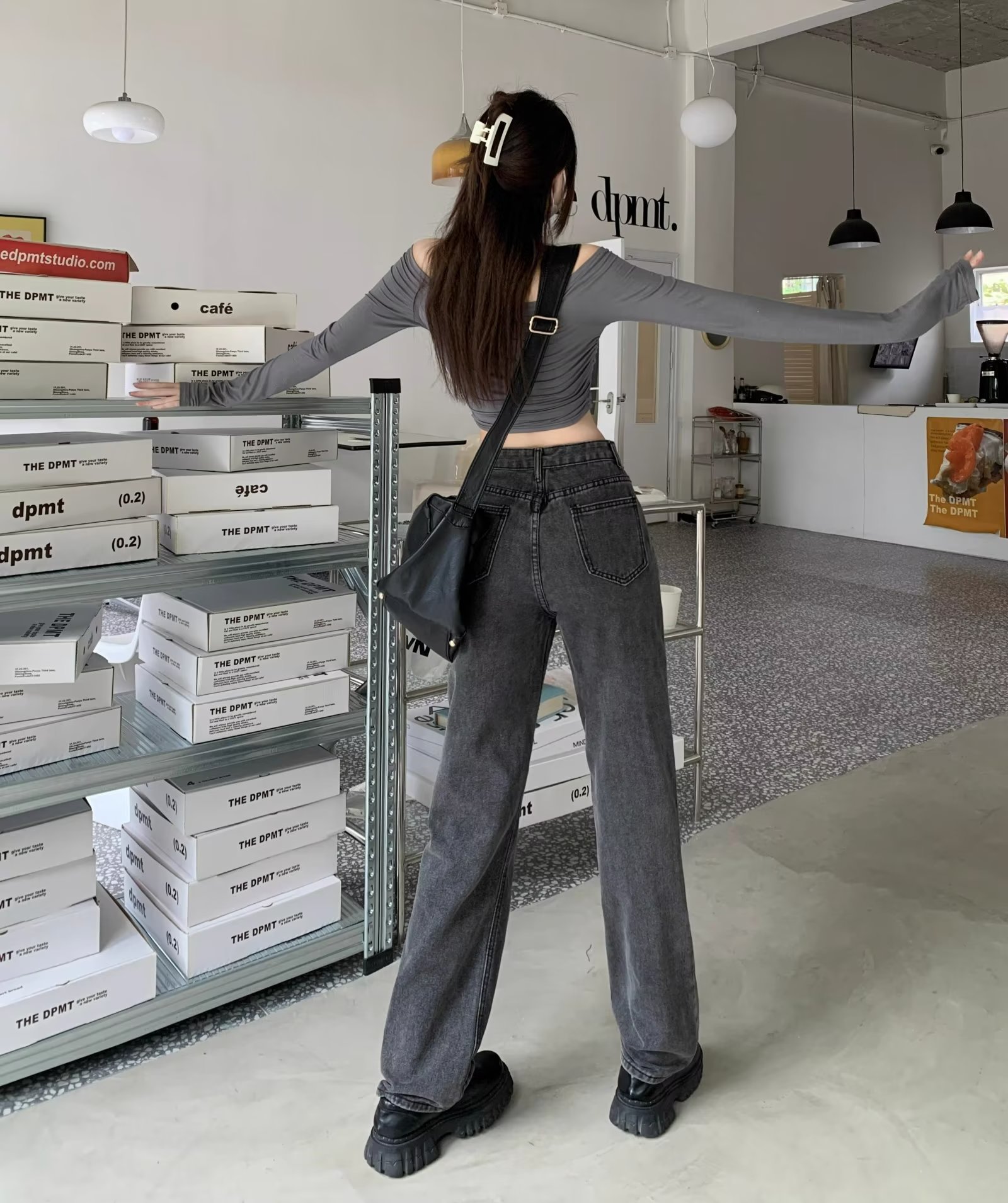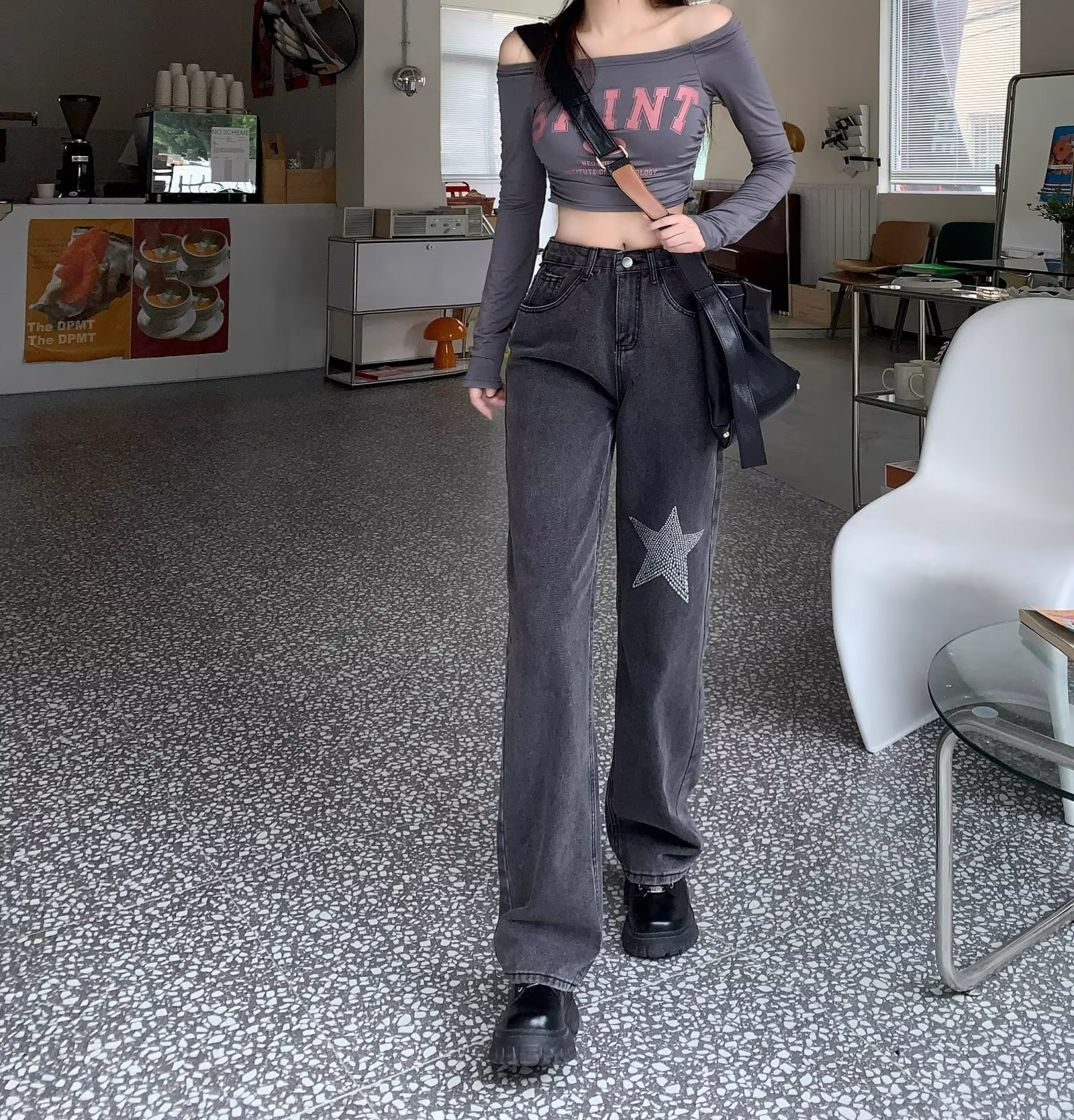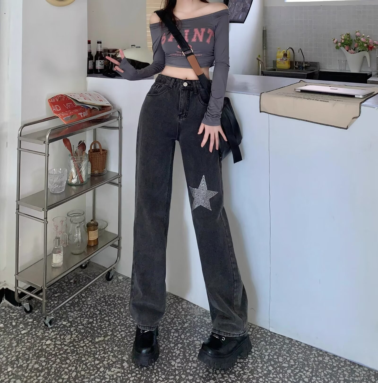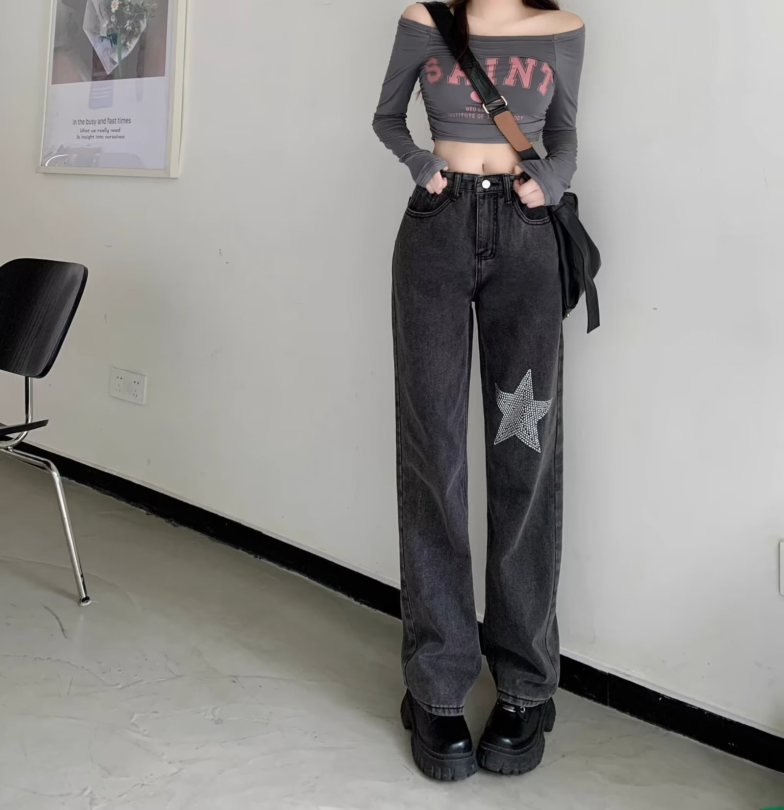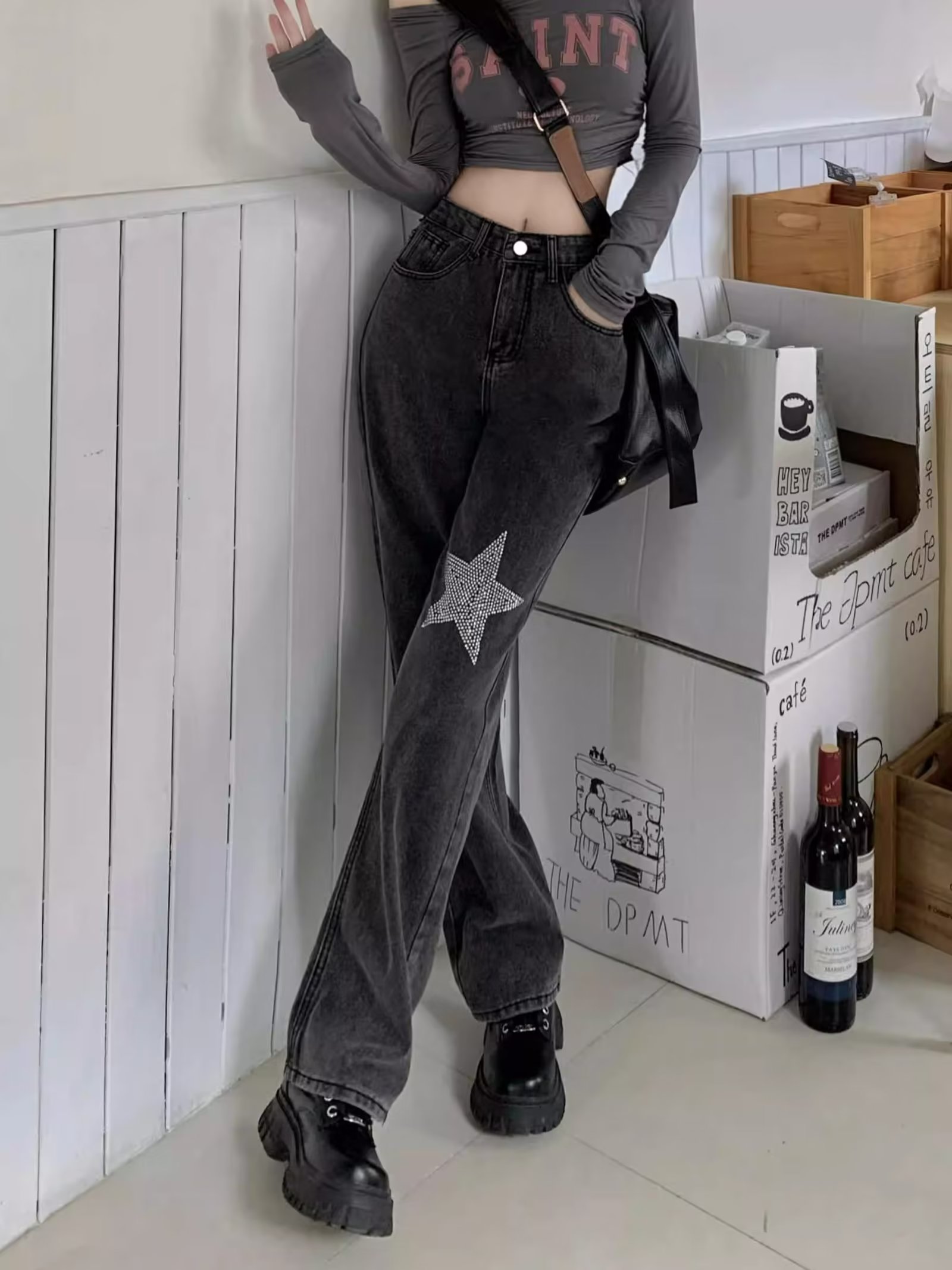 RM33403#ins超火烫钻星星设计感牛仔长裤女oversize新款高腰直筒阔腿裤
