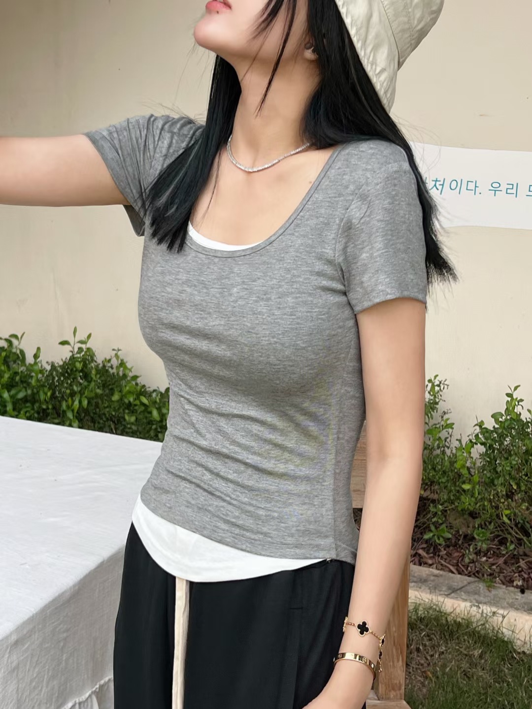 RY2714#春夏新款M.I.C假两件拼色上衣设计感修身短袖T恤女短款打底衫