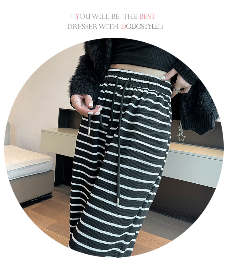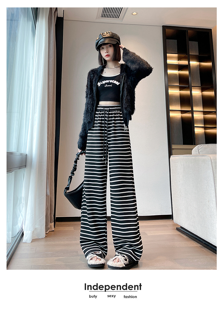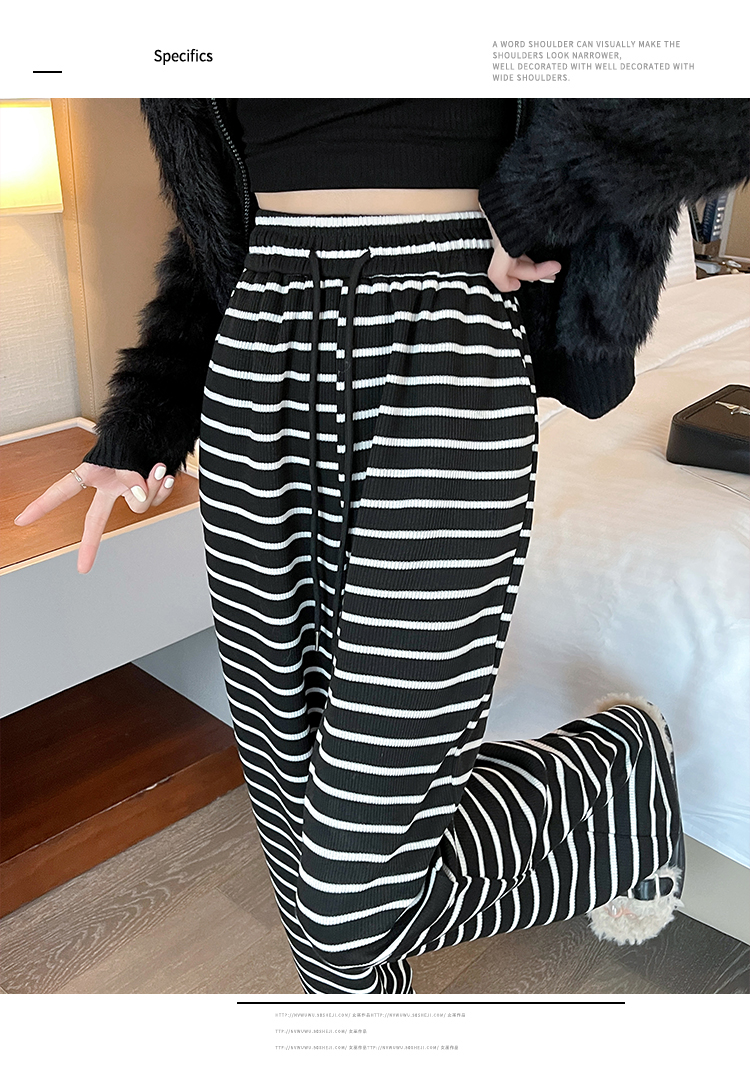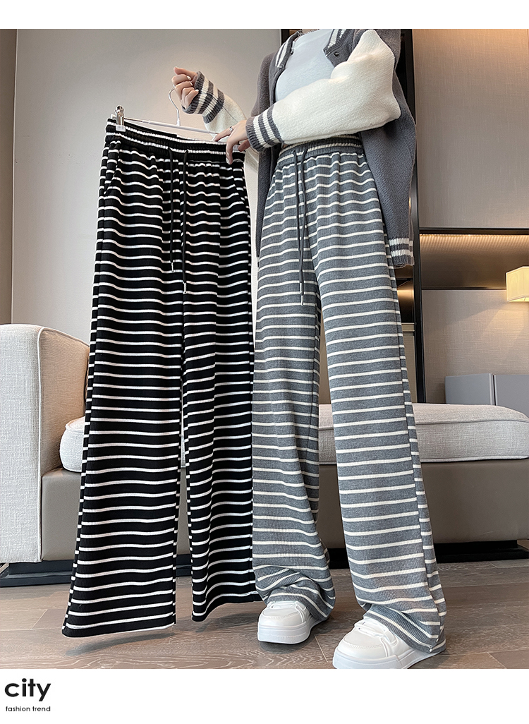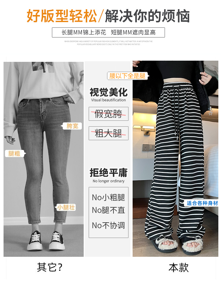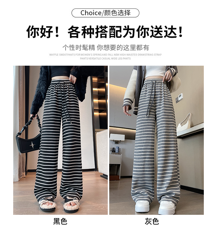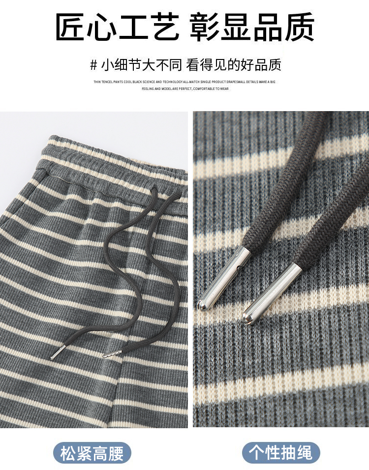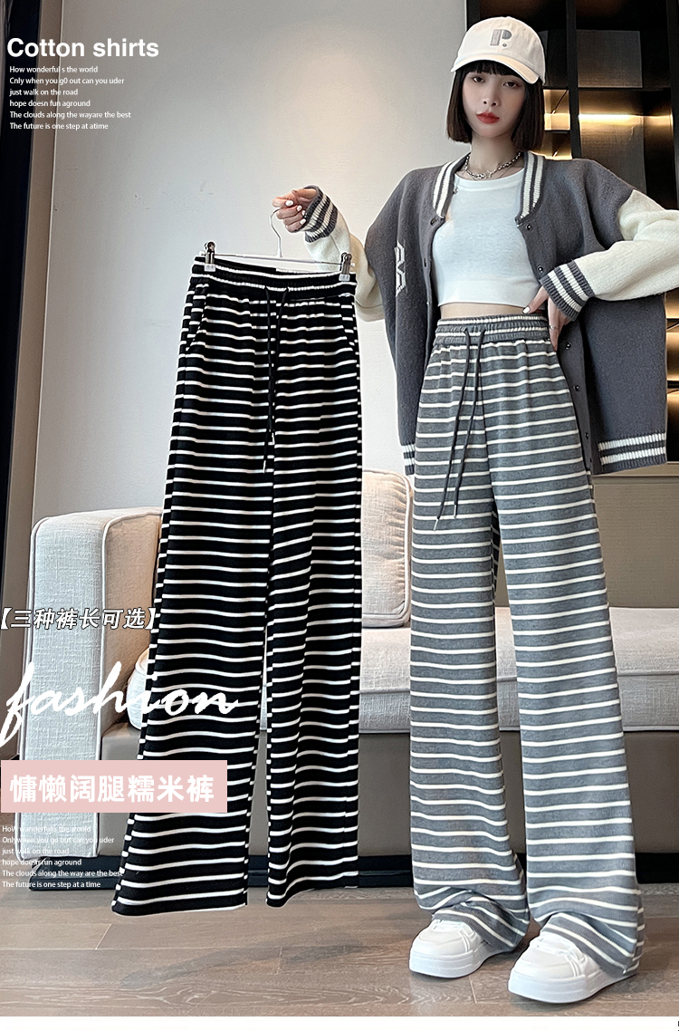 RM33568#时尚宽松百搭条纹松紧高腰休闲裤 新款韩版阔腿长裤