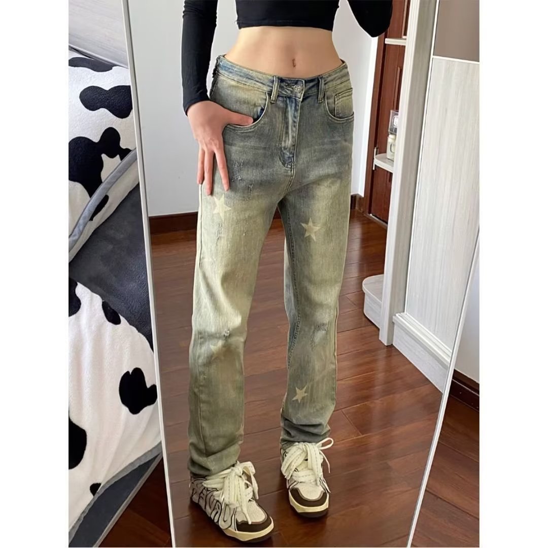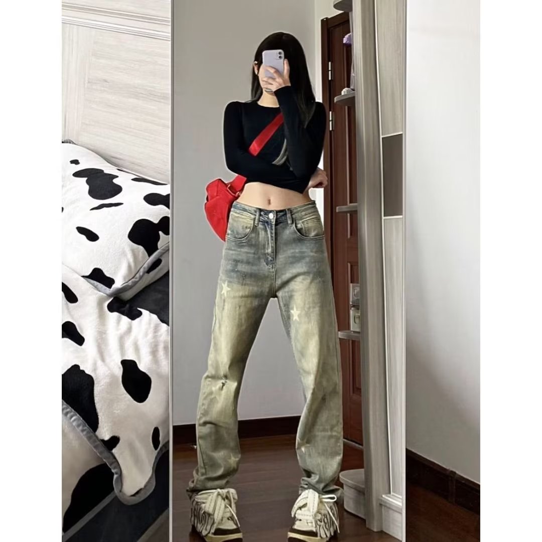 RM33915#纽扣做旧新款浅色自然腰九分裤潮流牛仔裤女简约气质直筒裤