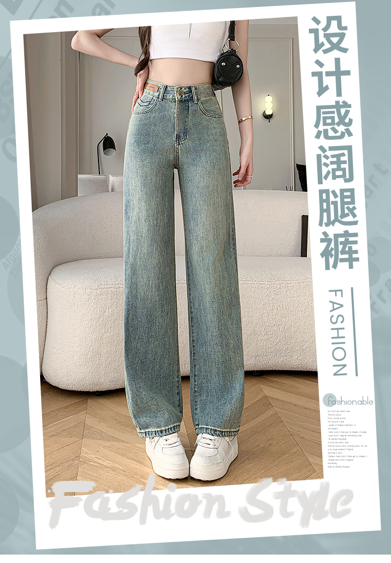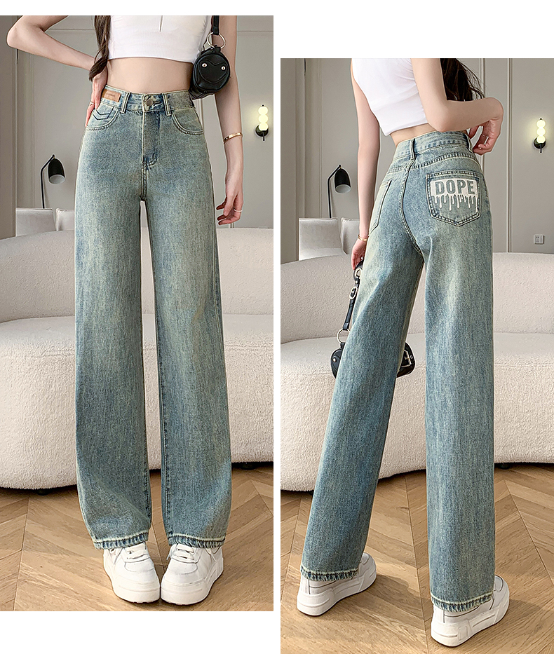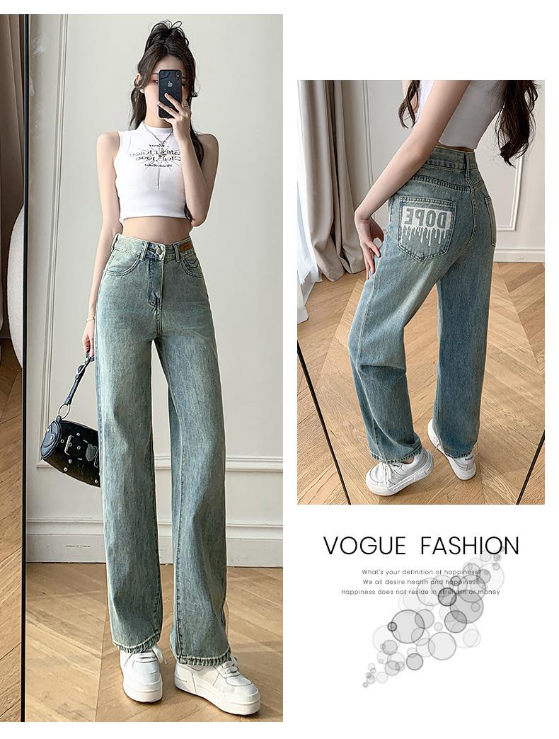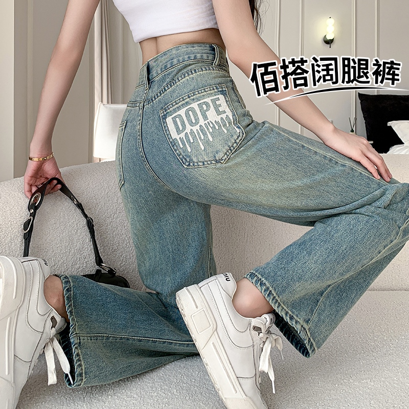 RM34012#窄版印花牛仔直筒牛仔裤 新款港风高腰宽松烟管阔腿裤