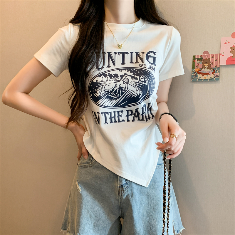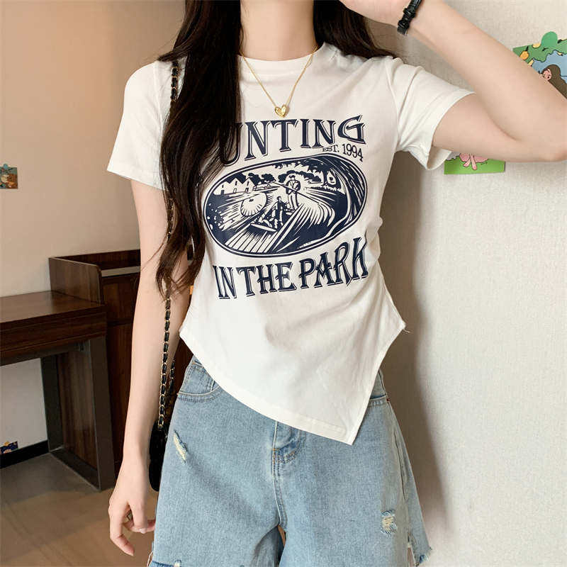 PF14#夏日多巴胺T恤女不规则绝美穿搭美式复古印花短袖正肩上衣