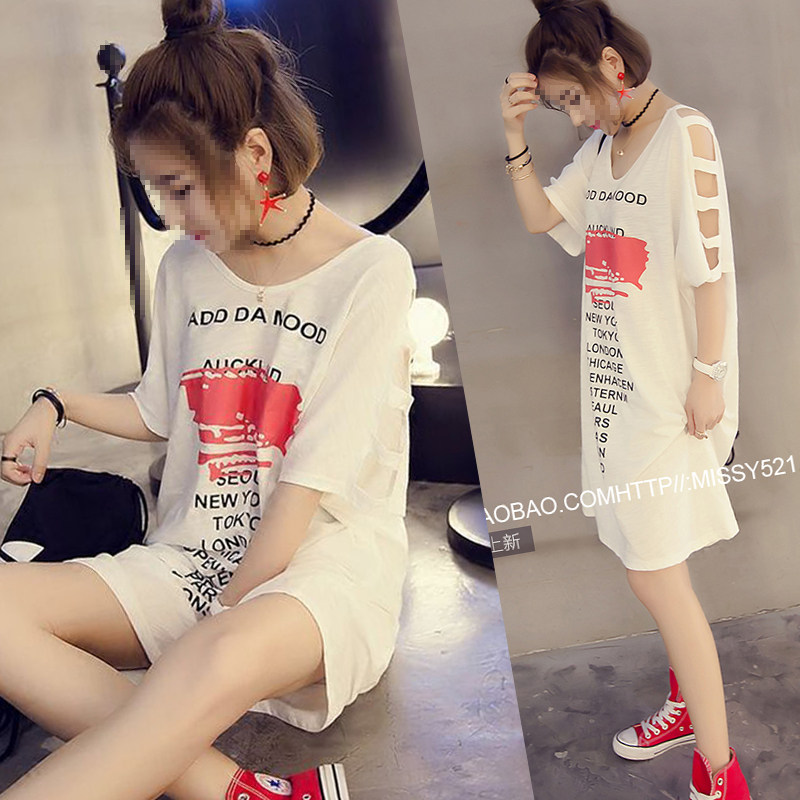 PF21#漏肩膀漏背印花T恤女短袖中长款胖MM200斤大码女装