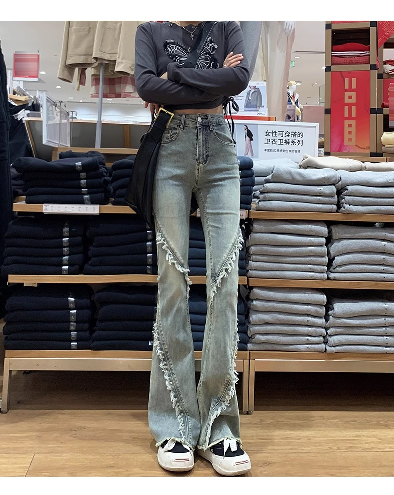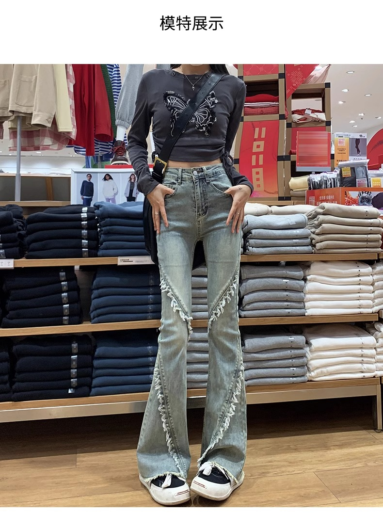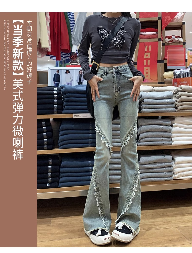 PF51#毛边微喇牛仔裤女春季新款美式复古高腰显瘦弹力百搭喇叭马蹄裤子