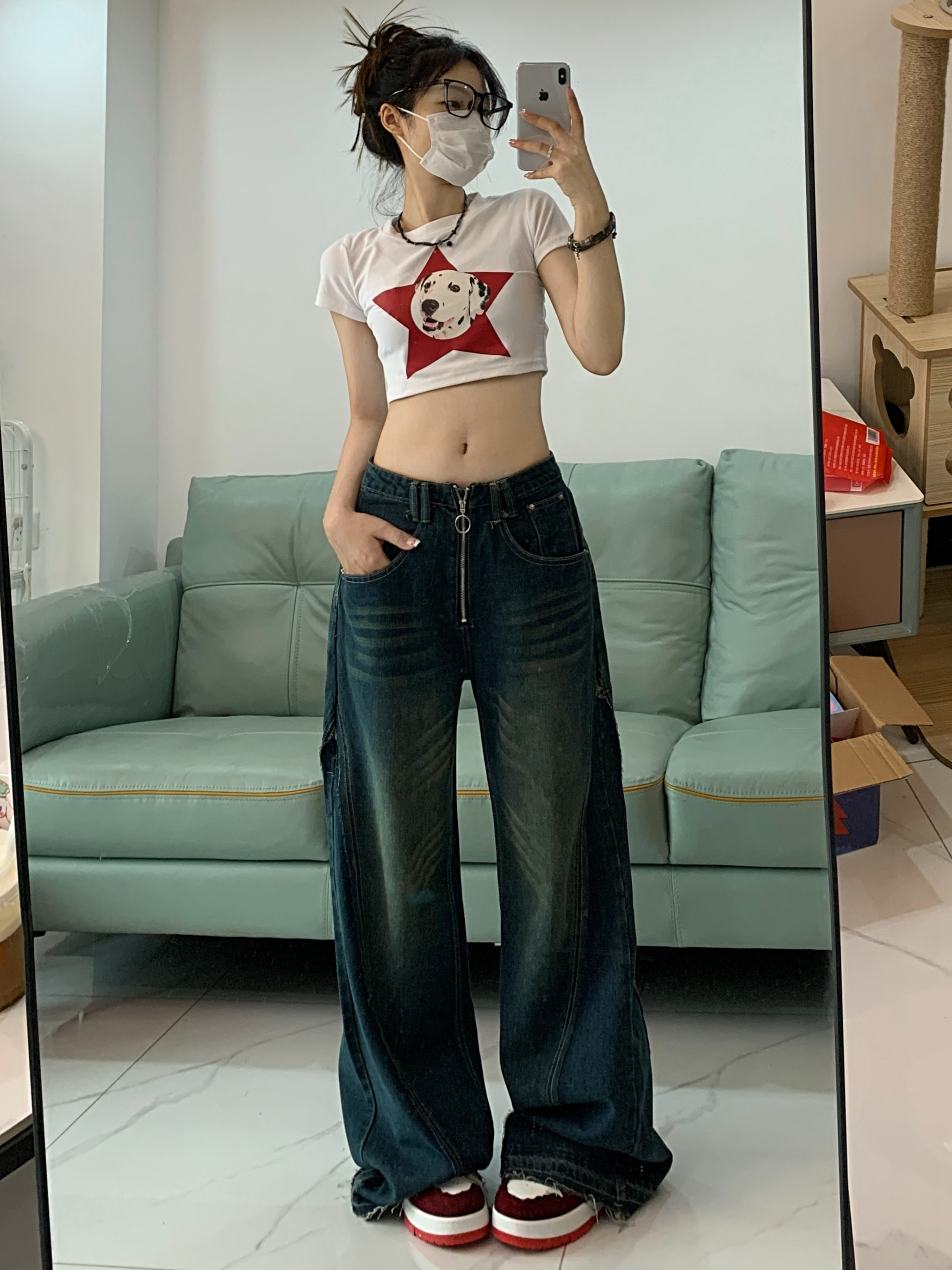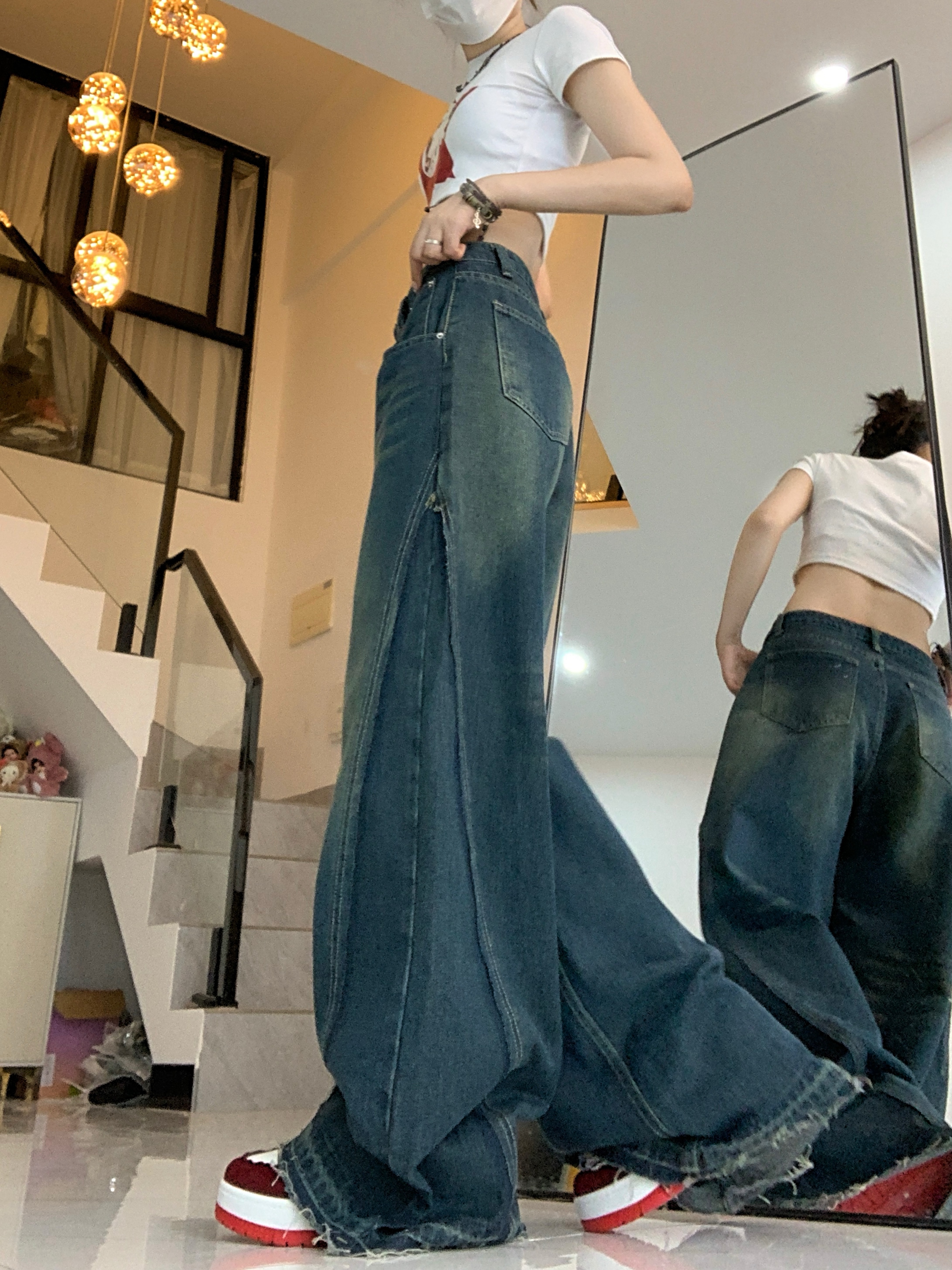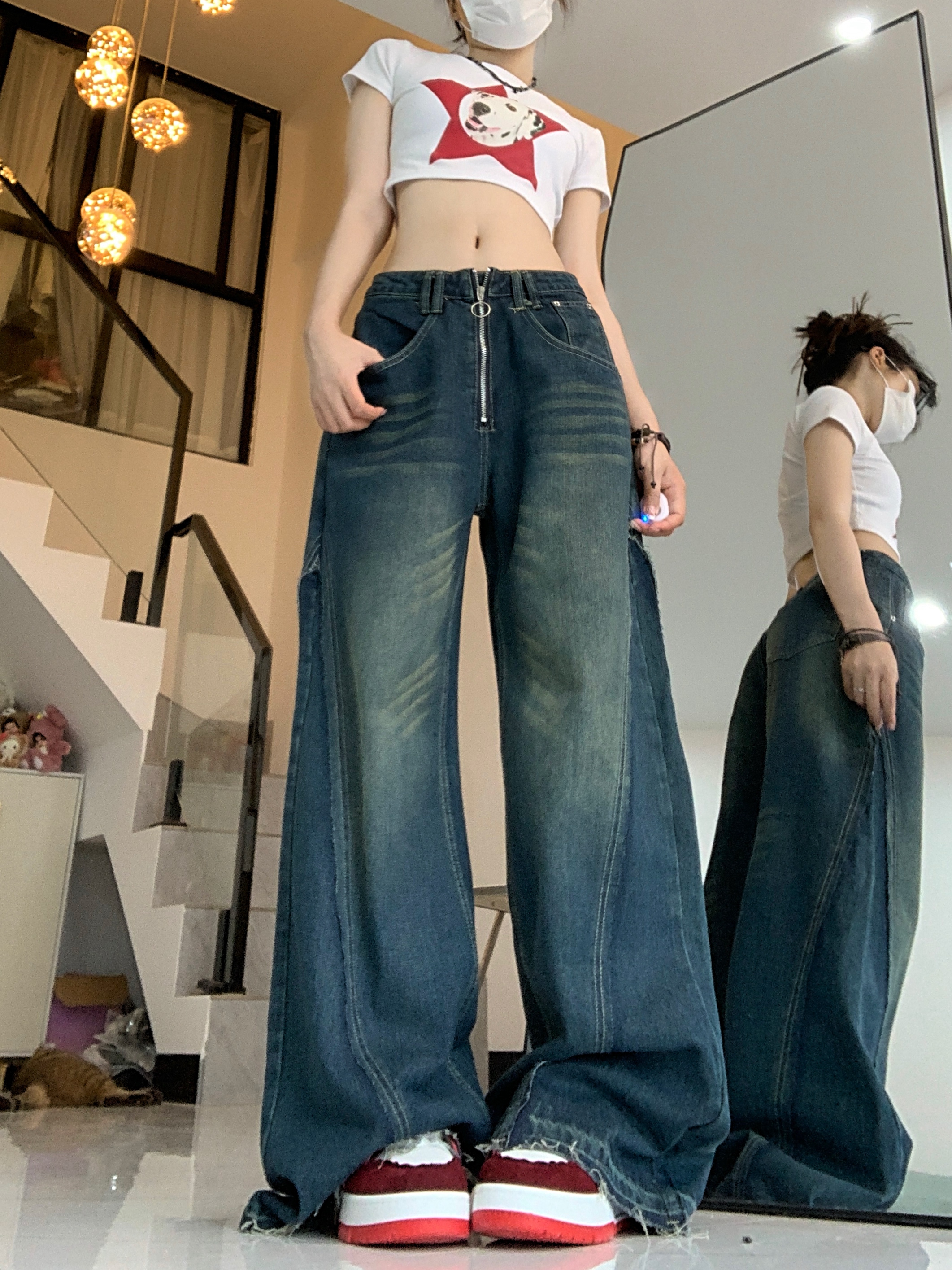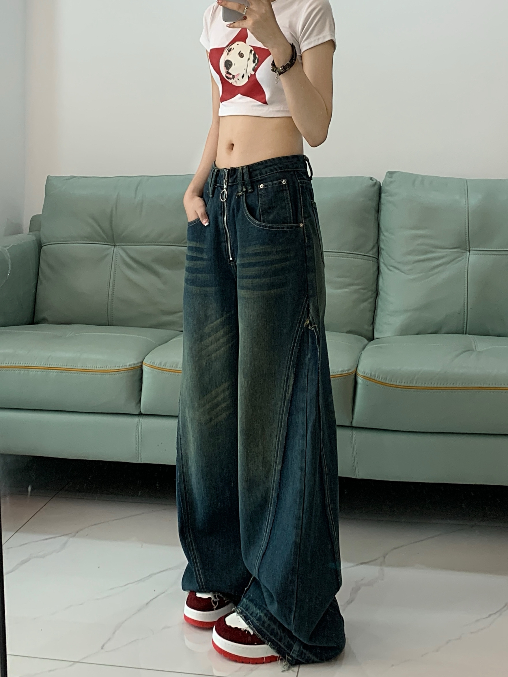 PF74#深蓝色牛仔阔腿裤女新款设计感拉链高腰垂感拖地长裤