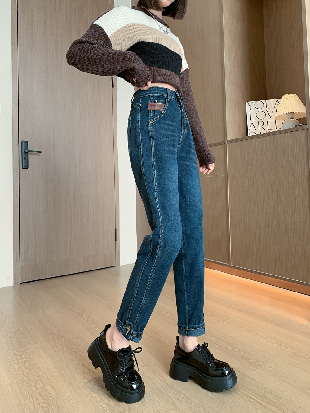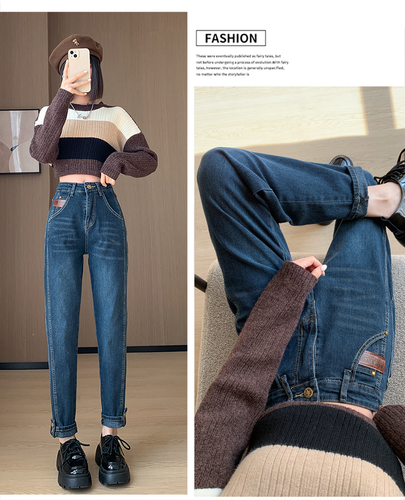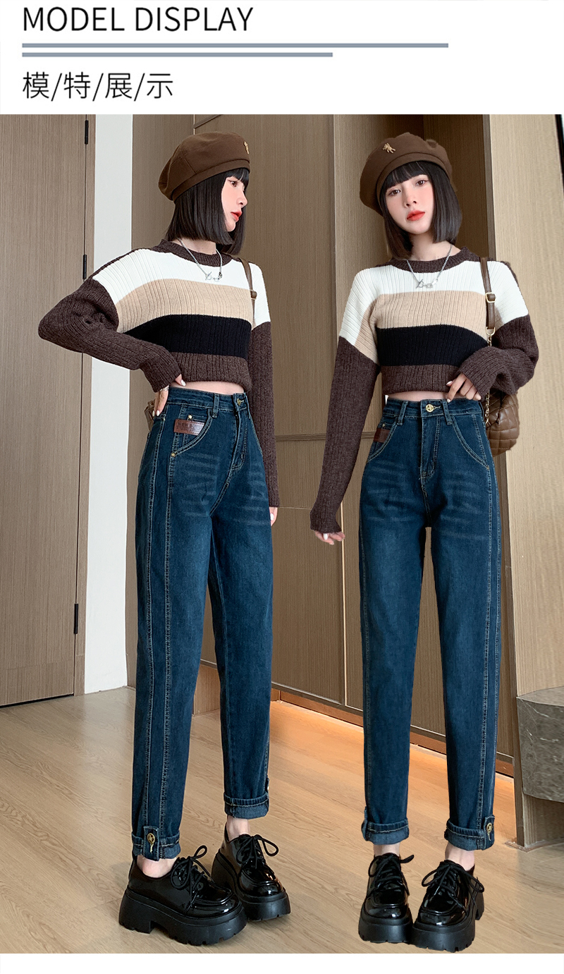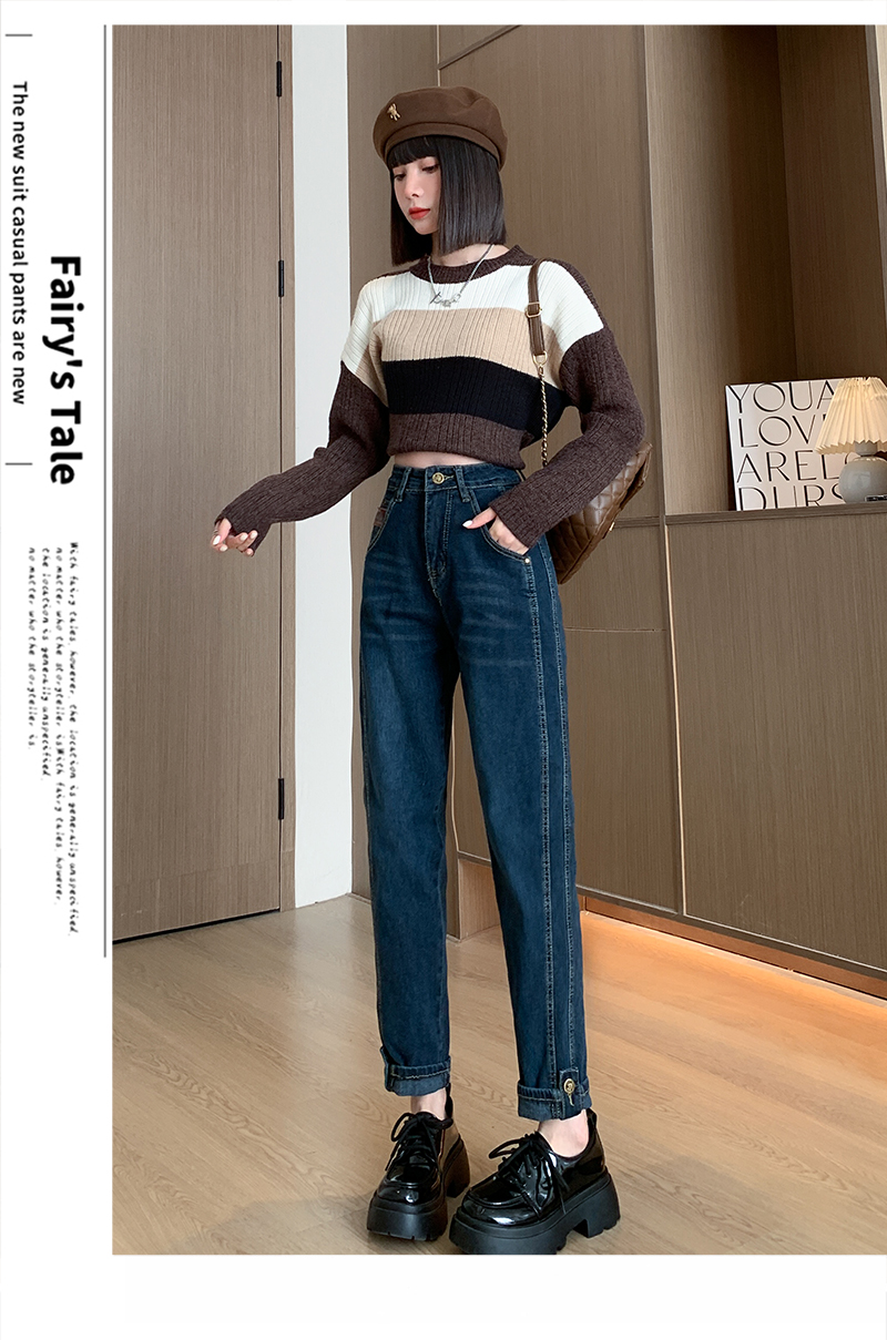 PF91#新款卷边高腰哈伦裤女小众宽松显瘦九分直筒老爹裤ins