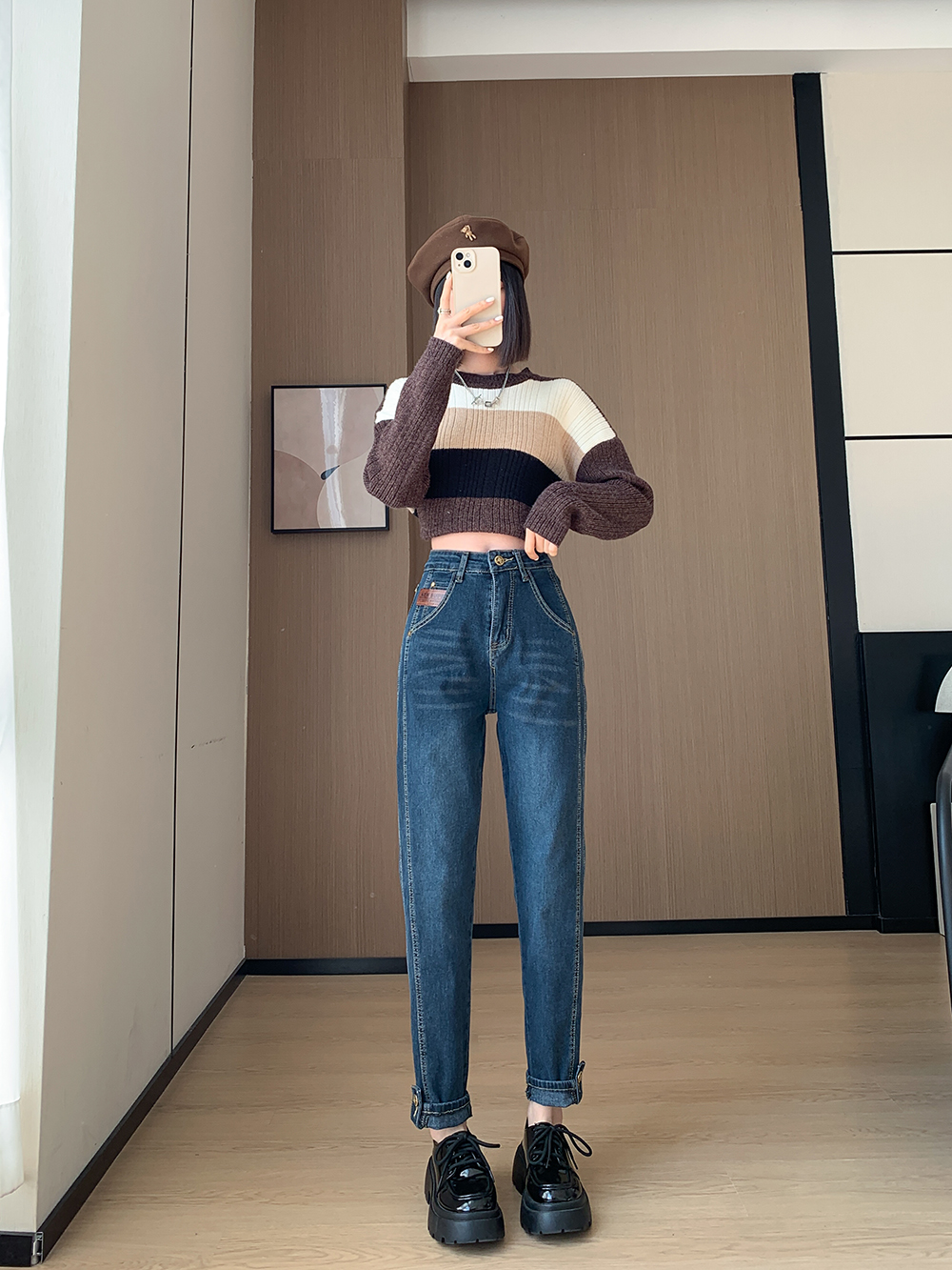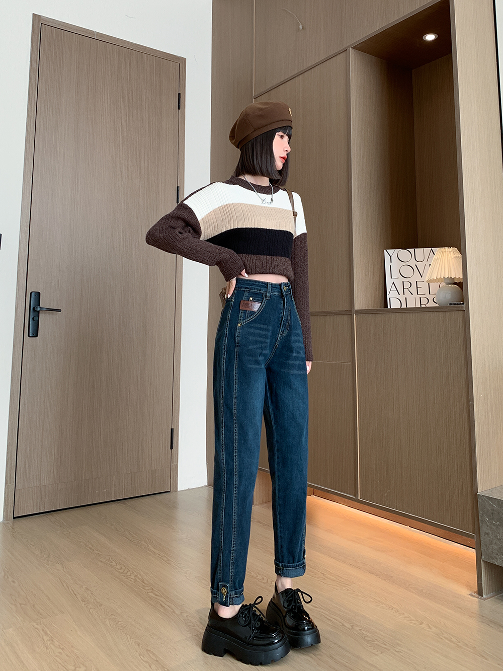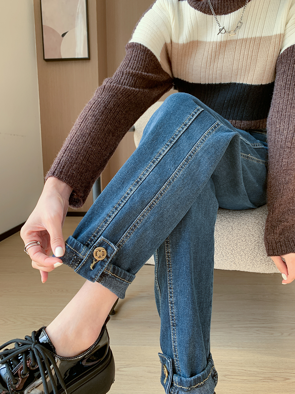 PF91#新款卷边高腰哈伦裤女小众宽松显瘦九分直筒老爹裤ins