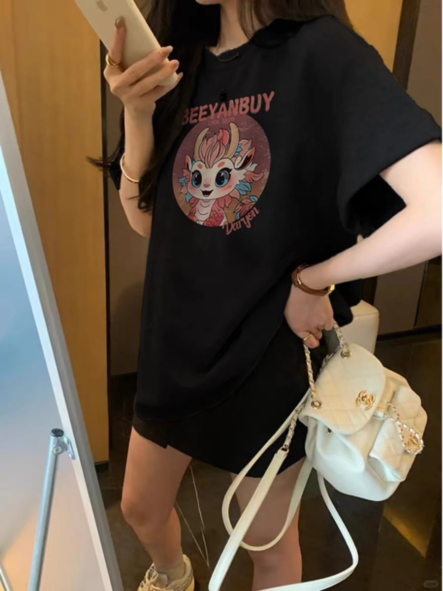 PF204#潮牌黑色正肩短袖t恤女2024新款夏季设计感小众宽松美式半袖上衣