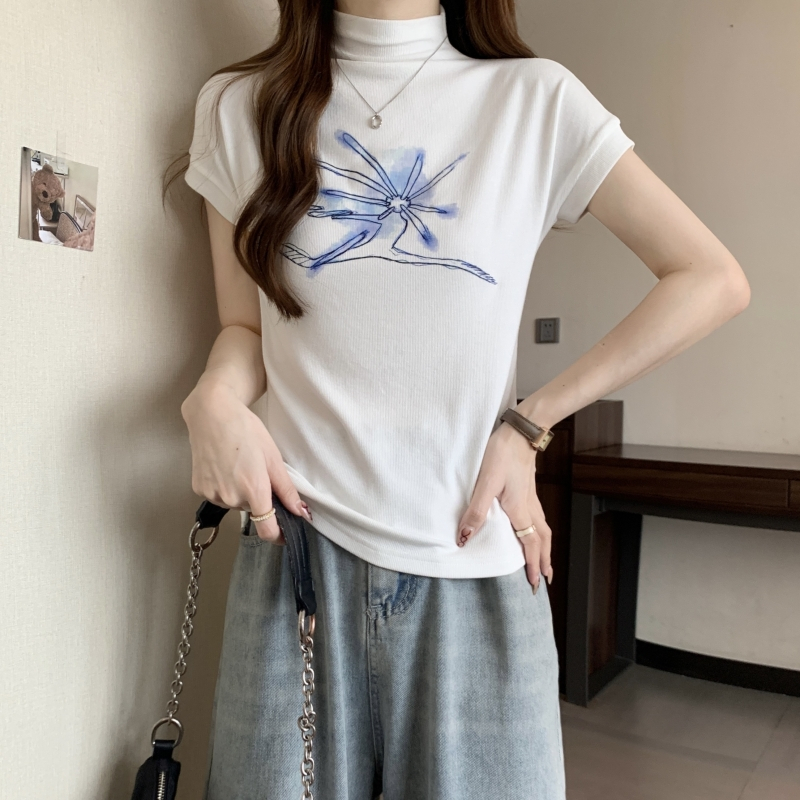 PF211# 40支纯棉 2024夏装 印花半高领打底女短袖T恤